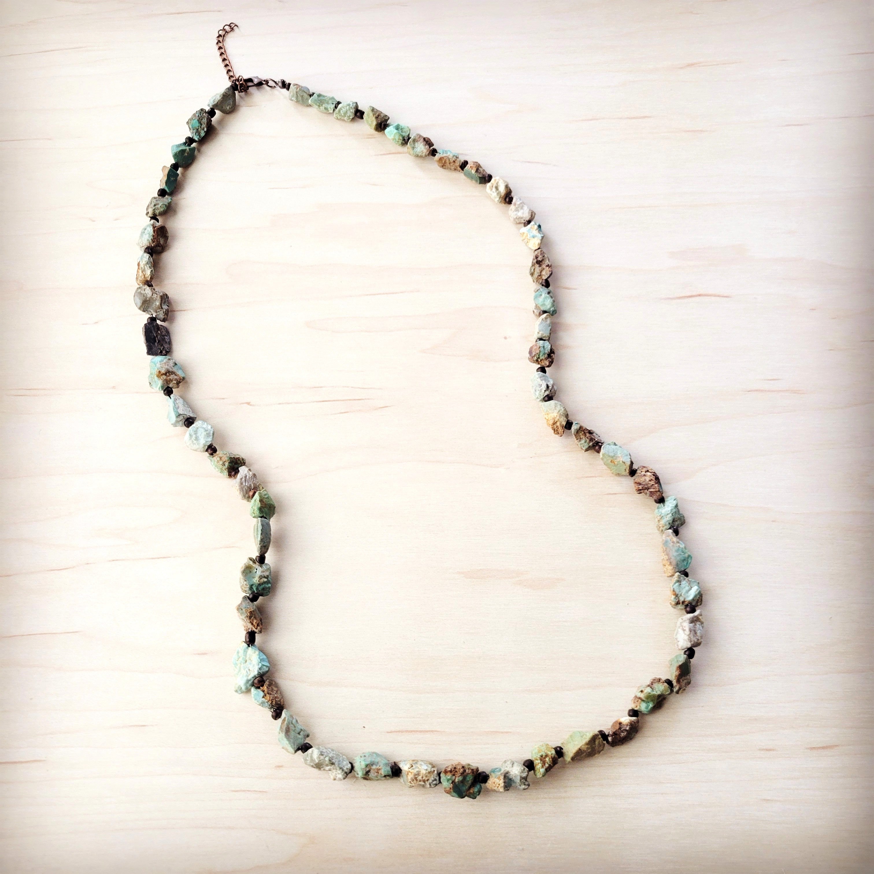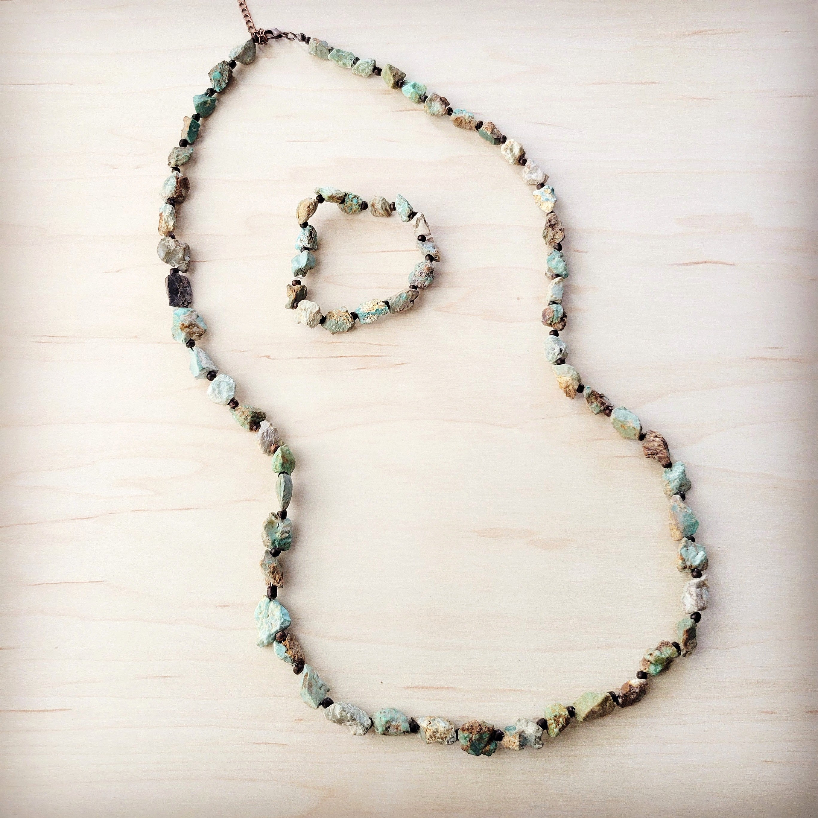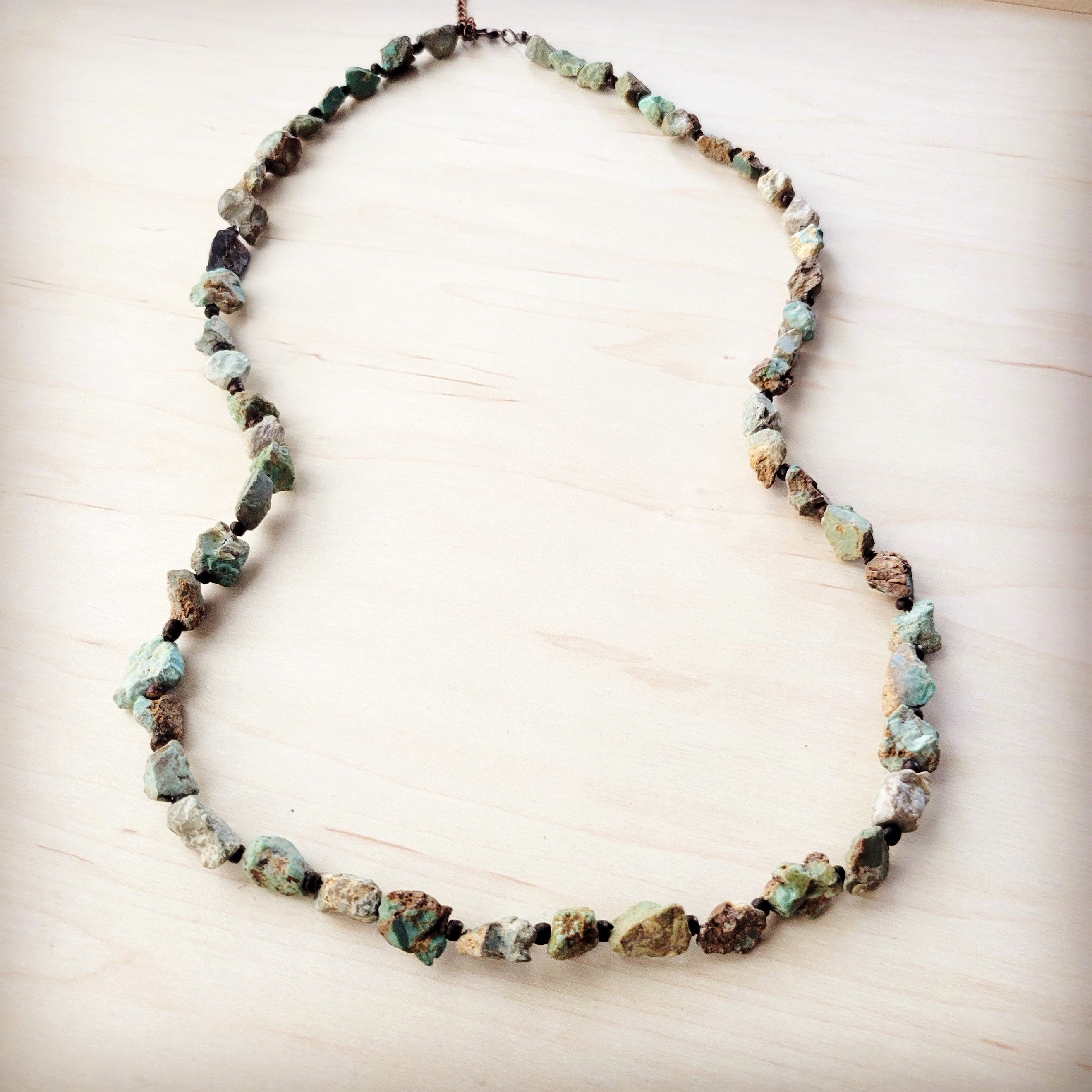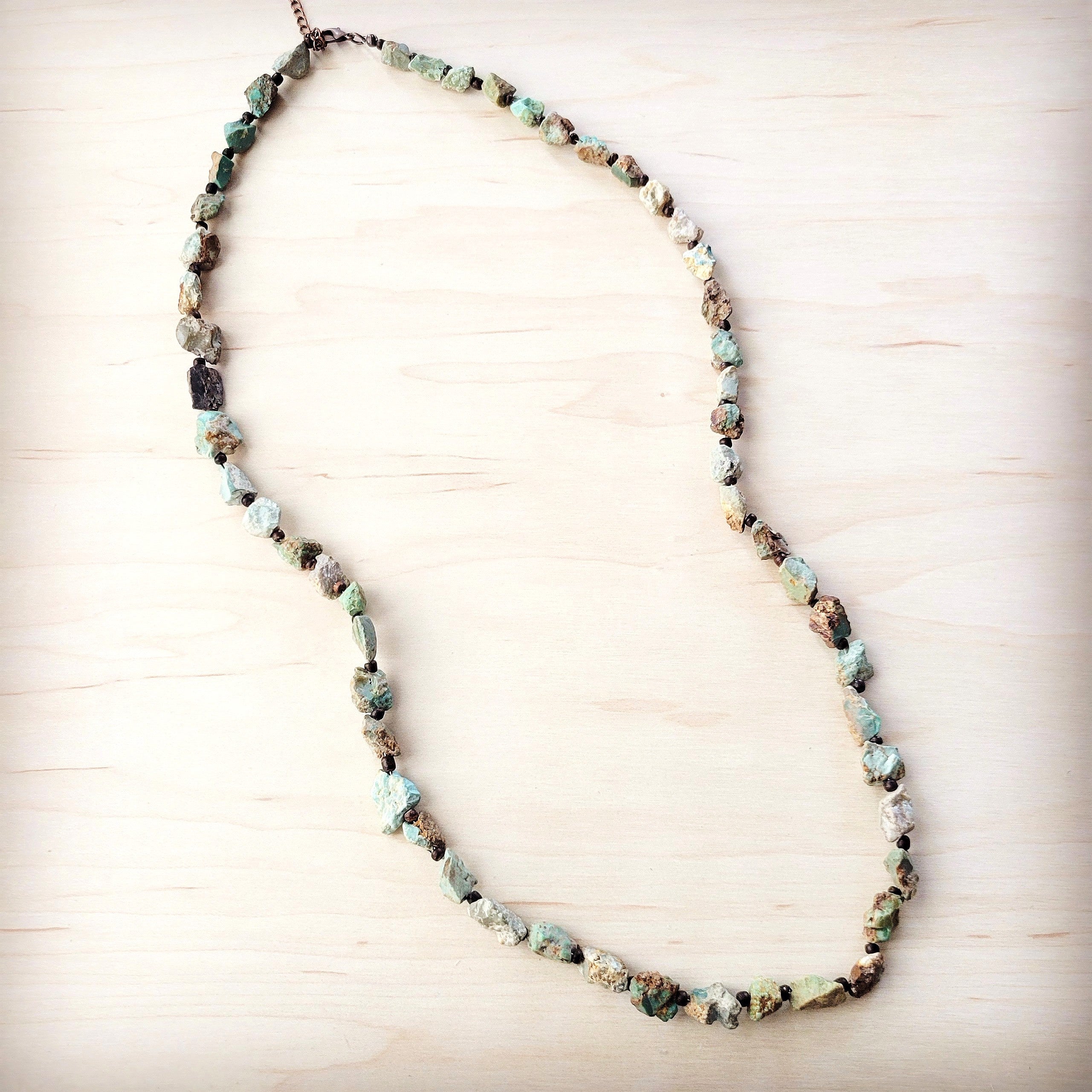 Experience the rustic beauty of our Genuine Long HuBei Natural Turquoise and Wood Layering Necklace. Handcrafted by skilled artisans, this boho-inspired piece exudes western charm. Elevate your style with the earthy tones of turquoise and wood, making this necklace a unique addition to your wardrobe.