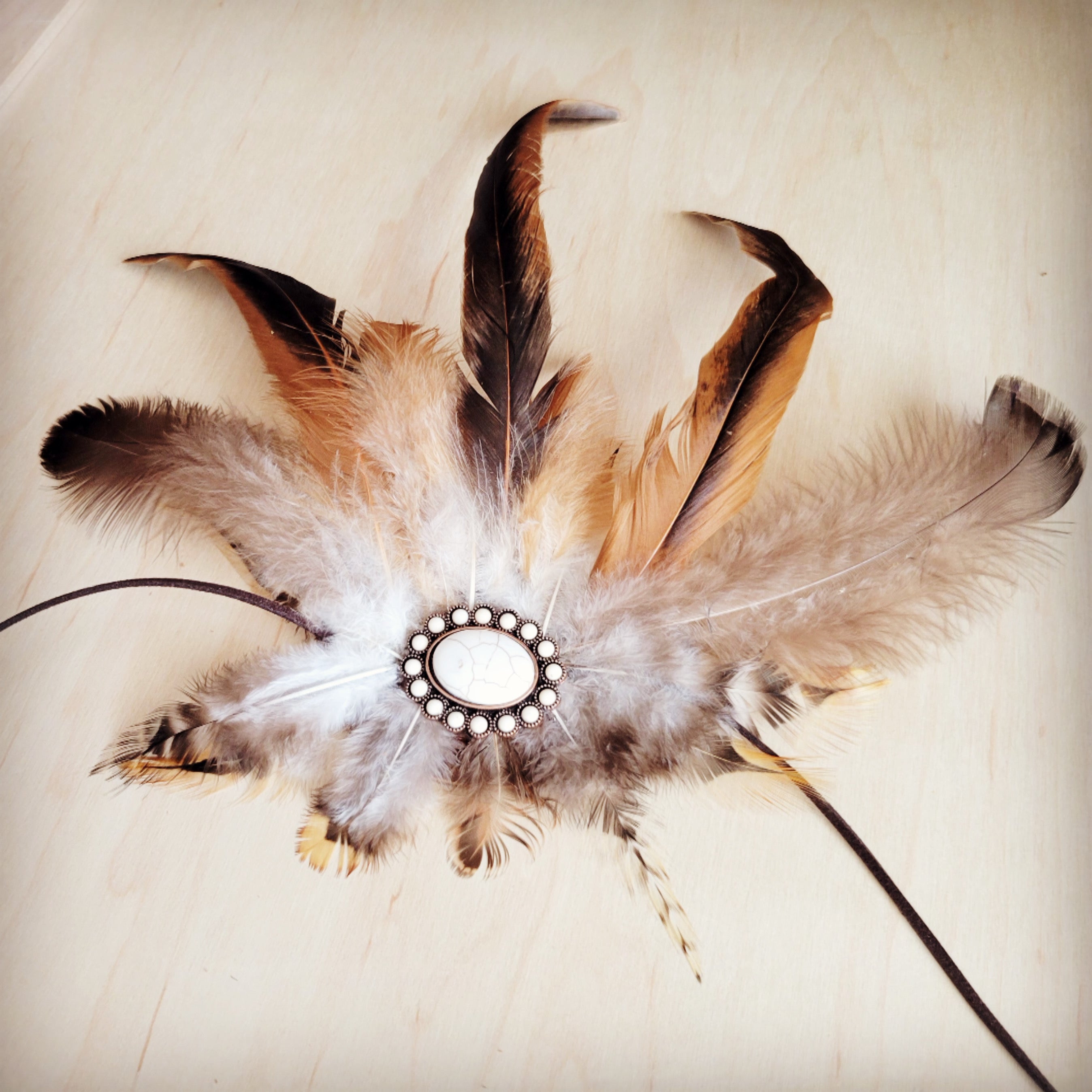 • *Please note, smaller feathers will be assorted and will match as closely to the photo as possible, but will not be identical.  The primary piece of turquoise (color) and base leather piece will not change.