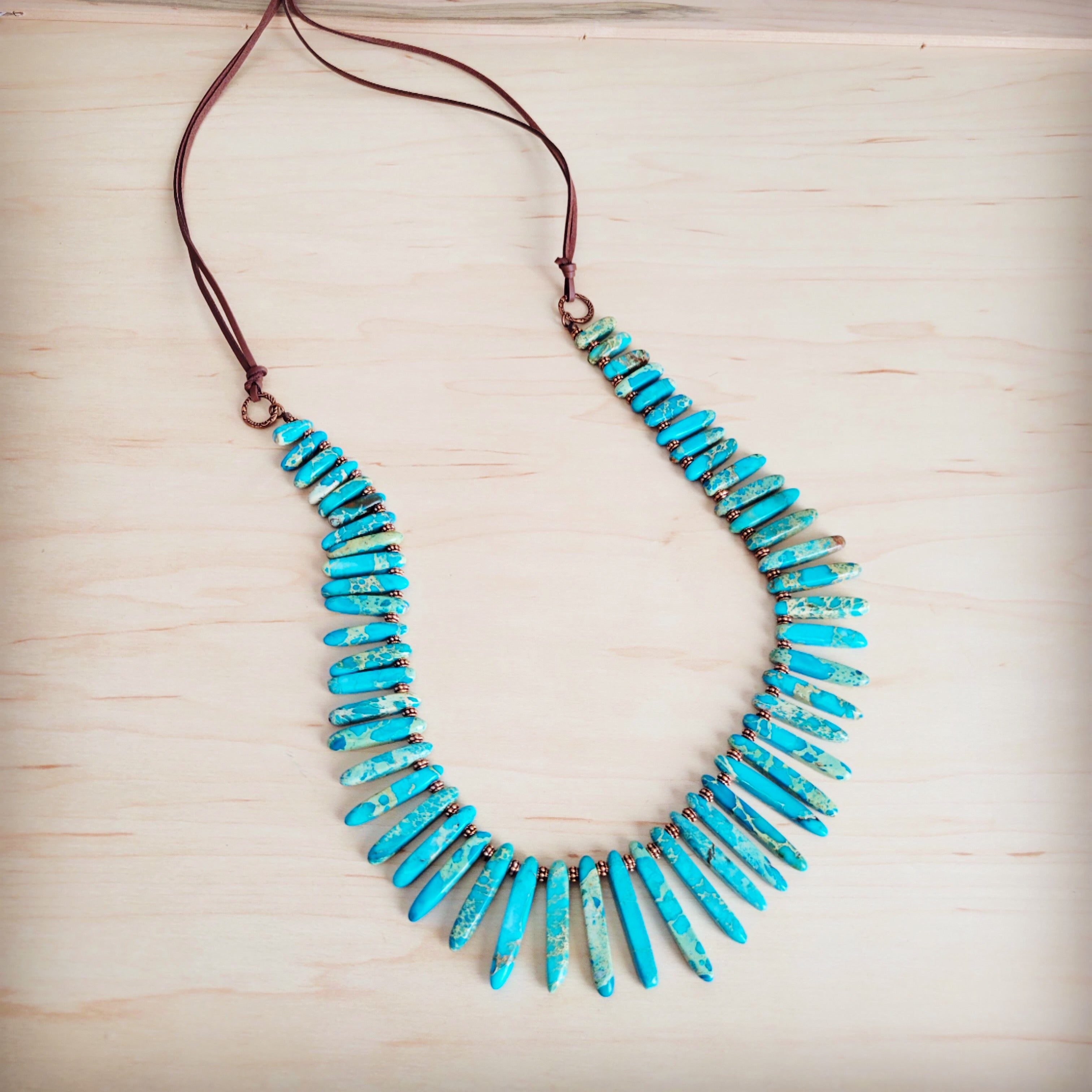 Although much of the turquoise we use comes from Africa, all of our artisan pieces are handmade right here in Texas, meaning that no two are ever alike. African turquoise is said to bring about great change and transformation in whoever is lucky enough to wear it. It also resonates with the Third Eye, leading to greater wisdom. Many of our handcrafted turquoise jewelry items are complemented with copper — a classic pairing that creates a bohemian look. Browse our collection now to find your new favorite necklace, bracelet, or another piece of jewelry.