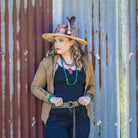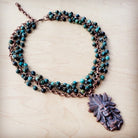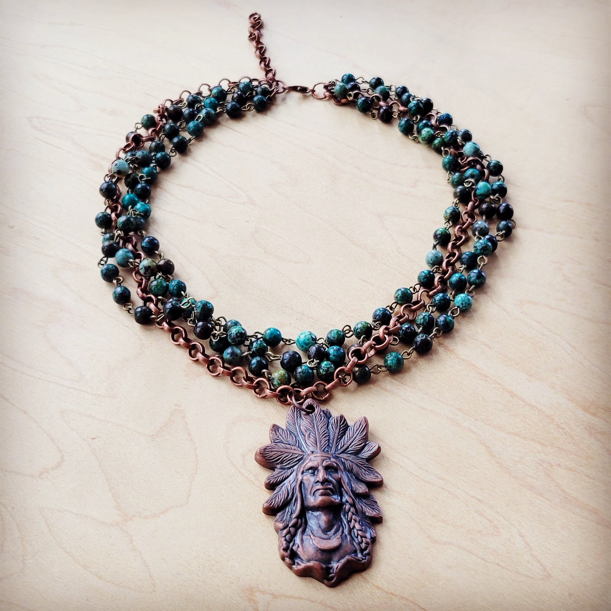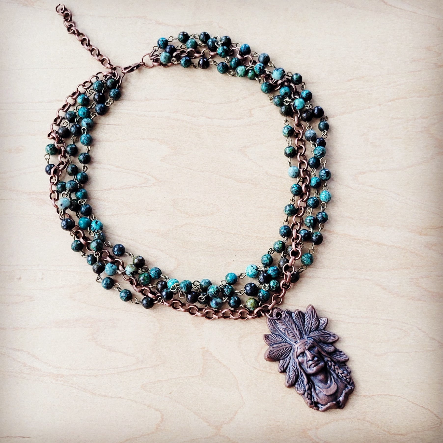Infuse your style with boho and western flair with our handmade African Turquoise necklace. Crafted in the USA, this collar-length statement piece features an Indian head coin for added character. Express your passion for unique fashion with this one-of-a-kind necklace.