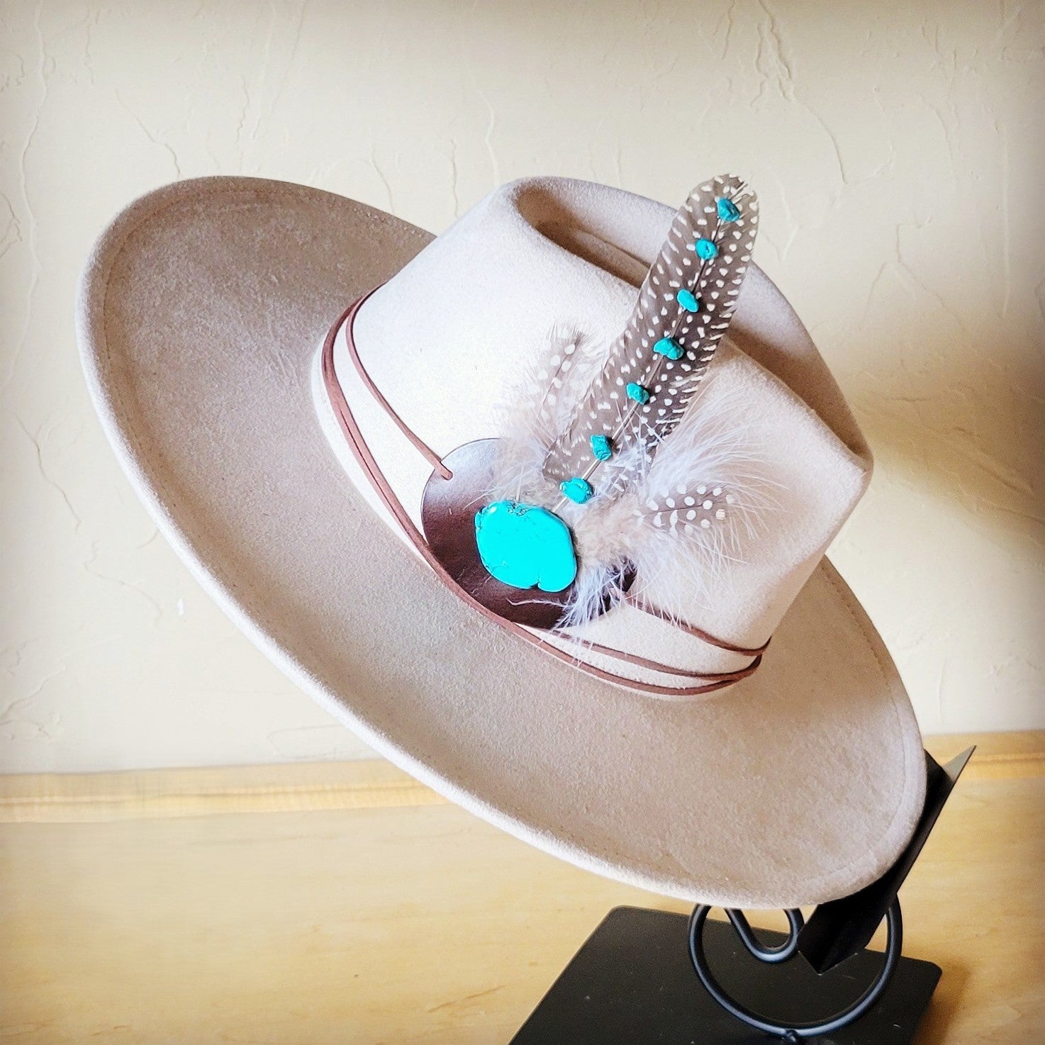 - *Please note, smaller feathers will be assorted and will match as closely to the photo as possible, but will not be identical. The primary piece of turquoise (color) and base leather piece will not change.