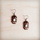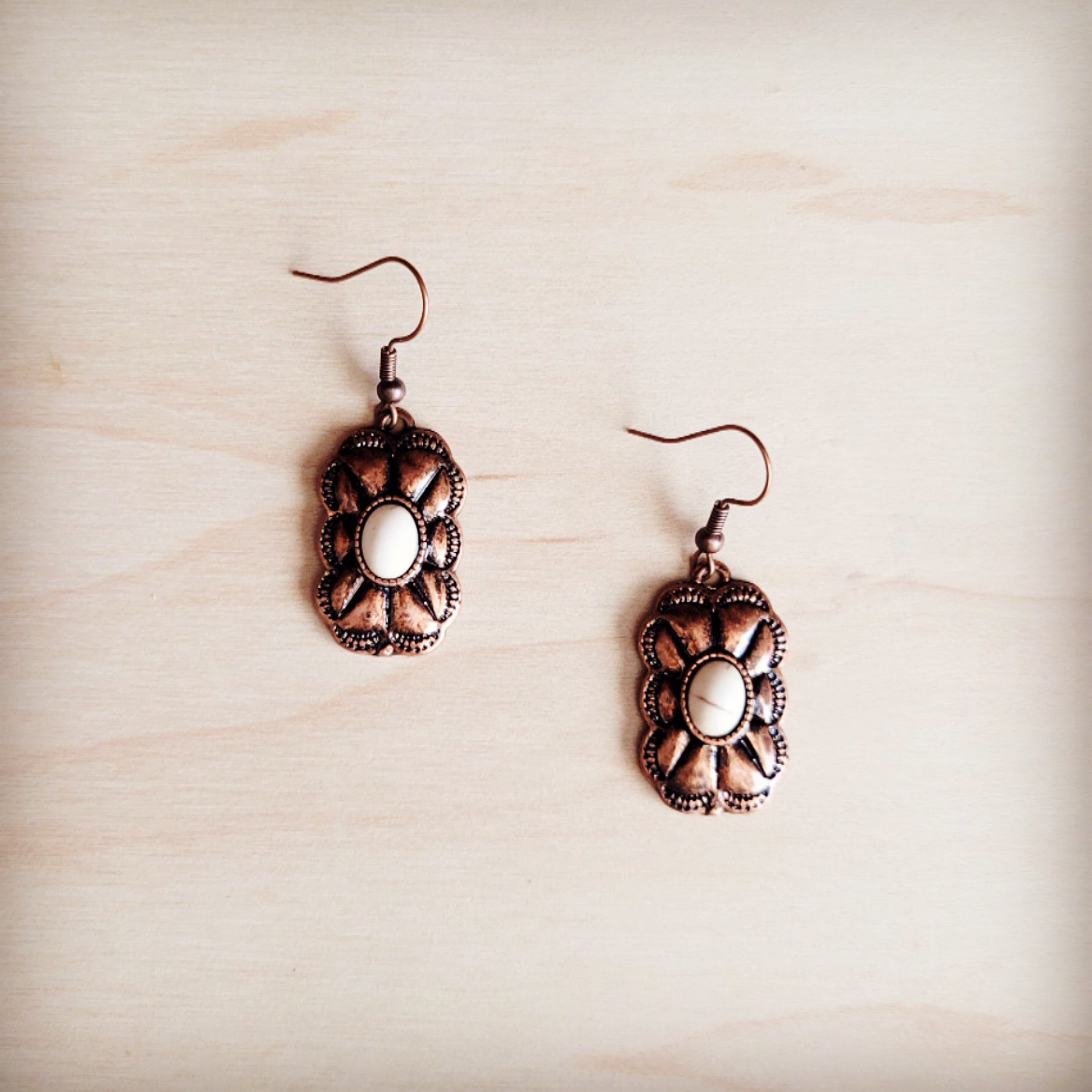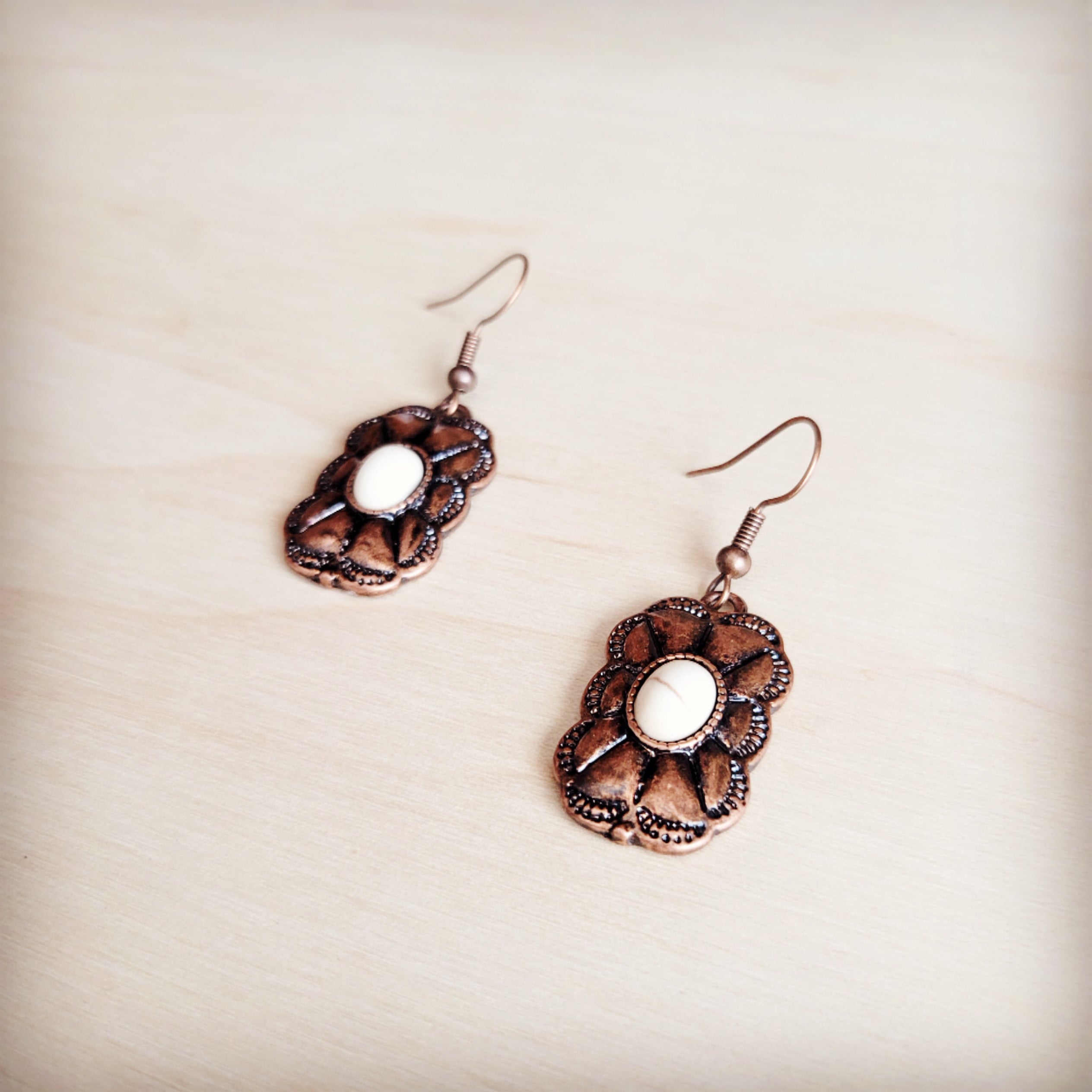 These elegant earrings feature an antiqued copper-tone metal setting with intricate embossed detailing, centered with a smooth, oval white stone. The classic drop design offers a refined touch of Southwestern flair for daily wear or a night out.