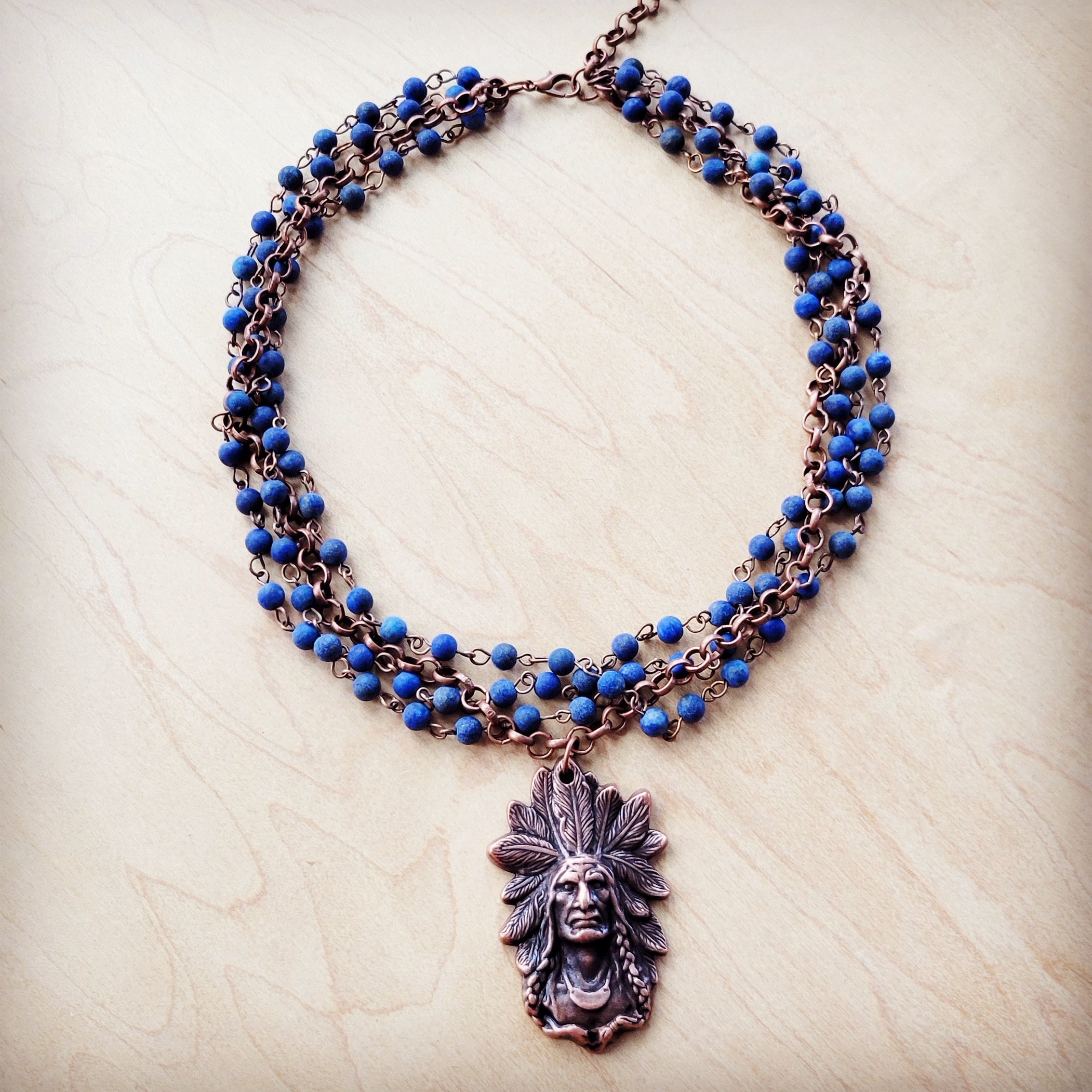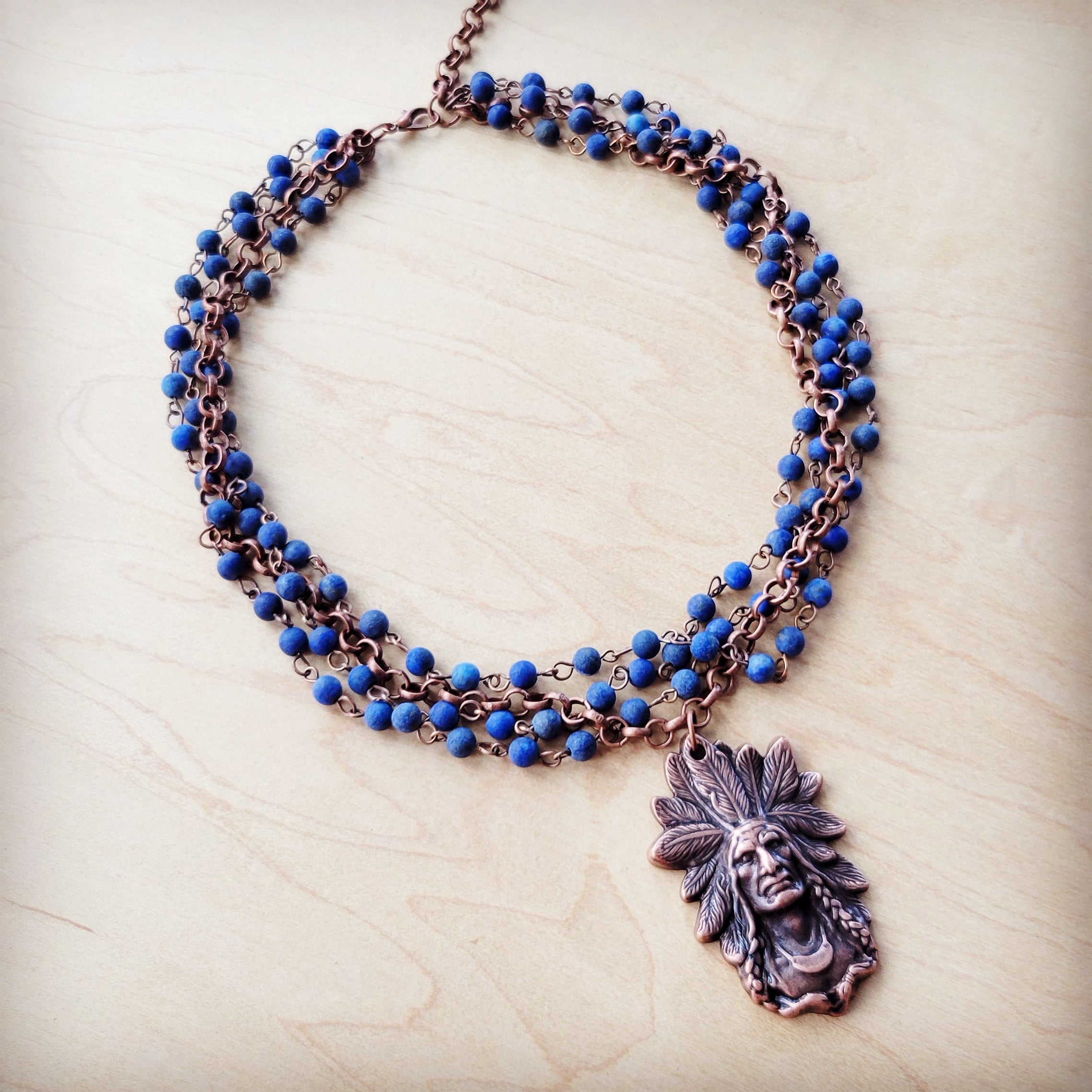 Blue Lapis Beaded Collar Necklace w/ Indian Pendant 260r