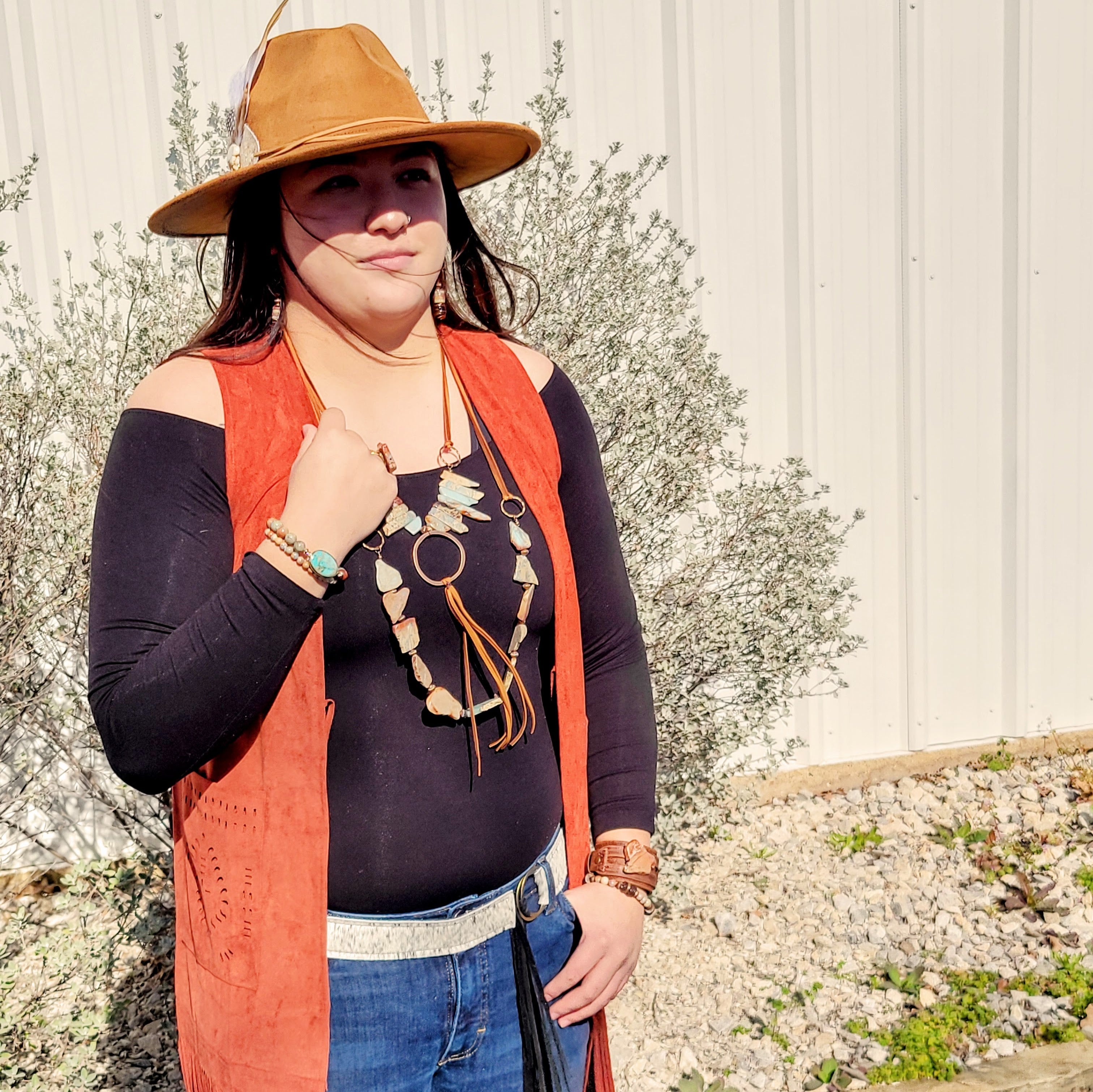 Add a touch of bohemian charm to your outfit with our Aqua Terra Chunky Necklace. This unique piece features aqua terra slab stones, adding a touch of natural beauty, and a long leather tassel for a western-inspired touch. Elevate your style with this statement necklace.