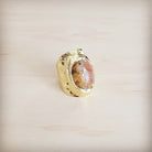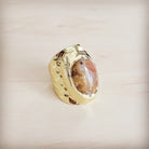 This exquisite, wide-band gold cuff ring features a large, organically shaped stone with a distinctive, mesmerizing pattern of warm coral and earthen tones. Set in a textured, polished gold frame, this piece is an elegant statement that beautifully highlights the unique, natural artistry of the stone.