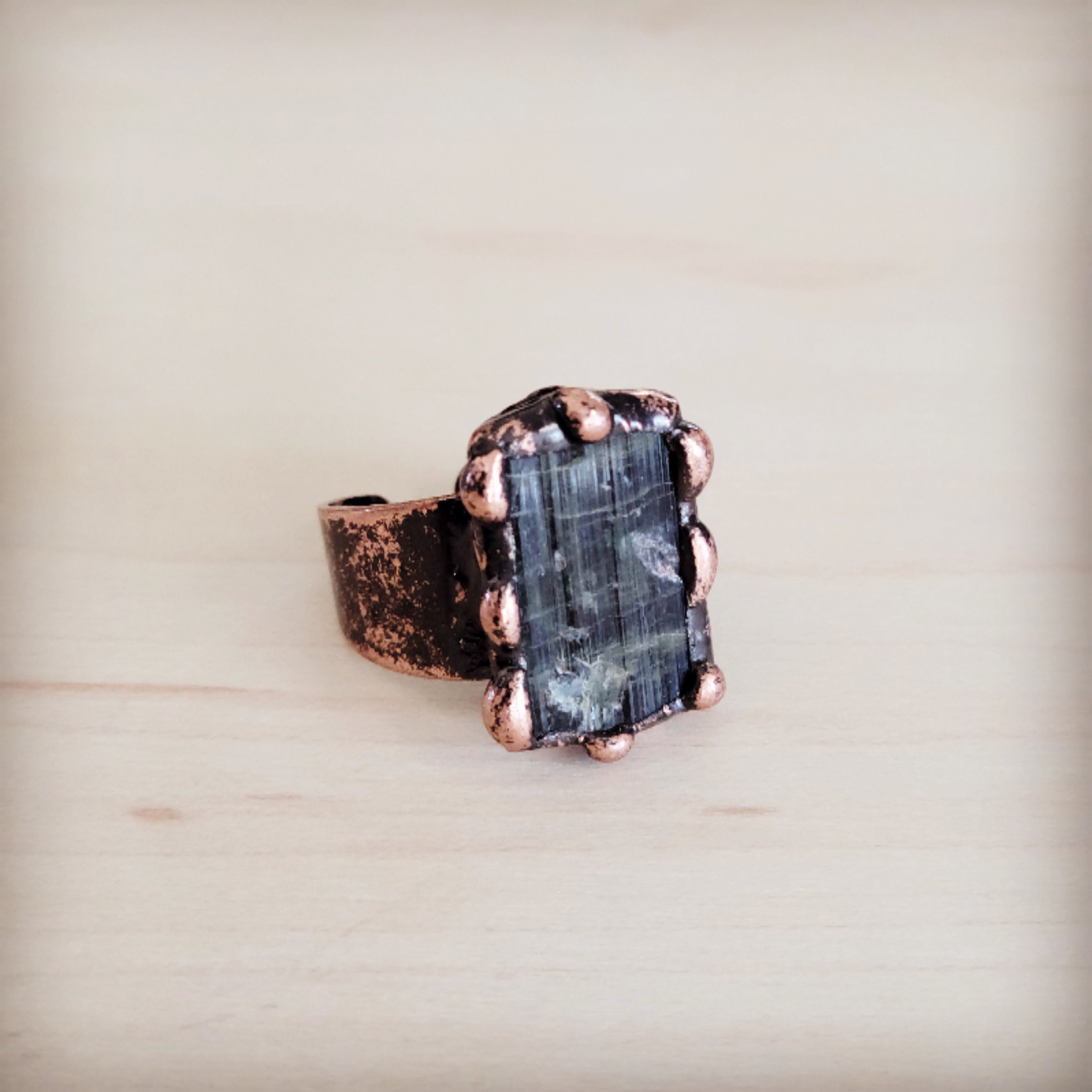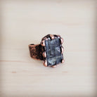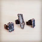 Embrace the artistry of nature with these adjustable copper cuff rings, each showcasing a long, unique raw crystal. Due to the stone's natural origin, please note that the color, size, and shape of the crystal will vary, ensuring that every wearer possesses a striking and completely exclusive piece of sophisticated, earthy elegance