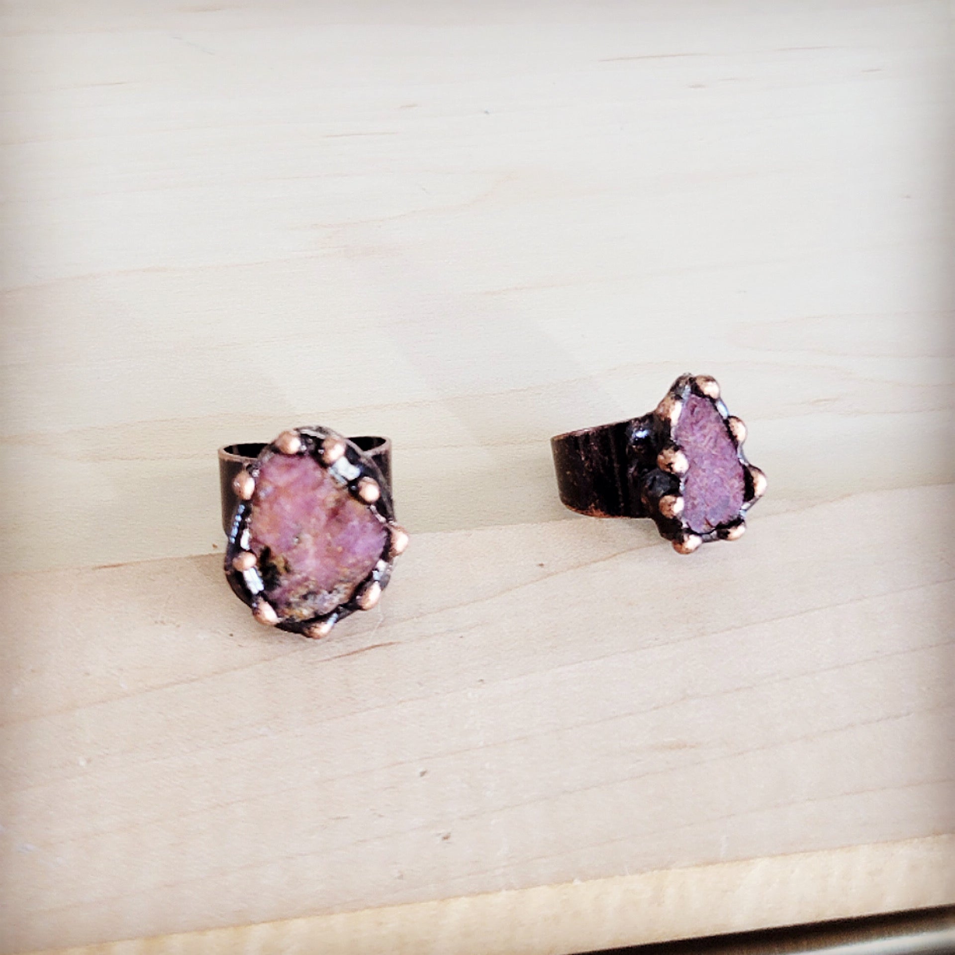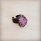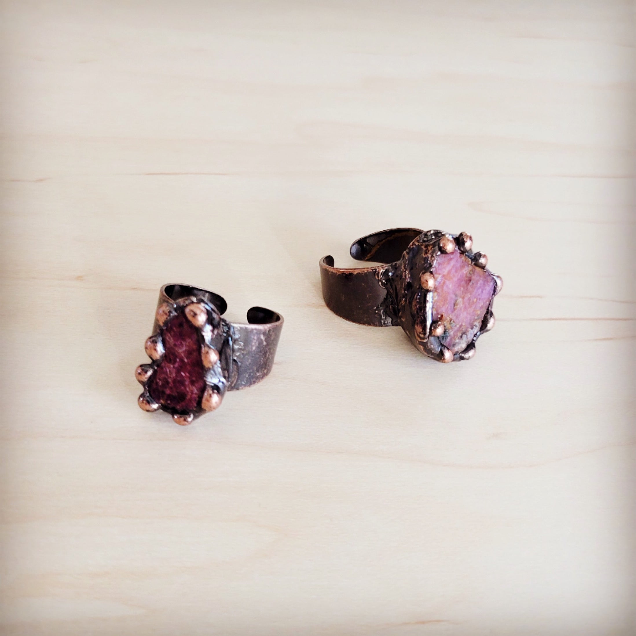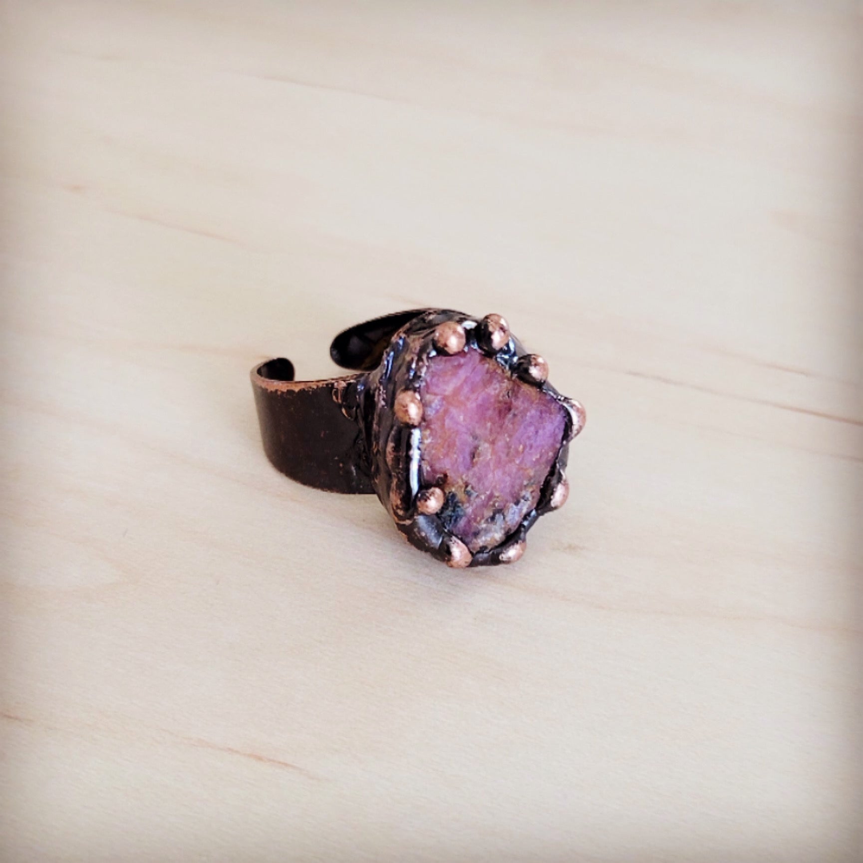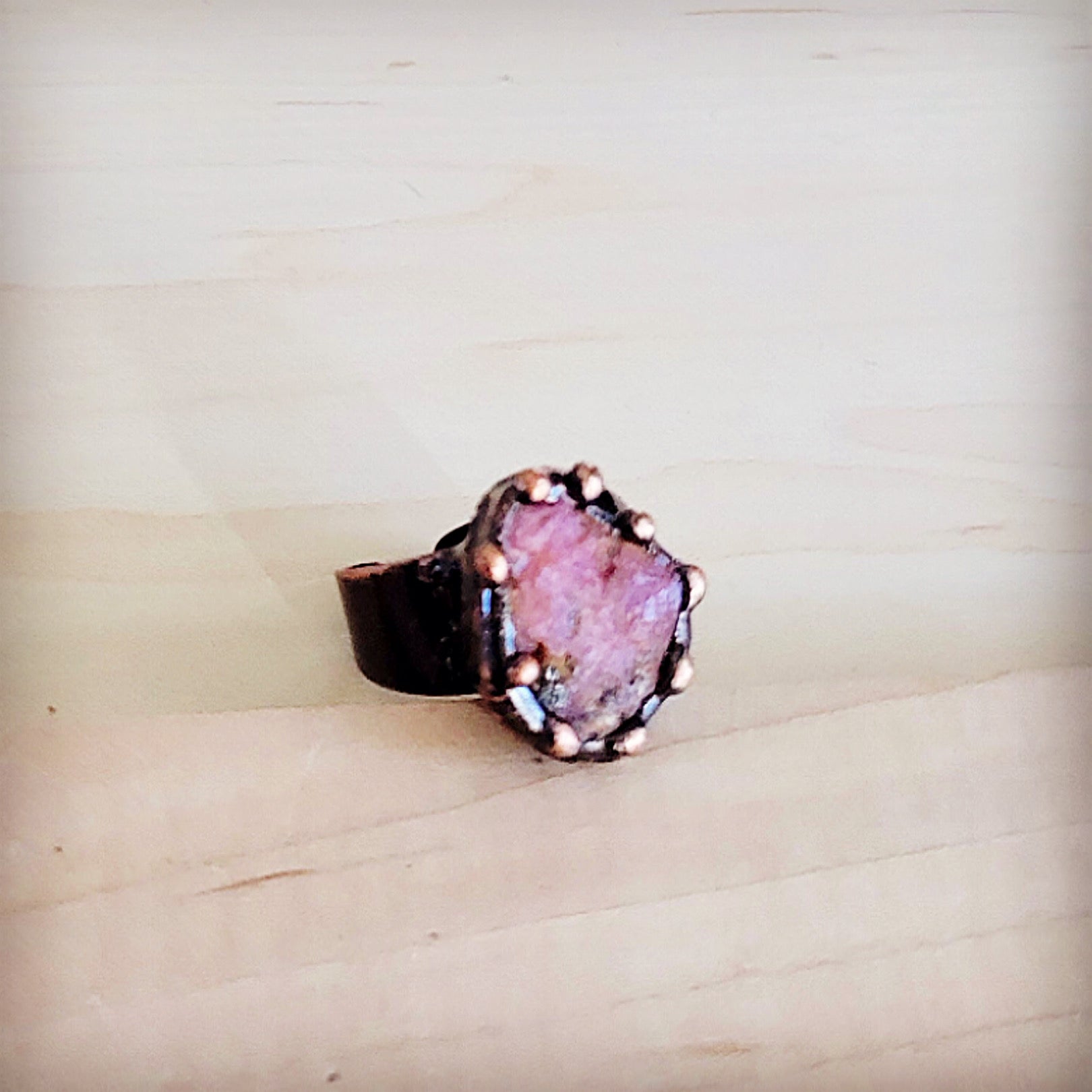 This exquisite, handcrafted copper ring showcases a beautiful, raw-cut rose stone, distinguished by its unique, luminous color and organic form. The stone is elegantly framed by a detailed copper bezel and band, resulting in a unique statement piece that radiates sophisticated, earthy charm.
