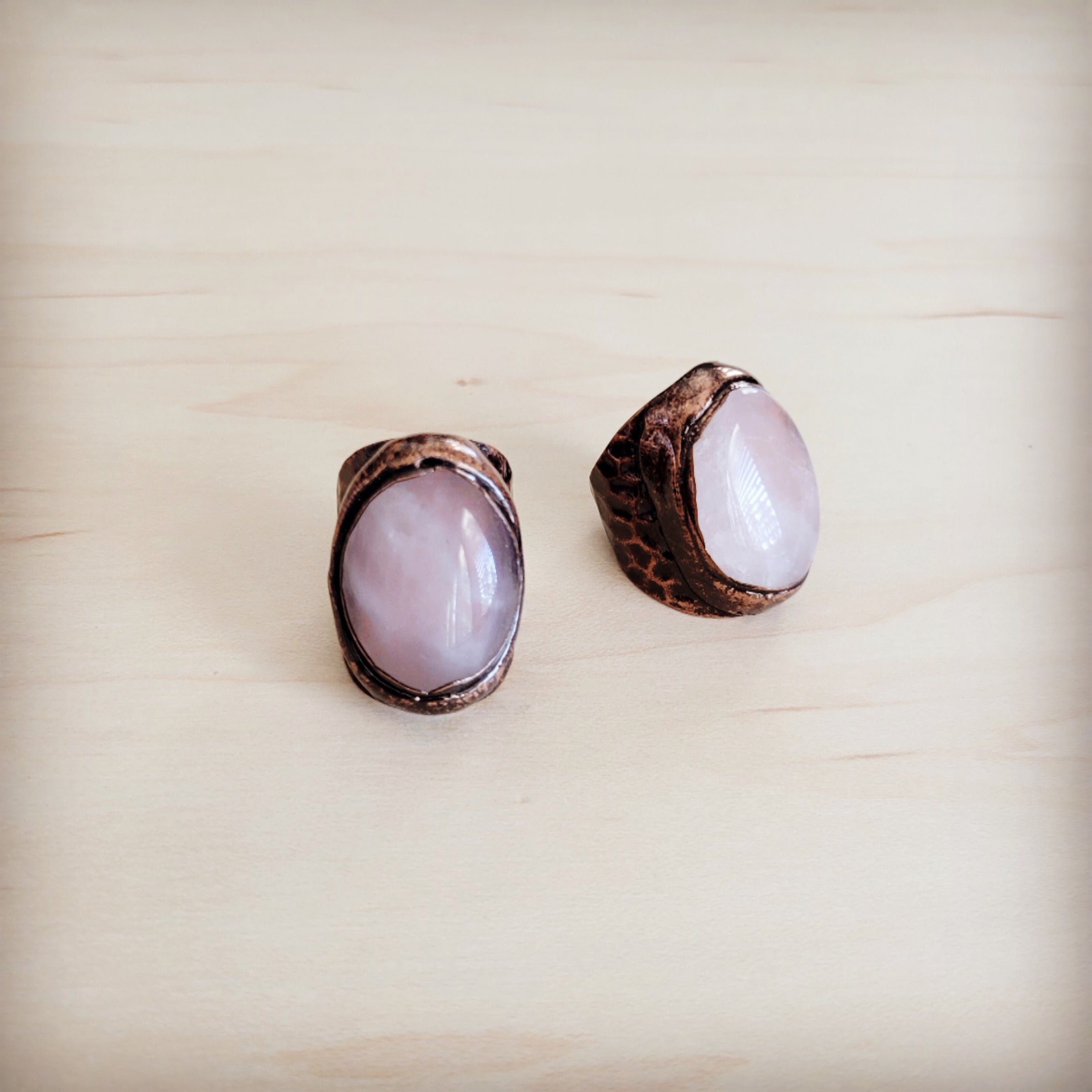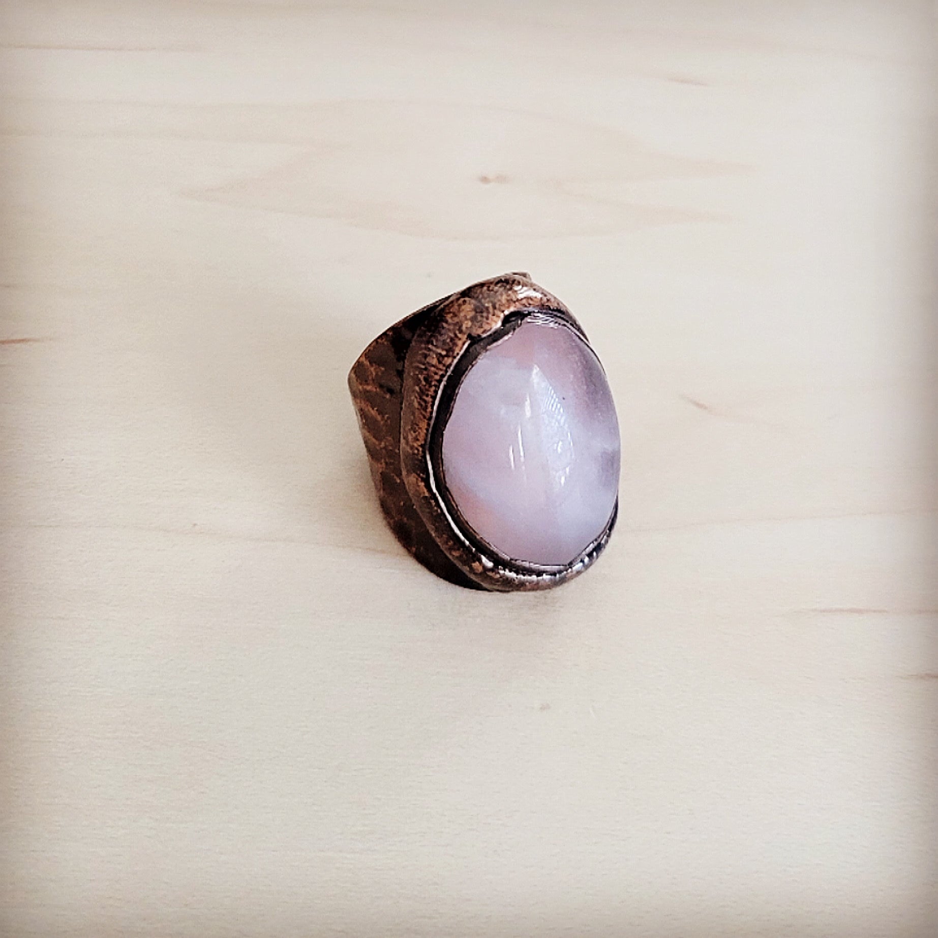 An exquisite statement piece, this ring features a large, luminous cabochon of genuine rose-pink stone, elegantly set in a beautifully textured, hammered copper band. The subtle luster of the stone is perfectly complemented by the warm, rustic hue of the metal, creating a distinctive accessory of sophisticated, earthy charm.