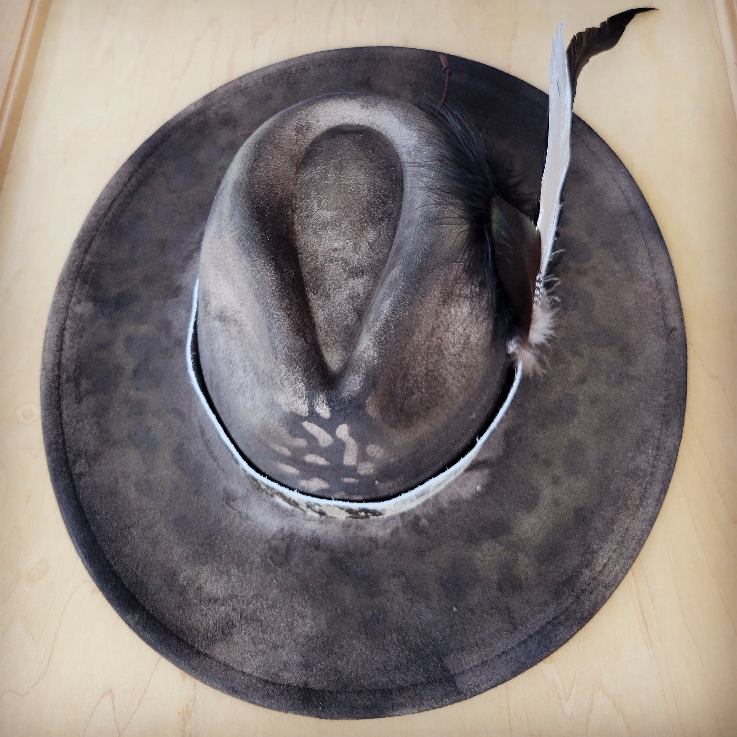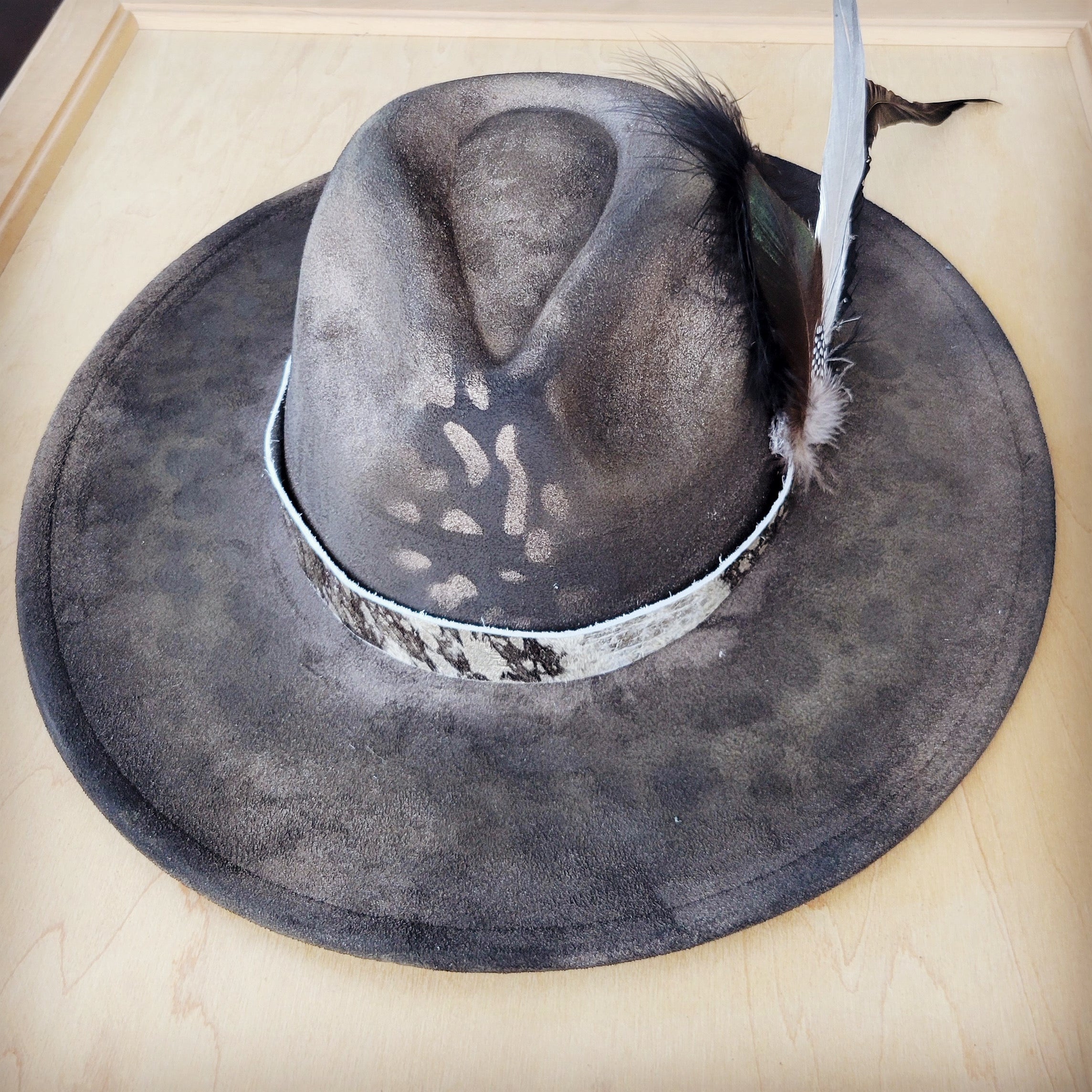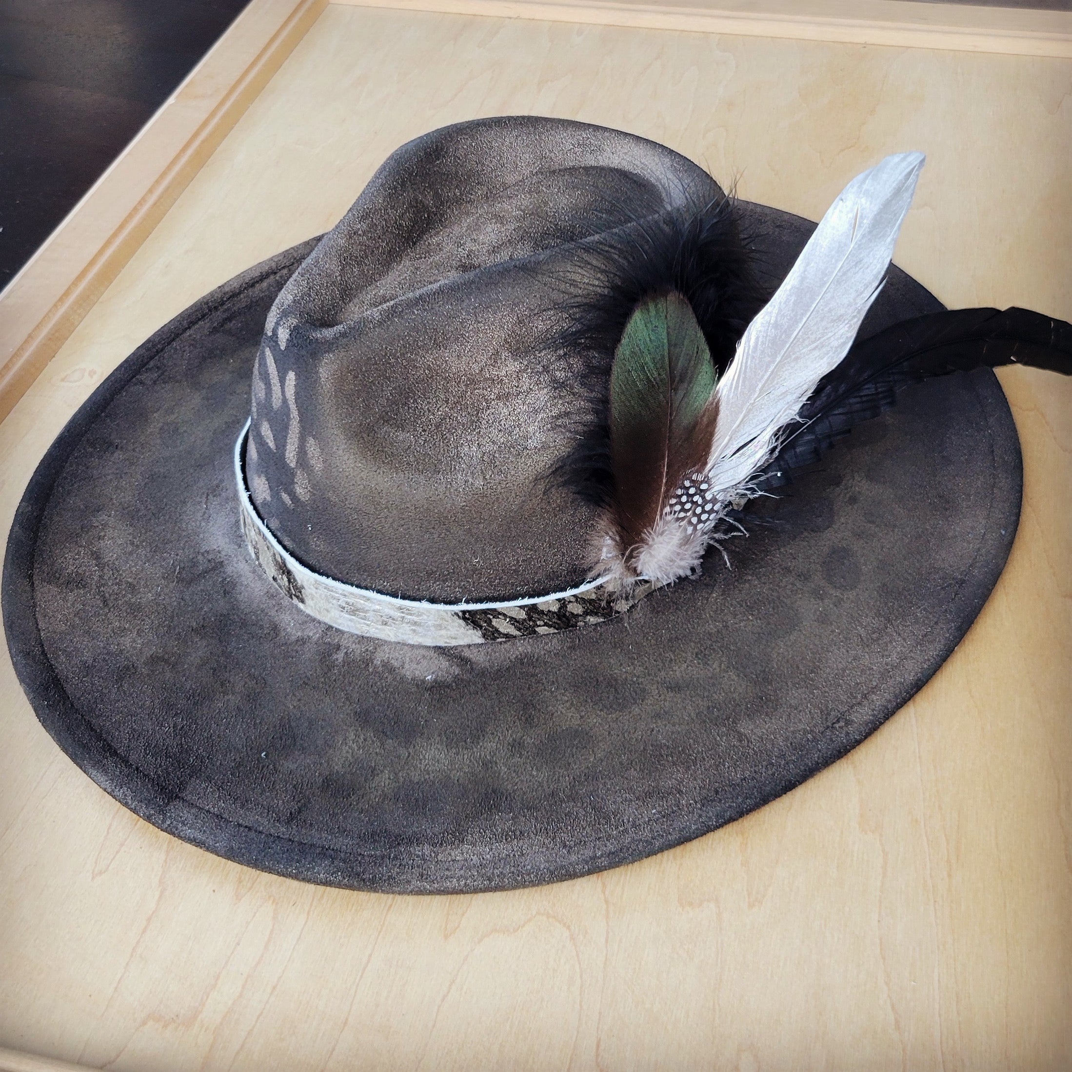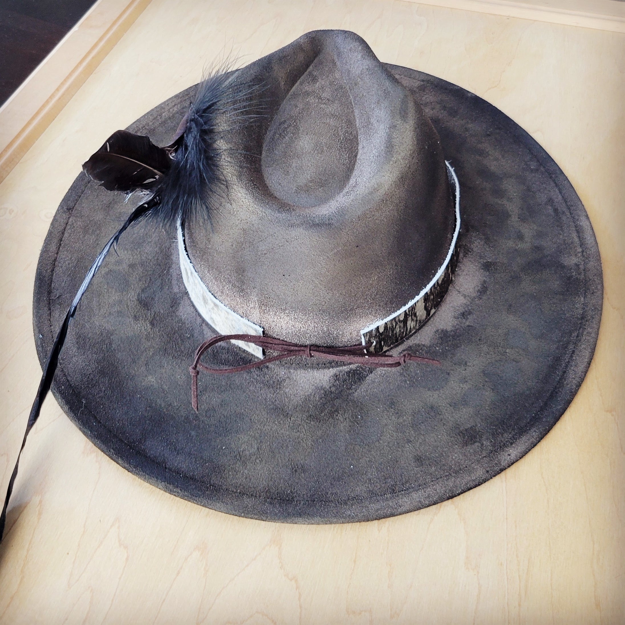 Add a touch of unique style to your wardrobe with our CUSTOM Hand-Painted Cowgirl Western Boho Hat.  Each hat is hand-painted and features a genuine leather hat band, or a combination of feathers and stones giving it a boho western cowgirl vibe. Stand out from the crowd and express your own personal flair with this one-of-a-kind hat!