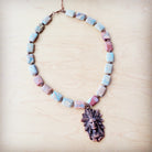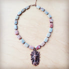 This handcrafted boho necklace features a striking Genuine Aqua Terra collar adorned with a Indian Head pendant. Perfect for adding a touch of unique style to any outfit. Handmade with care and attention to detail, this necklace is a must-have for any fashion-forward individual.