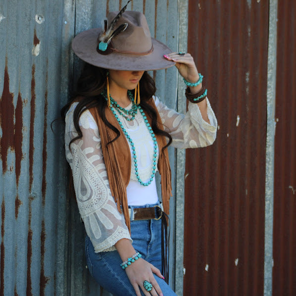 Indulge in this stunning turquoise necklace. Handmade in Texas, this necklace is a unique addition to any boho or western fashion ensemble. The genuine magnesite turquoise stones add a touch of natural beauty. Elevate your style with this one-of-a-kind piece!