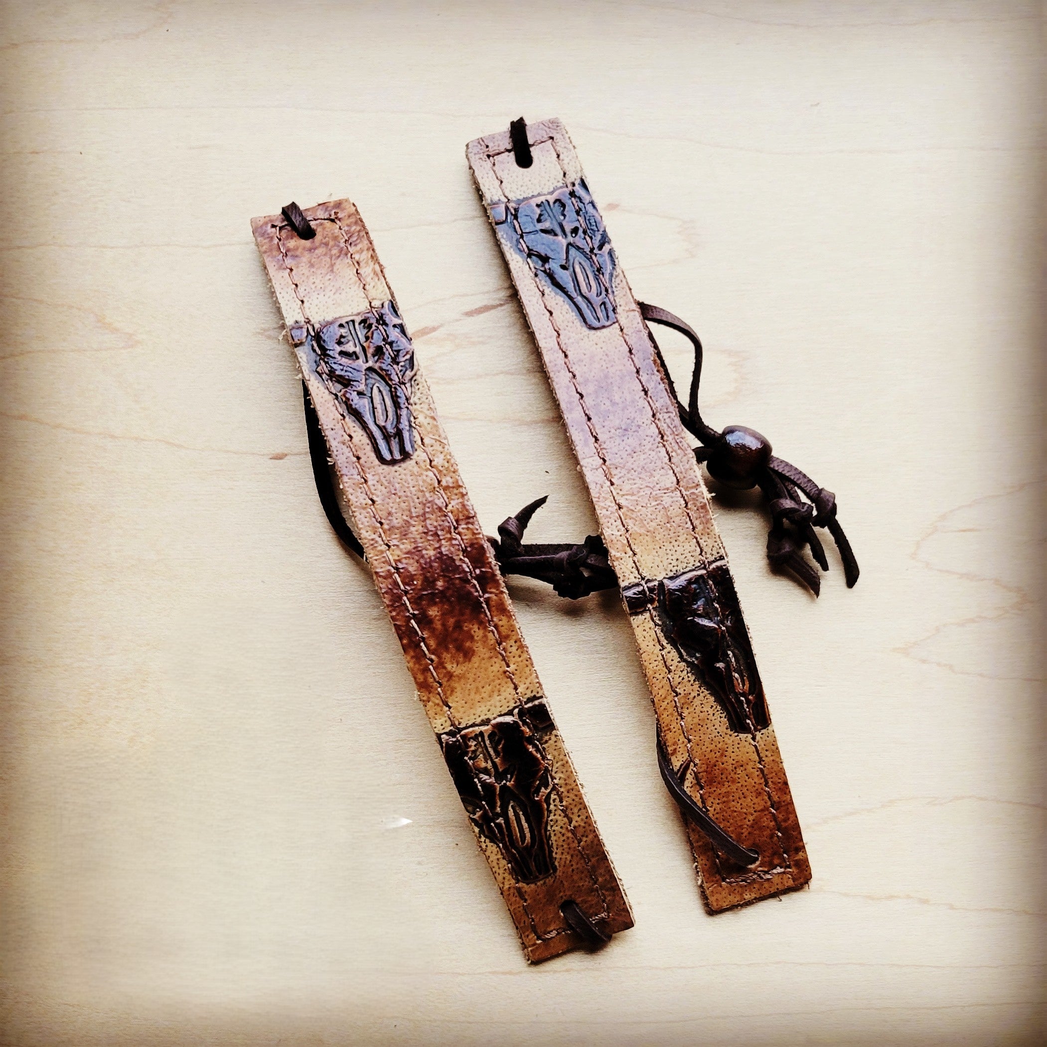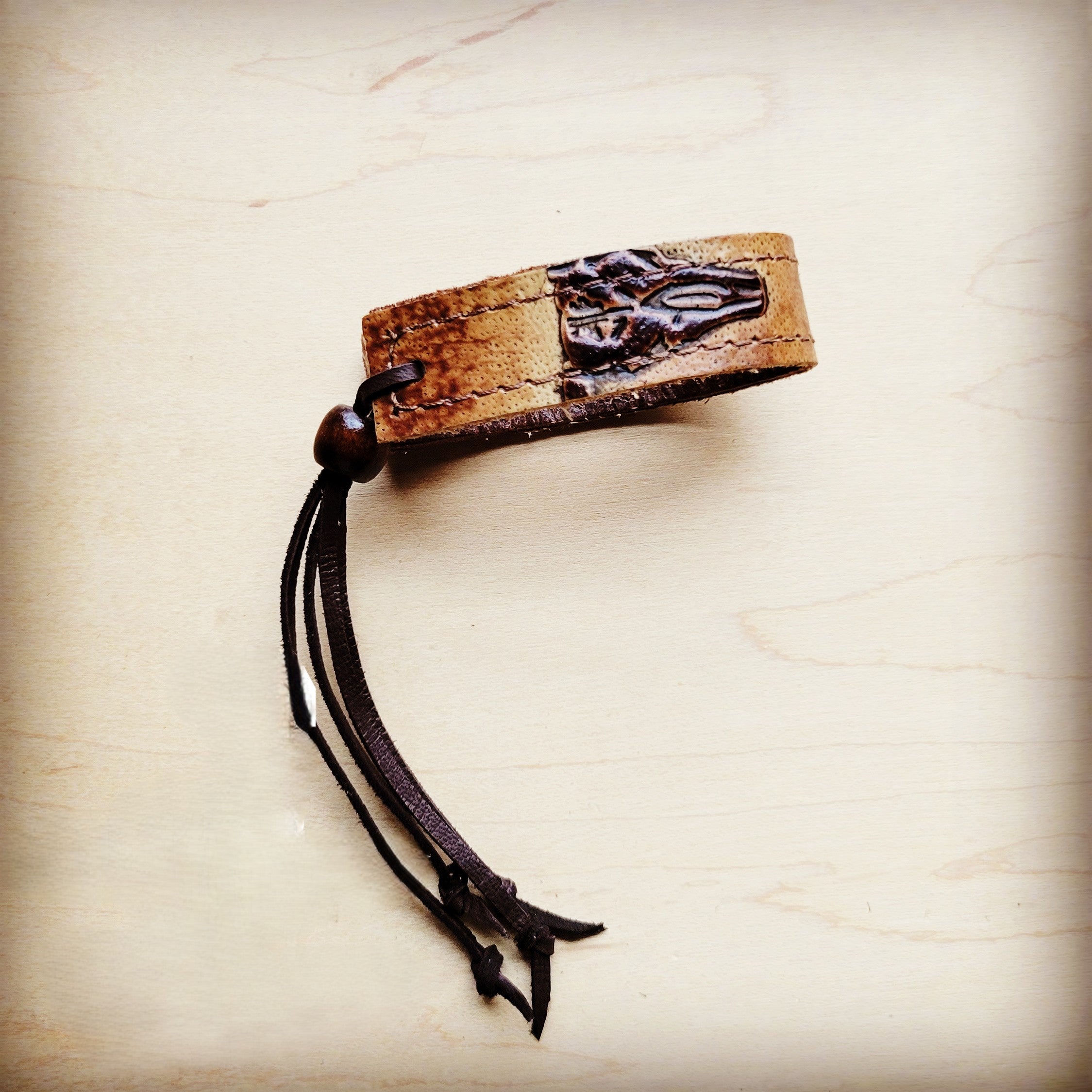 **Narrow Leather Cuff w/ Adjustable Tie Tan Steer Head 013jj