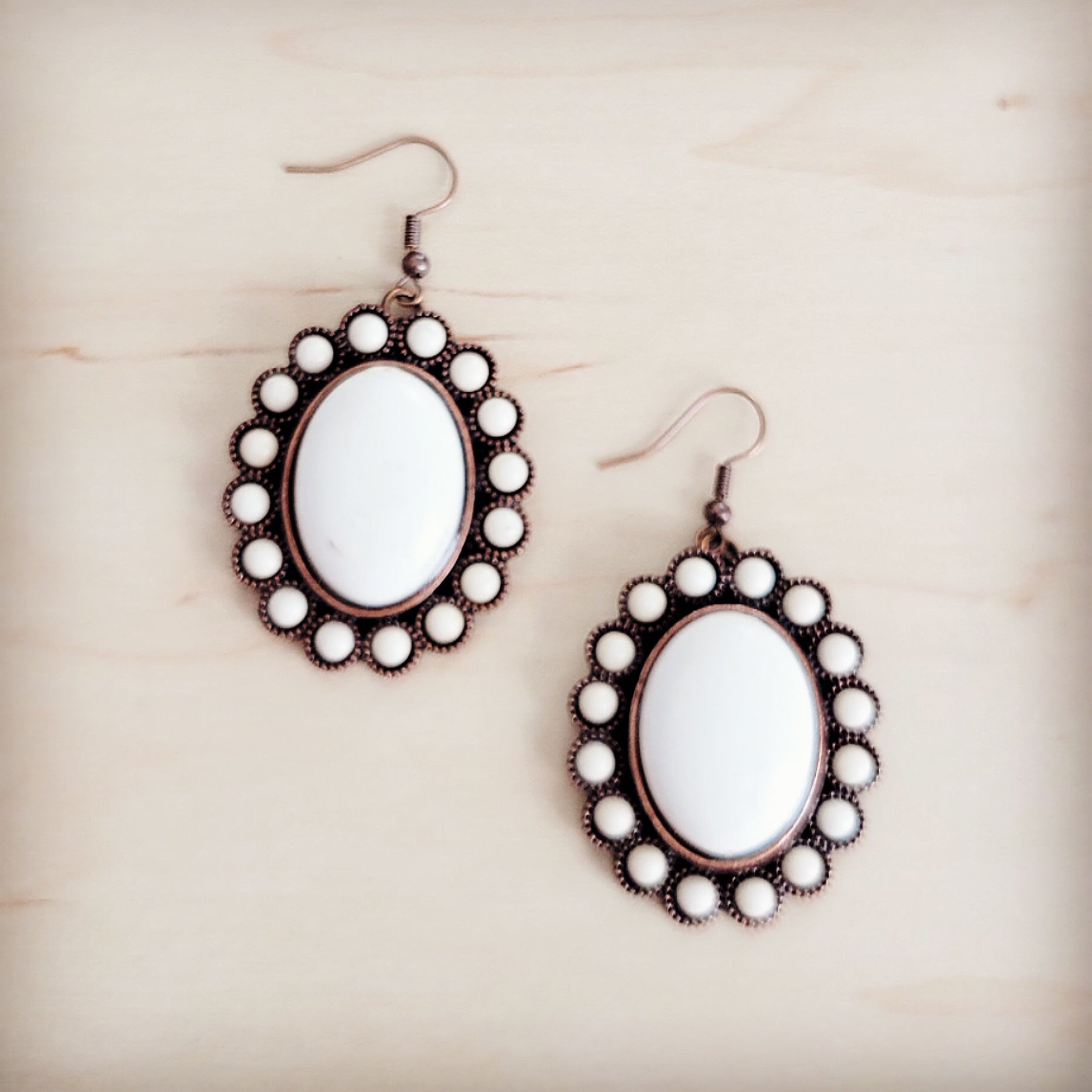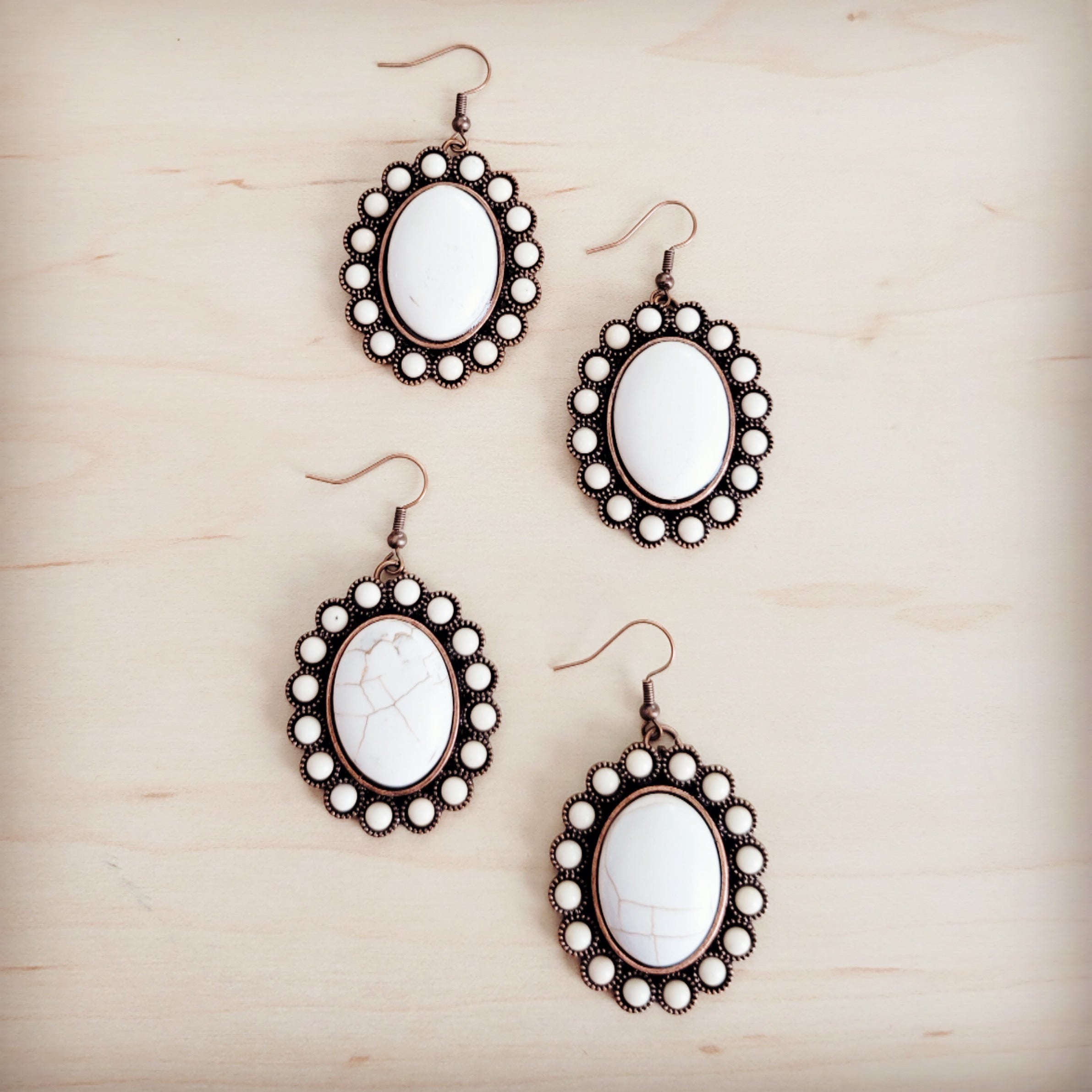 These exquisite earrings feature a stunning white oval cabochon stone set within an ornate, antique copper-tone frame. The highly detailed metalwork is uniquely bordered with a row of small, raised beads, giving the pair a Victorian-inspired, elegant look. Some stones showcase natural gray veining for an authentic, earthy touch. They are suspended from simple French wire hooks.