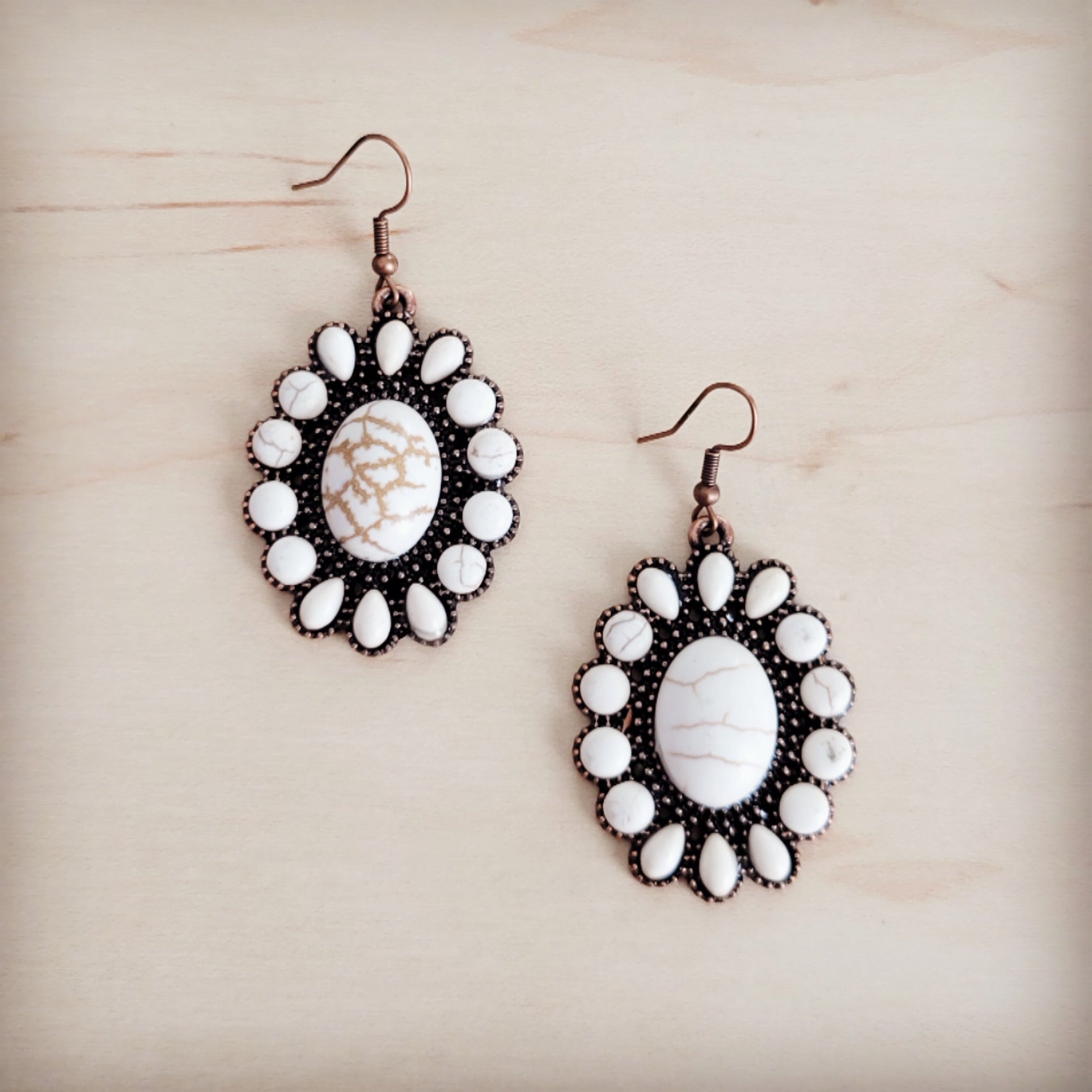 These exquisite drop earrings are a unique blend of bohemian style and rustic elegance. They feature a central oval cabochon of white stone with striking tan/brown matrix, surrounded by a delicate halo of small white teardrop beads. All stones are secured within an antique copper-tone metal setting, forming a beautiful, scalloped floral design. Suspended from simple French hooks, these earrings make an effortlessly elegant statement.