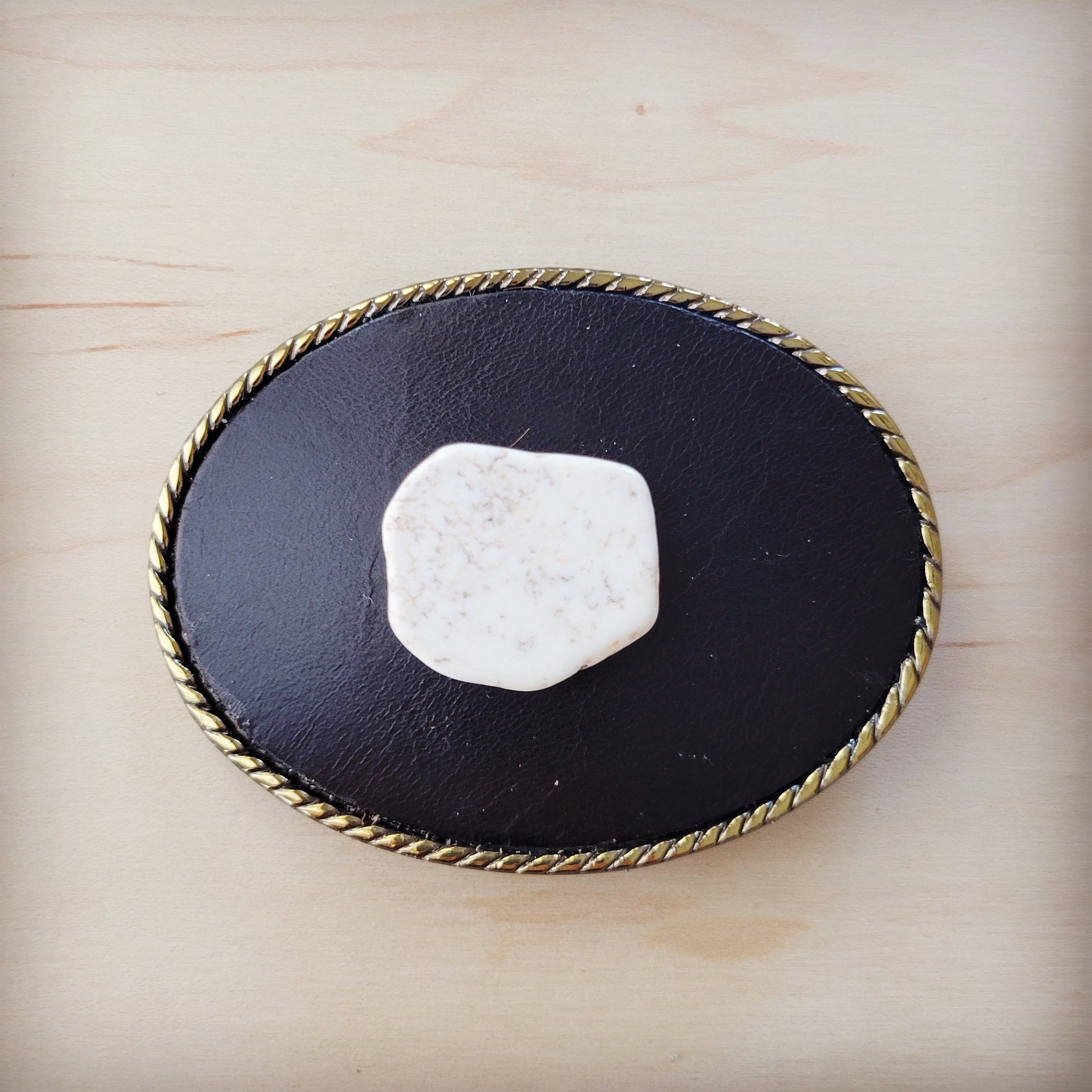 Rope Edge Dark Brown Leather Belt Buckle w/ White Turquoise 907o