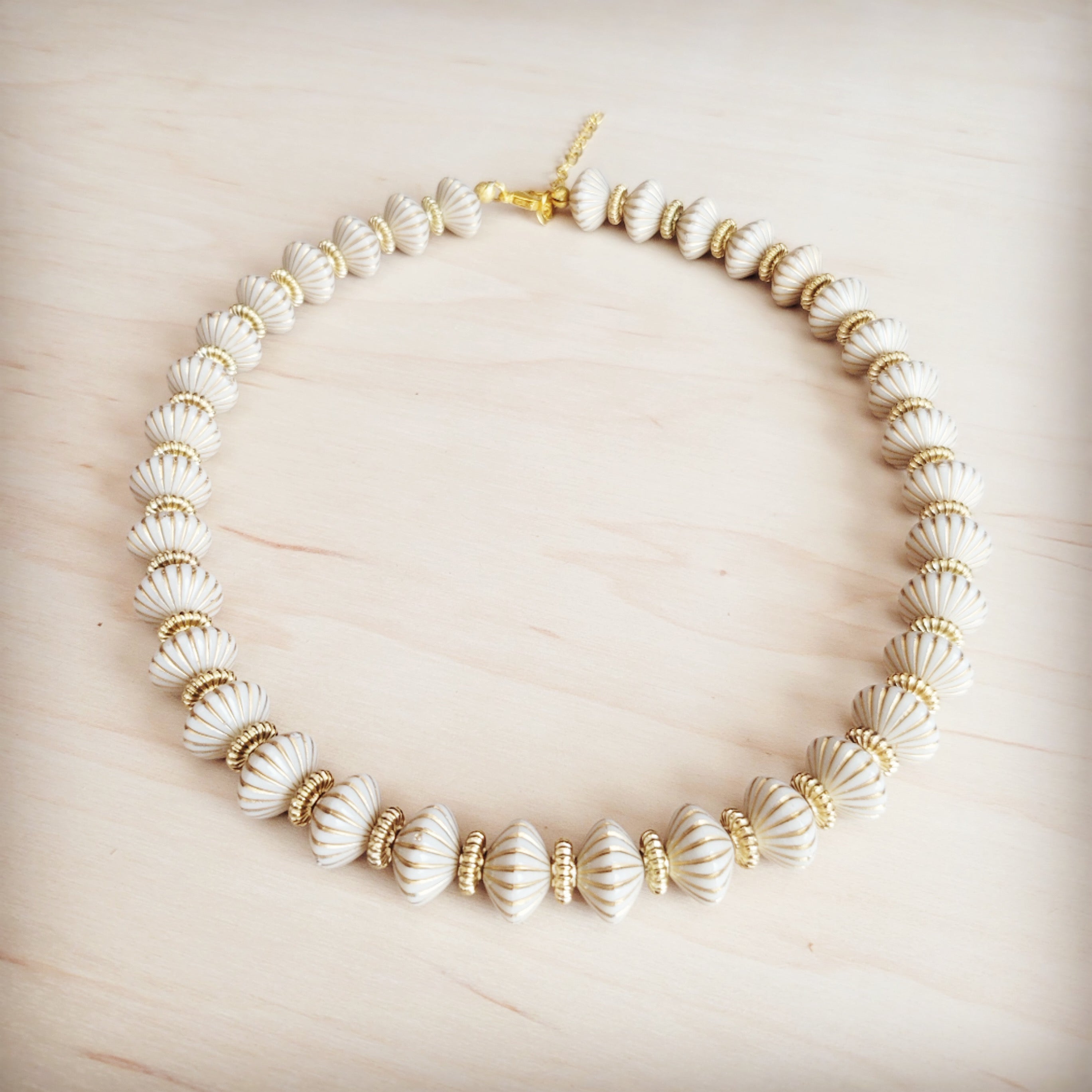 Prepare to turn heads with this absolutely stunning collar necklace! This piece features a continuous ring of uniquely crafted, creamy white beads with intricate ridged detailing, reminiscent of tiny spiral seashells. Separated by delicate gold-tone spacers, these highly textured beads create an elegant, almost sculptural look. This necklace is an incredibly unique and elegant statement piece, perfect for adding a sophisticated, high-fashion finish to any formal or refined outfit.