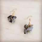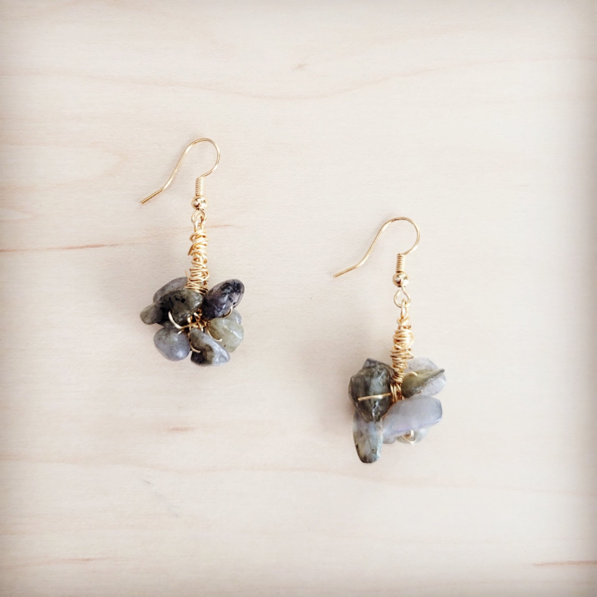 These exquisite earrings embody organic elegance with their unique, handcrafted design. They feature a cluster of polished, tumbled natural stone chips meticulously wire-wrapped with fine gold-tone wire, creating a sculptural chandelier effect. This pair is a stunning and unique accessory, perfect for adding an elegant, earthy accent to any look.