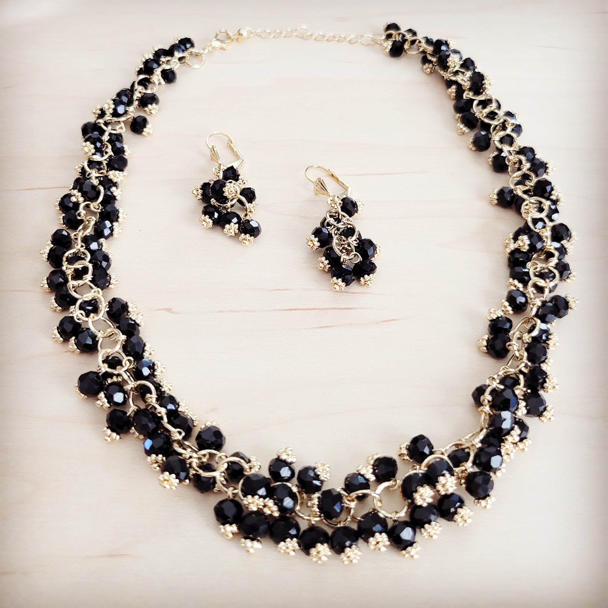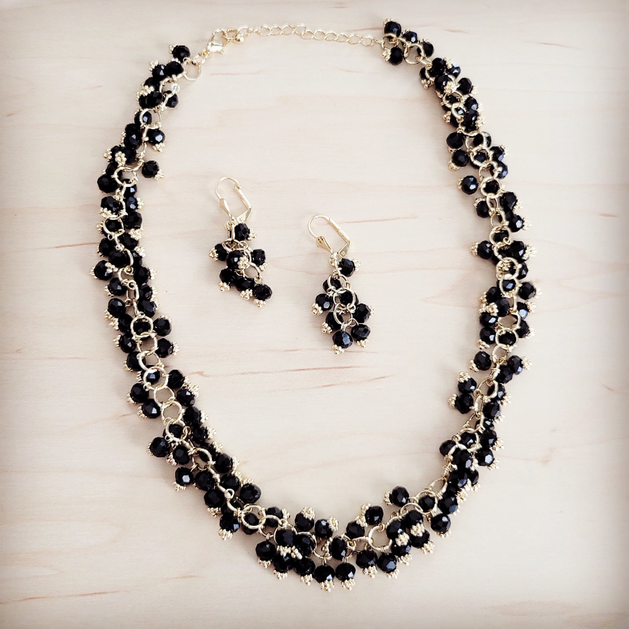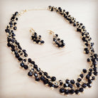 This stunning jewelry set is a truly unique statement of dark elegance and sparkle. The necklace and matching earrings are intricately handcrafted, featuring a cascading cluster of glossy black faceted beads. Each bead is individually wire-wrapped with rich gold-tone metal, creating a dazzling, voluminous texture that drapes beautifully. The clustered design gives the illusion of a luxurious, shimmering fringe. This set is a captivating way to add sophisticated drama to any special occasion look.