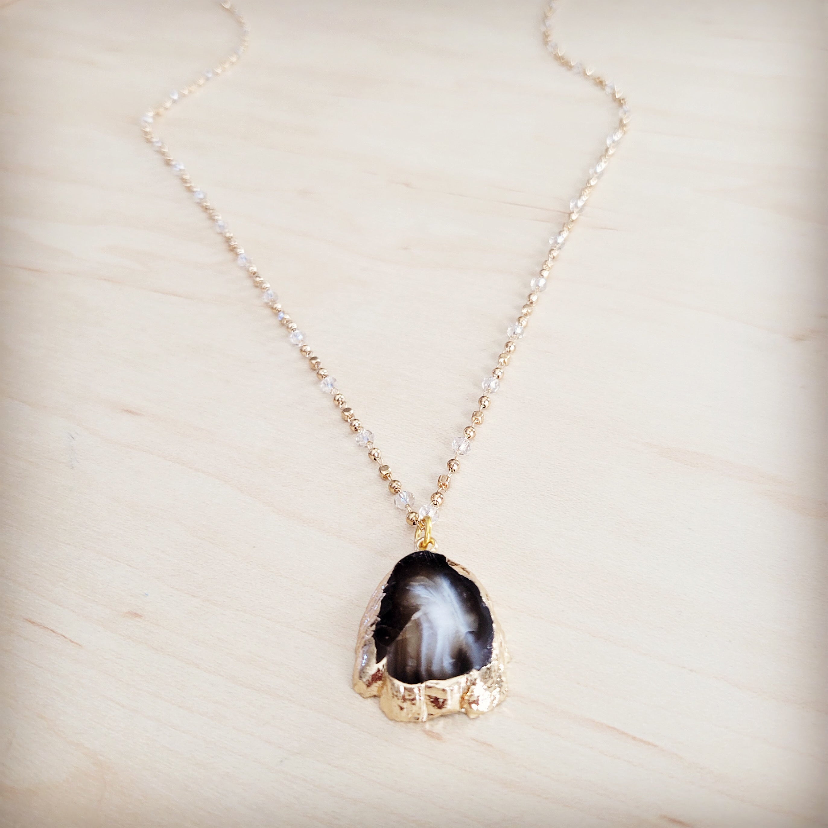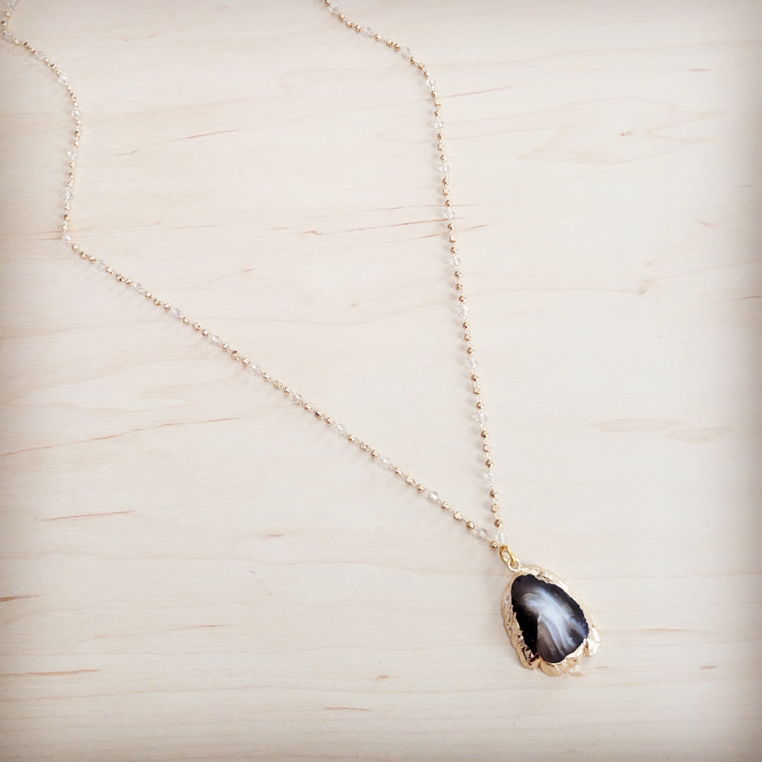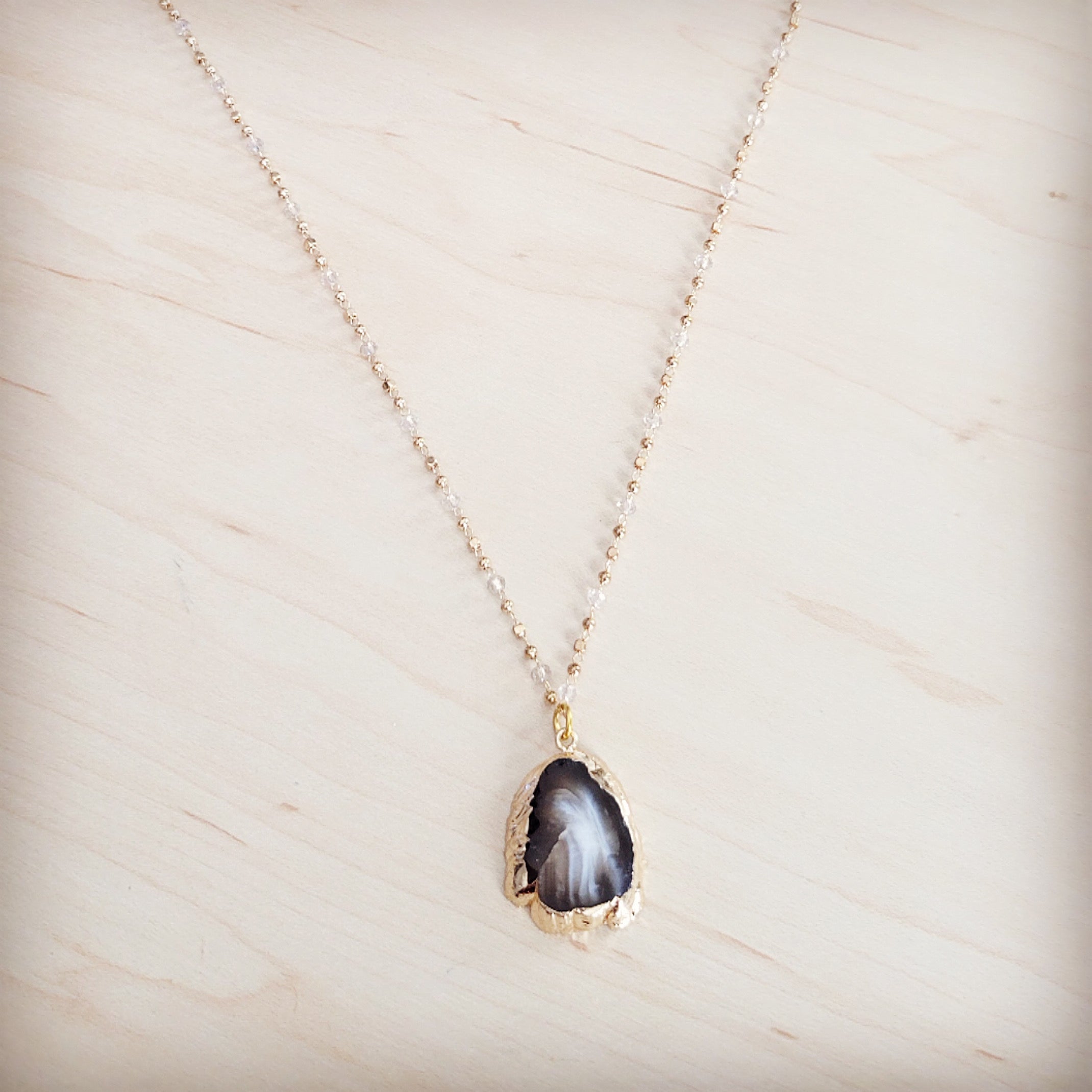 This exquisite necklace is a sophisticated statement of organic elegance. The focal point is a unique, natural teardrop-shaped agate slice, displaying stunning internal layers of color from smoky translucent white to deep black, beautifully finished with a sleek, polished gilded edge (gold-plated border). The long, delicate chain is uniquely crafted from small, continuous gold-tone metal beads interspersed with tiny, faceted clear crystal spacer beads, adding subtle, ethereal sparkle for an effortlessly chic and refined look.