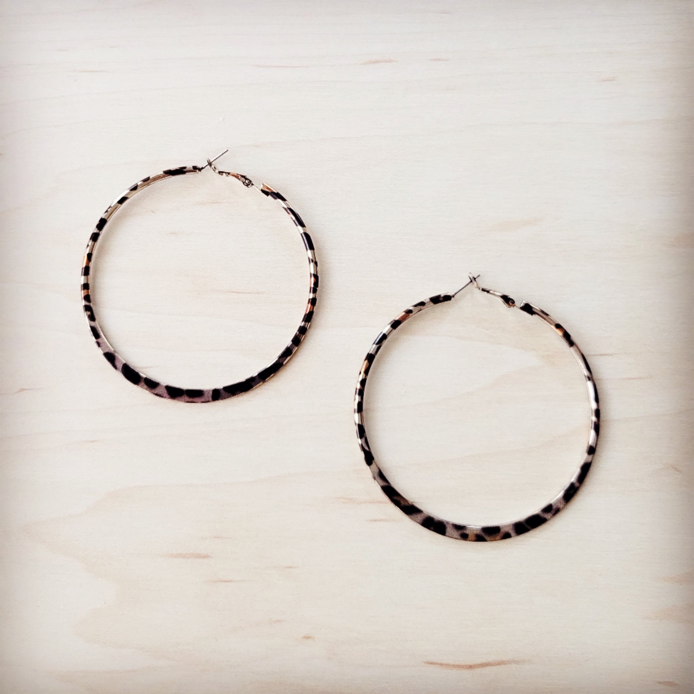 These impressive oversize hoop earrings feature a chic, slightly hammered texture and a distinctive leopard print and spotted design, creating a captivating visual detail. Their elegant scale and unique pattern make them a striking statement piece, instantly adding a bold and sophisticated detail to any bohemian style outfit.