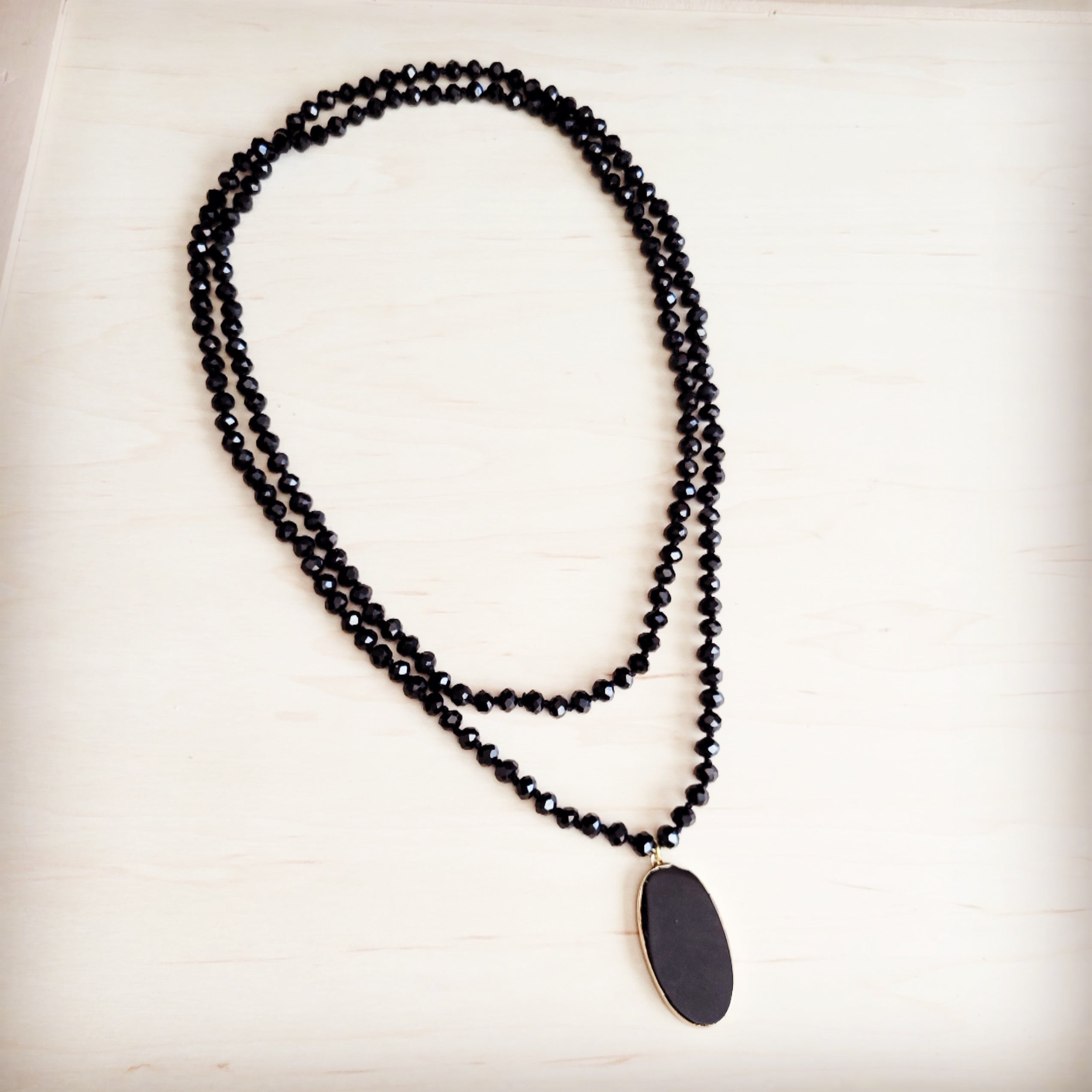 This one-time item is an exquisite Western Boho style necklace, featuring long strand of jet-black faceted beads and a sleek, bold oval black pendant set in gold-tone metal. Its striking, minimalist design makes it the perfect piece for all boho style outfits, effortlessly adding a touch of dark, sophisticated glamour to your wardrobe. Once sold out it will not be made again, these items are final sale!