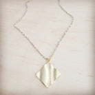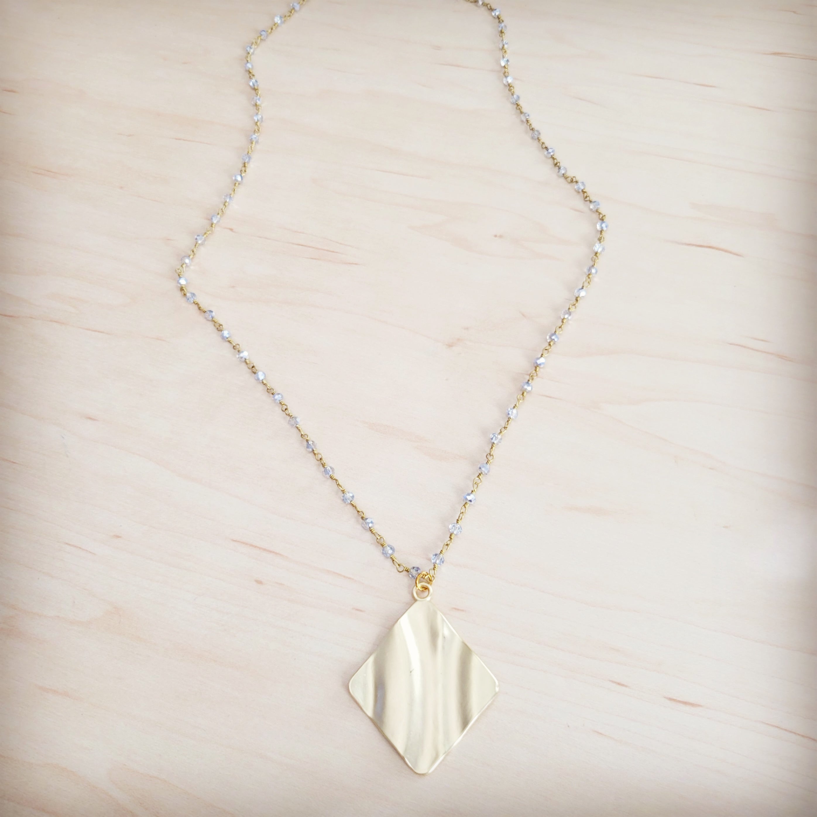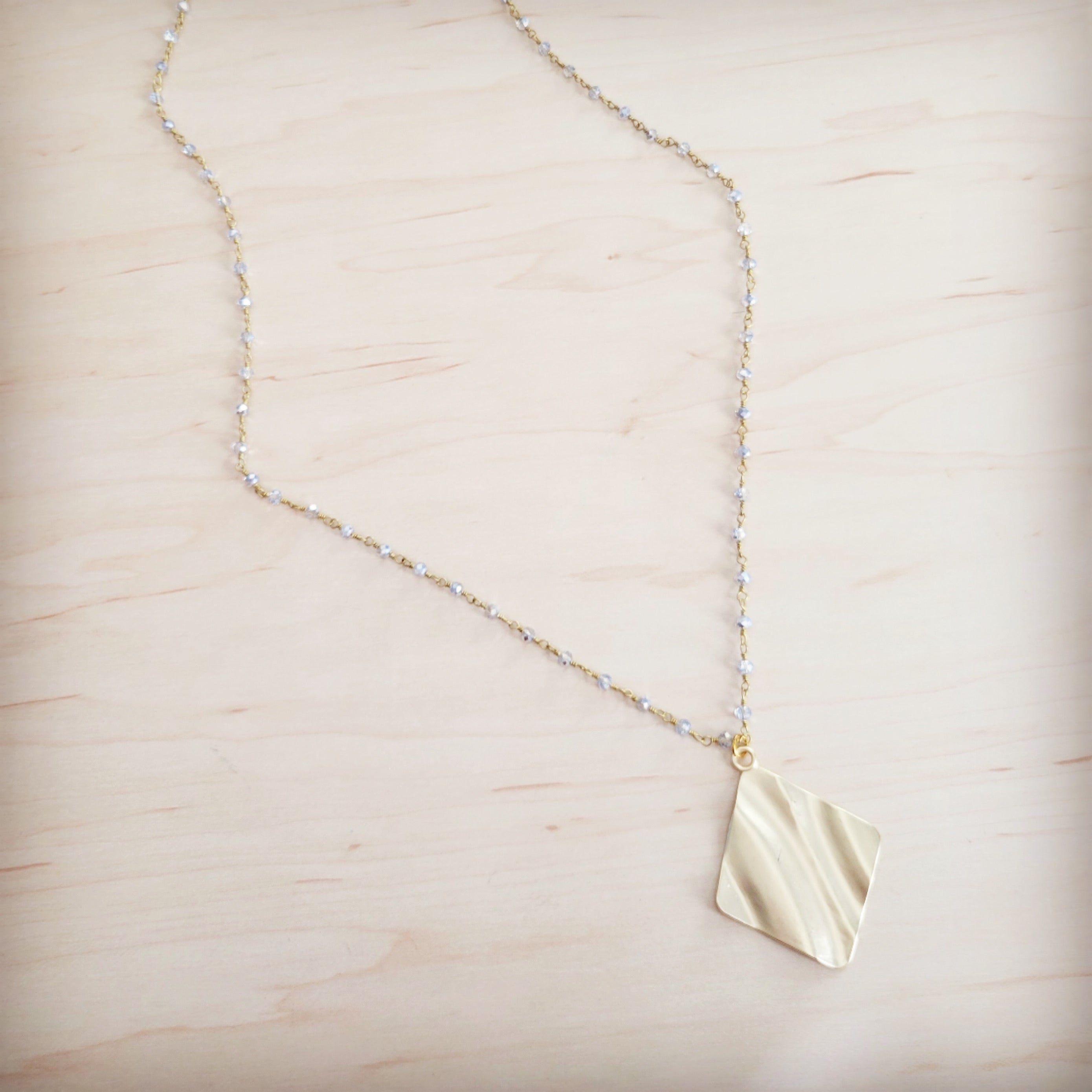This exquisite long necklace is a statement of chic, contemporary elegance. The large, square gold-tone pendant features a unique, subtly wavy, hammered texture that catches the light beautifully. The chain is an exceptionally unique, delicate rosary-style strand composed of gold-tone wire links connecting numerous tiny, faceted, clear or pale crystal beads, creating a shimmering contrast that makes this a sophisticated and one-of-a-kind accessory.