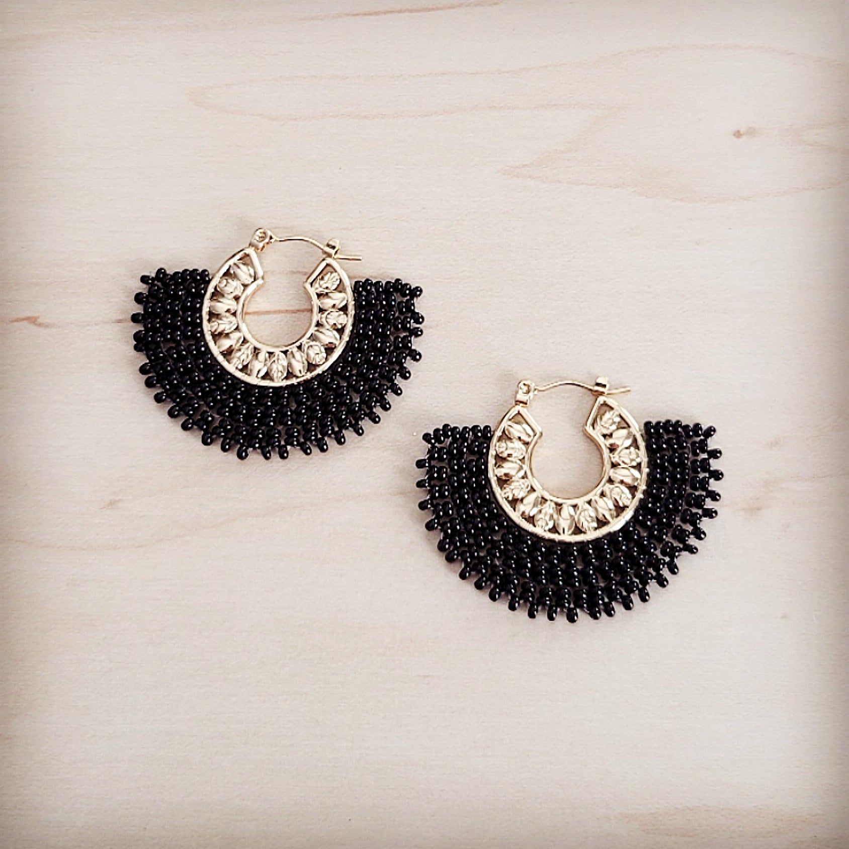 These elegant earrings feature a gold-tone half-hoop closure, brilliantly accented with a row of clear crystal embellishments. Dangling below is a dramatic, semi-circular fan of glossy black seed bead fringe, creating a bold, textural contrast that's both Art Deco-inspired and boho-chic.