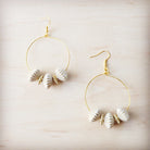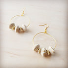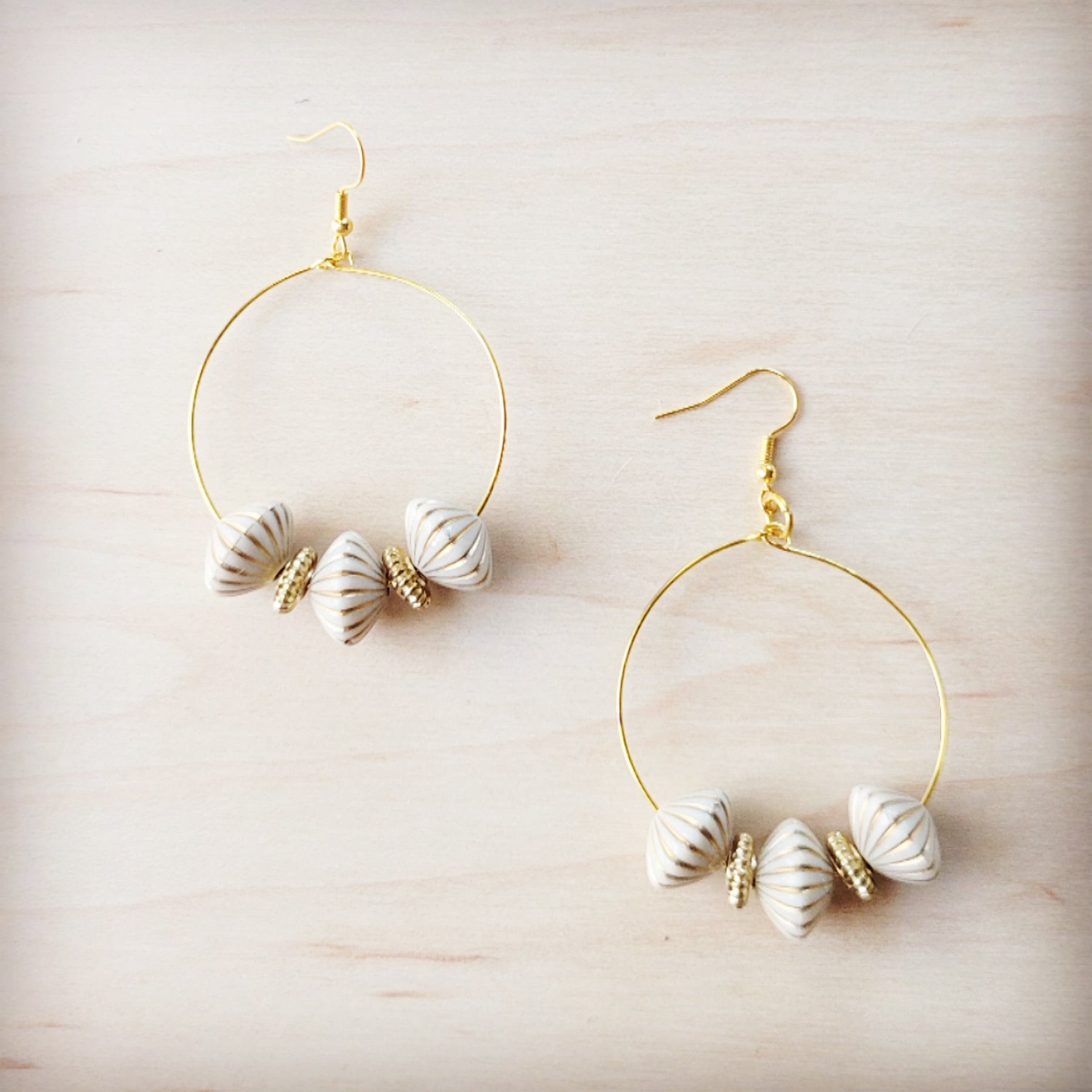 Achieve an elegant and chic boho style with these beautiful gold hoop earrings. They feature slender gold hoops suspended from secure ear wires, adorned with a cluster of stunning, bow-shaped beads. The cream and gold striped pattern on the charms adds a beautiful, unique texture that perfectly complements the polished gold for a sophisticated, free-spirited look.