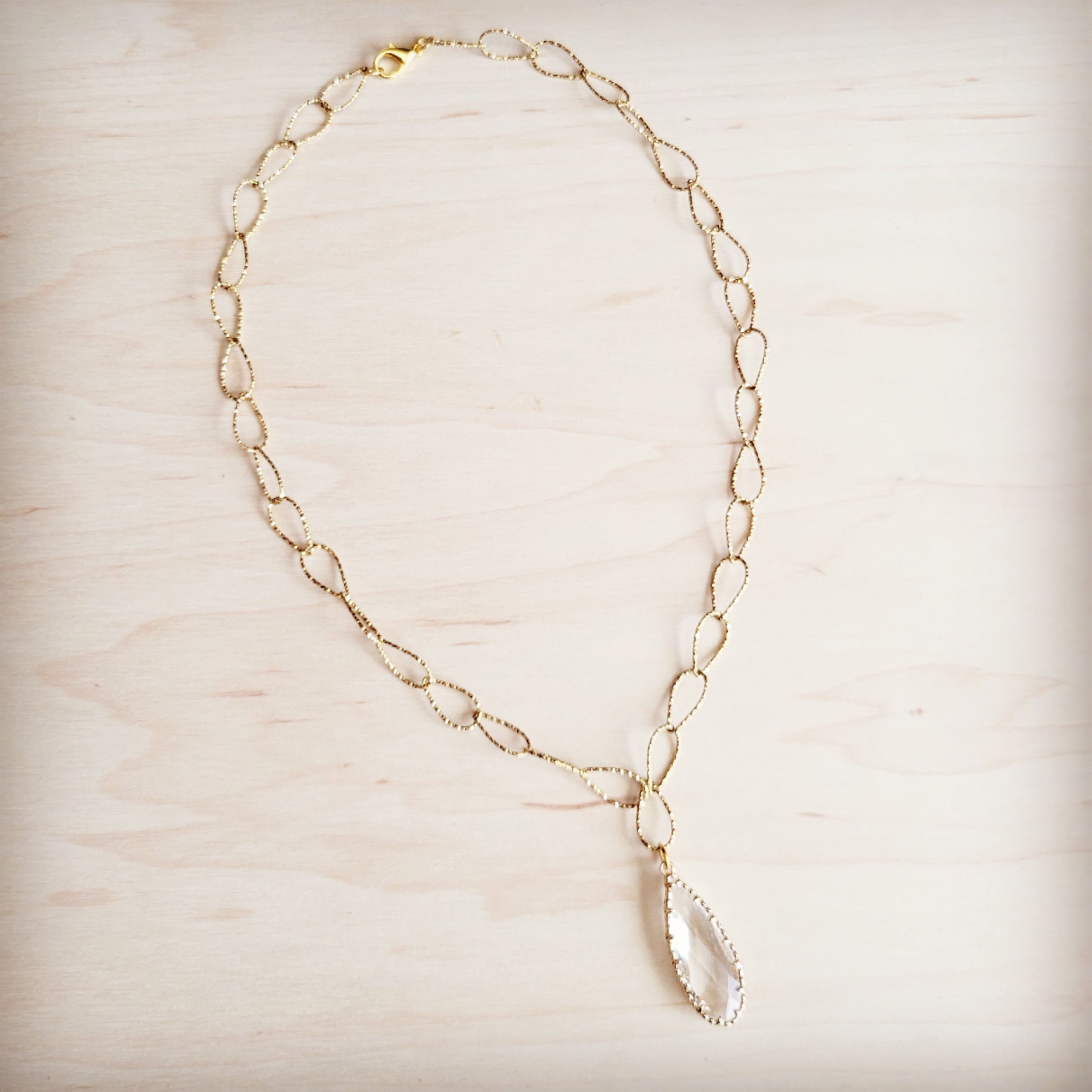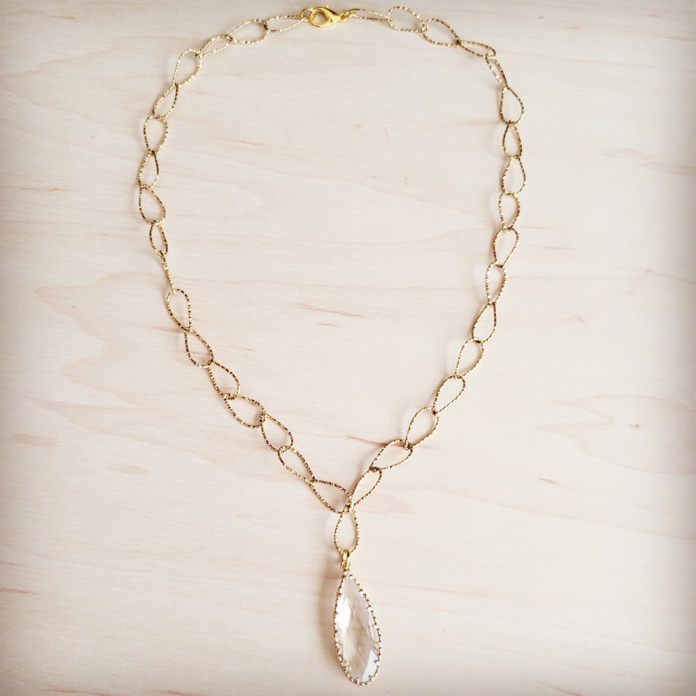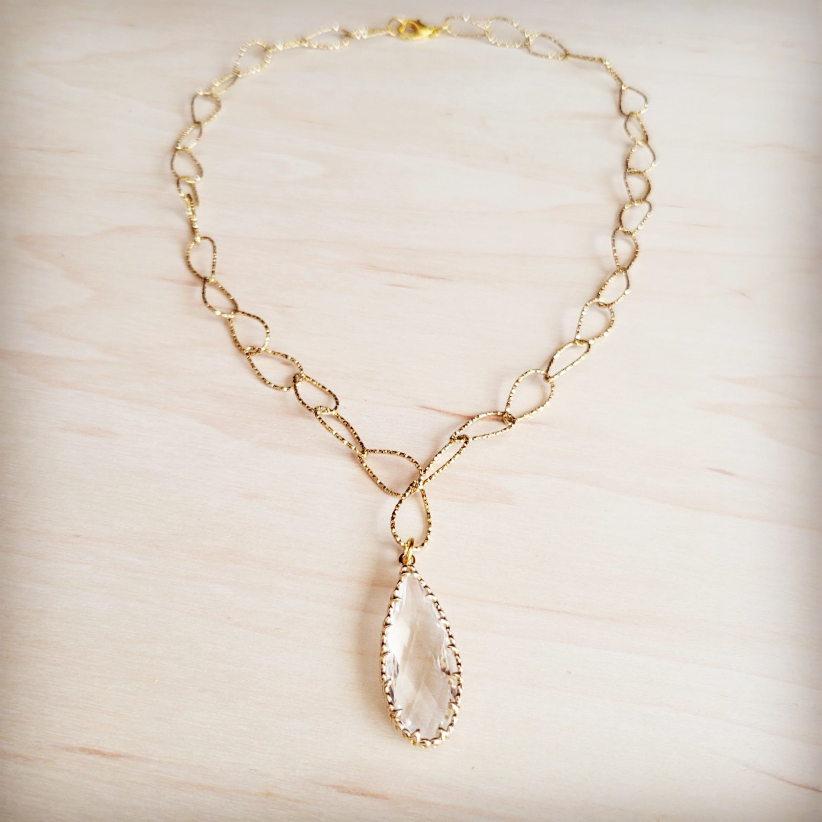 Indulge in the sophisticated charm of this gold chain necklace, featuring unique, shimmering oval links that catch the light beautifully. The chain gracefully suspends a magnificent, faceted clear teardrop pendant rimmed in gold. This piece embodies elegant boho chic, offering a touch of indulgence that is great for elevating every outfit.