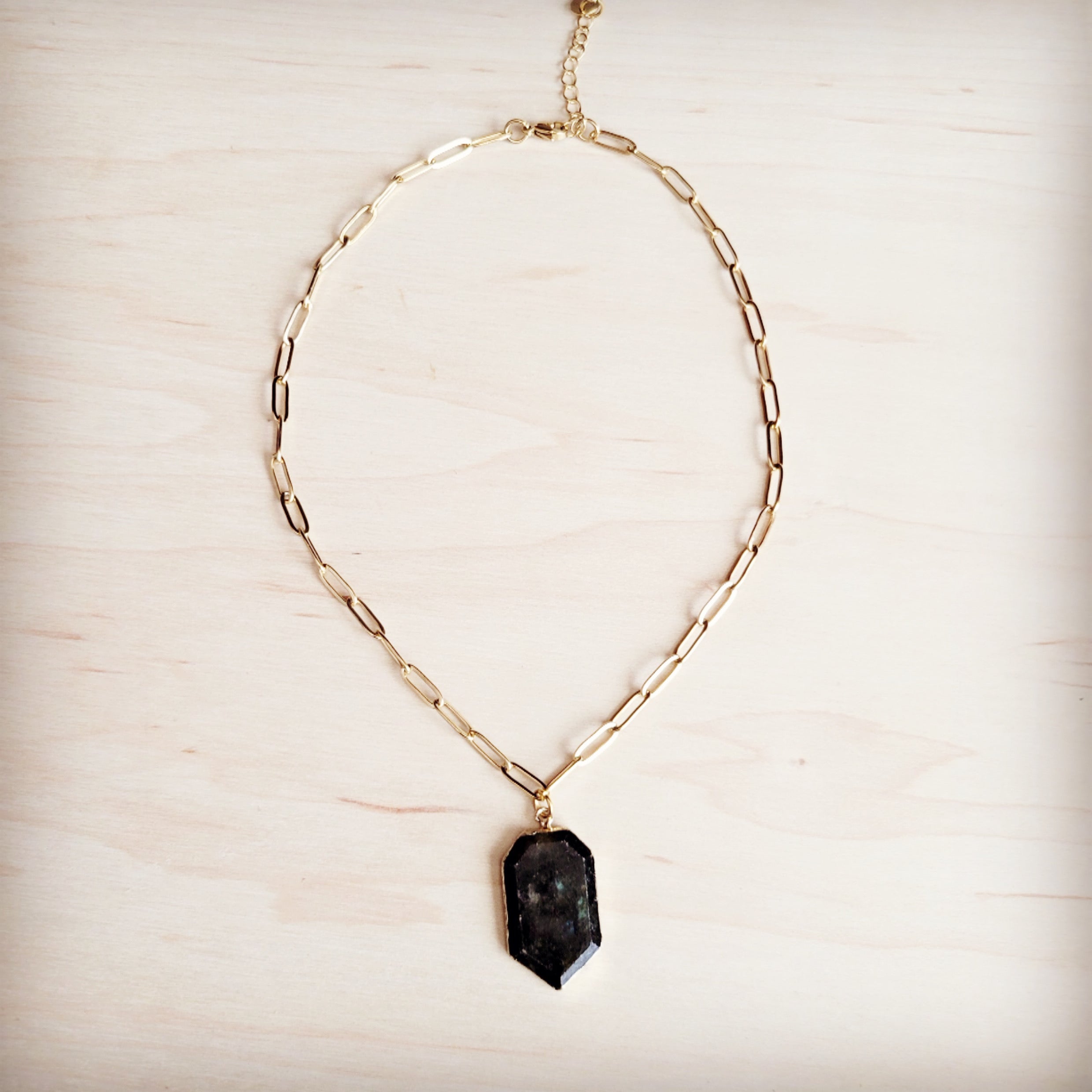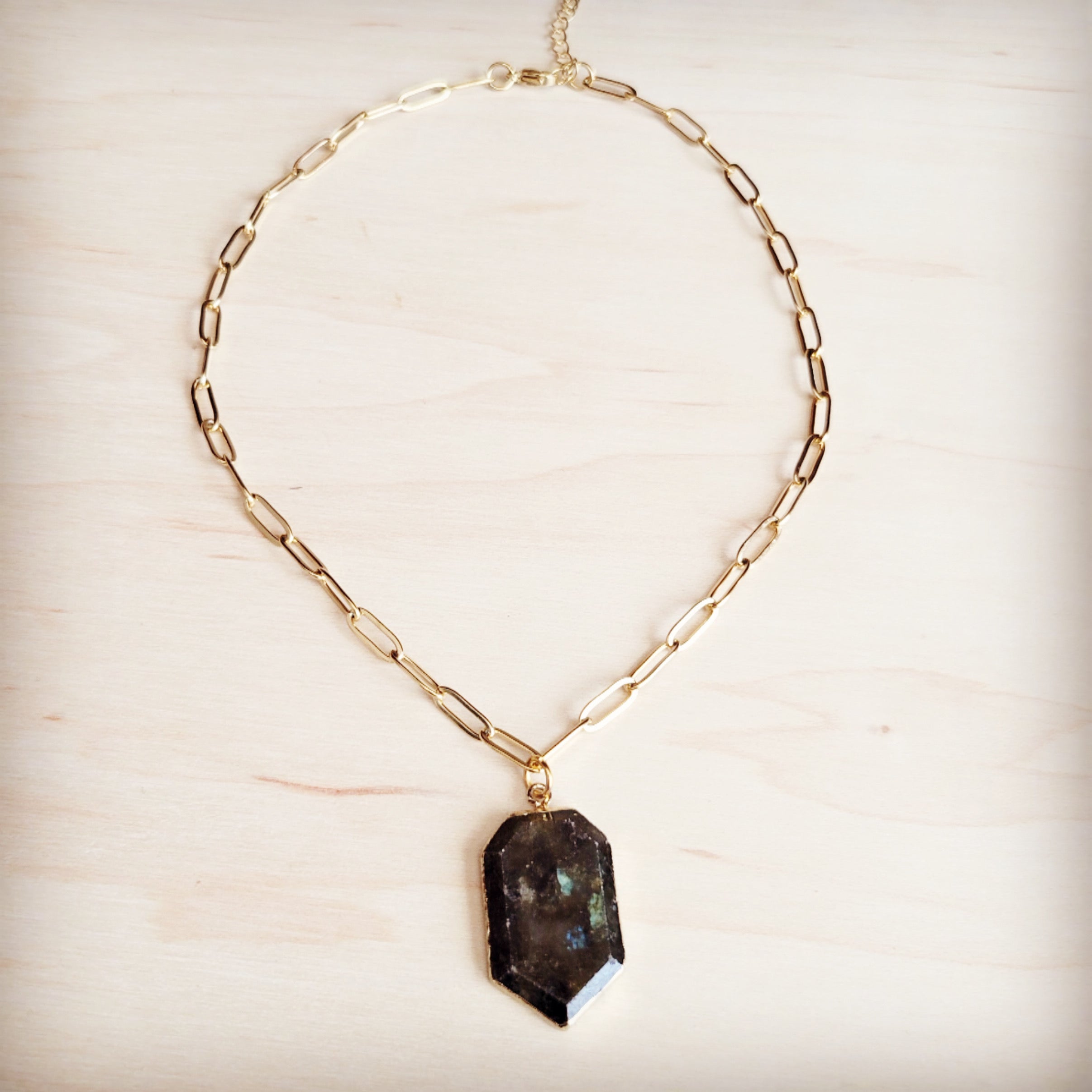 Drift into effortless elegance with this dreamy boho style necklace. A delicate gold-tone oval link chain suspends a one-of-a-kind, faceted Labradorite pendant that flashes with iridescent blues and golds—like a piece of the night sky captured in stone. This chic, elegant accessory is a versatile talisman, perfect for adding a touch of sophisticated magic to all occasions.