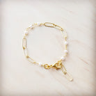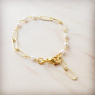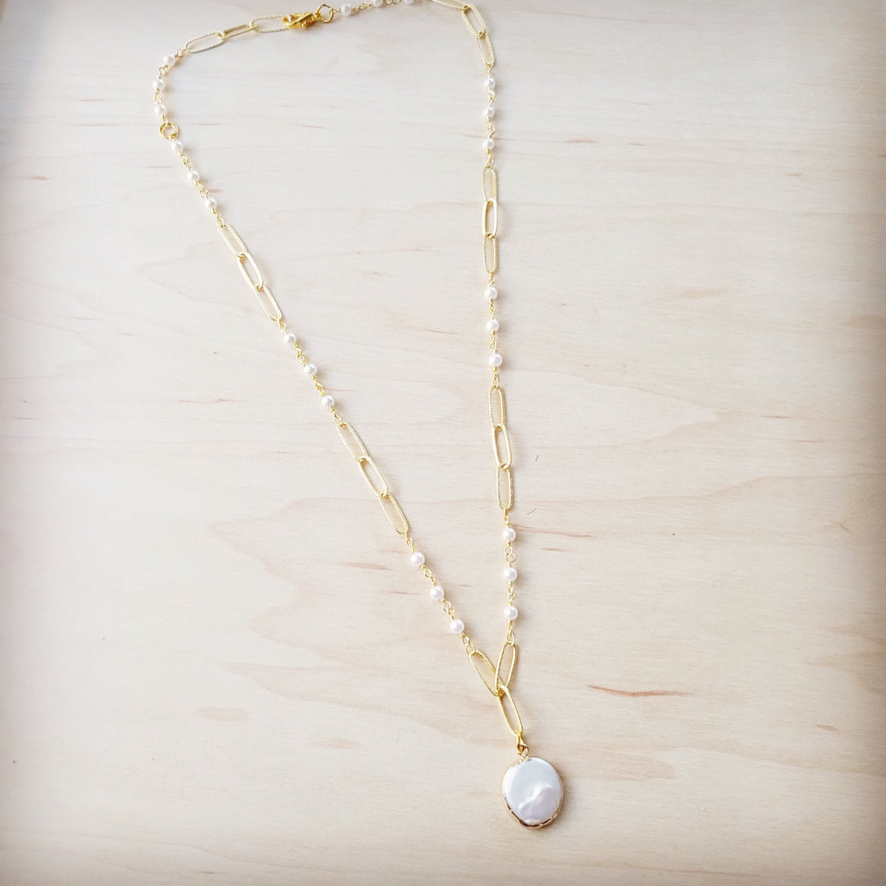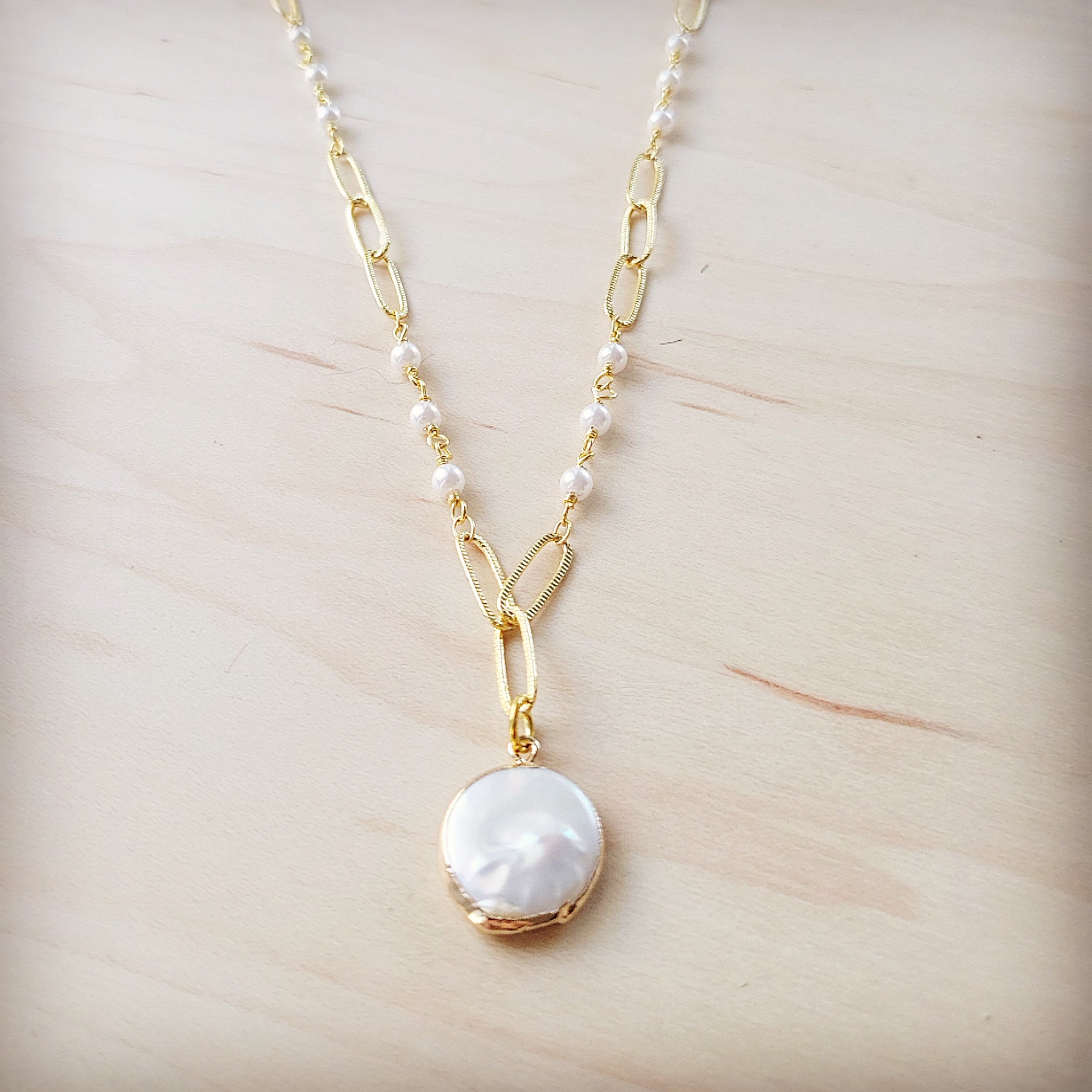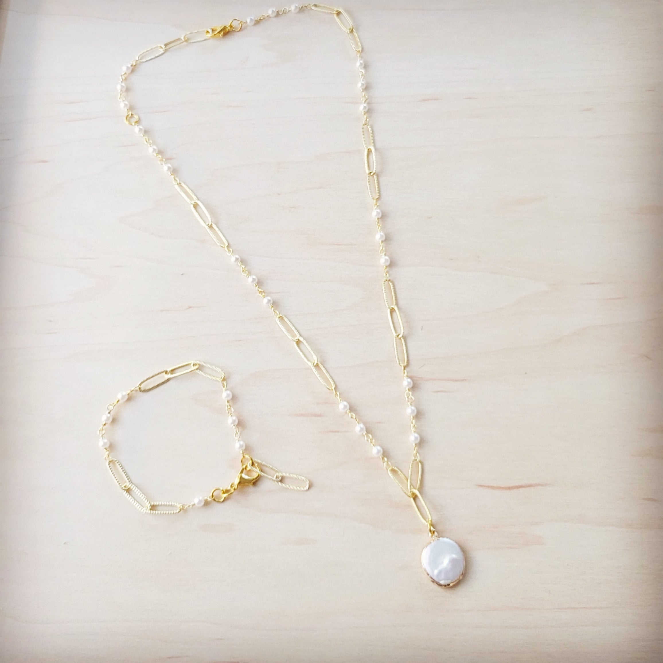 This exquisite set is a great combo for any occasion, offering timeless elegance in a modern design. The elegant gold chain features a unique elongated link style, beautifully interspaced with small, luminous white pearls. The necklace showcases a striking, larger, flat coin-shaped pearl pendant for a unique focal point. This comes complete with a matching pearl and gold link bracelet, ensuring a perfectly coordinated and sophisticated look.