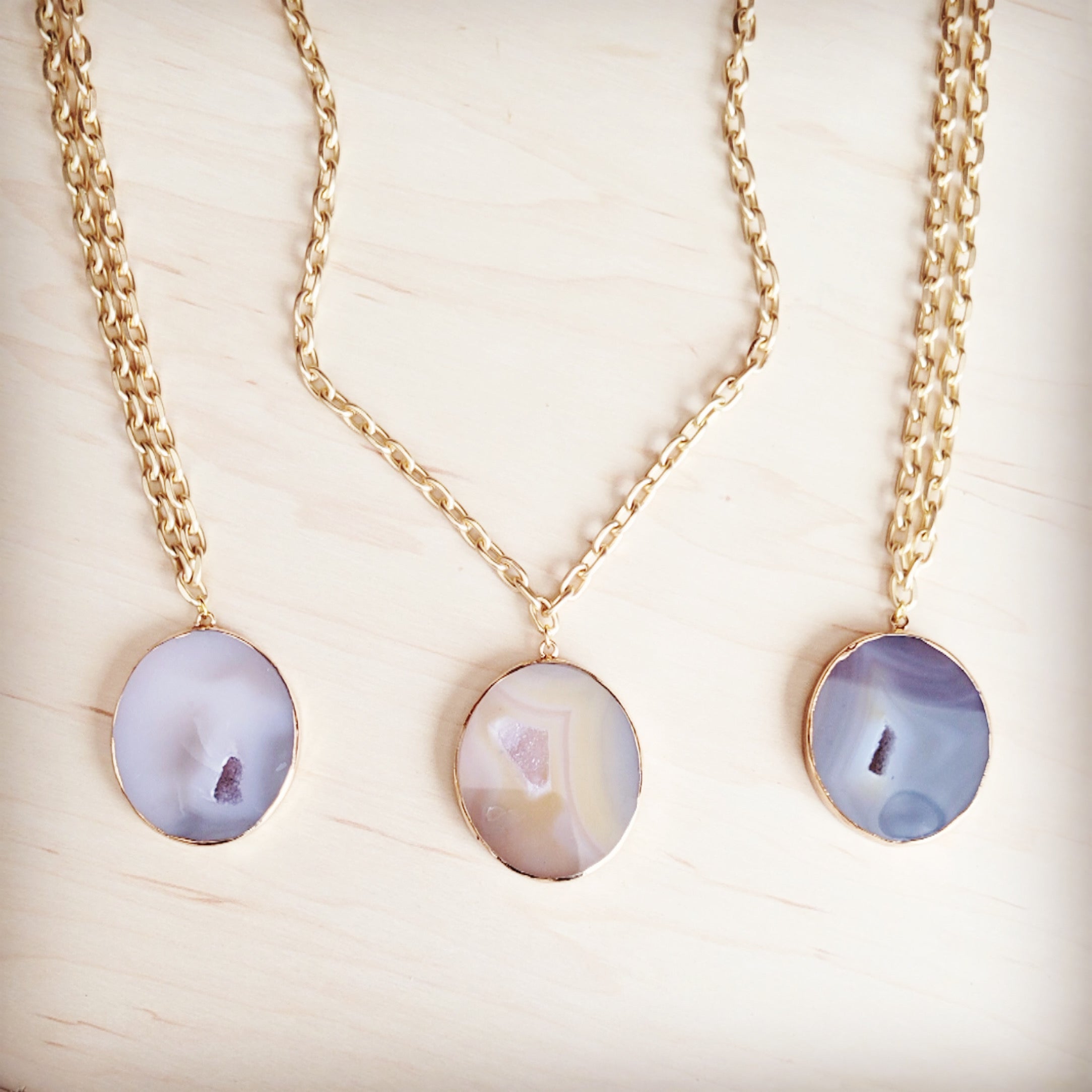 Experience elevated elegance with these stunning boho style gold chain necklaces. Each piece features a unique, polished natural agate slice—showcasing delicate banding and a crystal center—suspended from a sophisticated gold-tone oval link chain. These pieces are the epitome of elegant boho style, offering an effortless touch of natural luxury to any ensemble.
