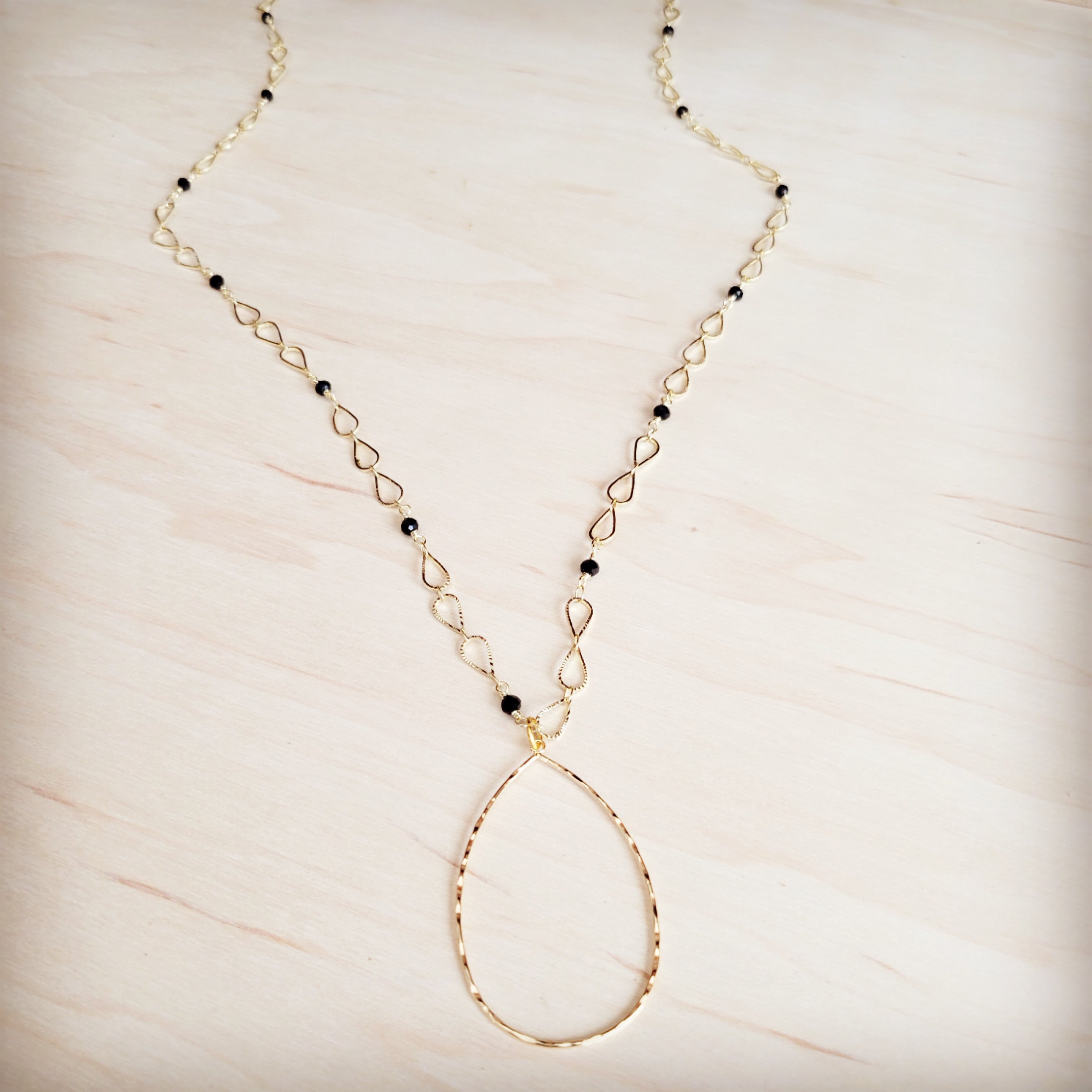 Indulge in the effortless allure of this chic boho style necklace. The long, radiant gold infinity link chain is dotted with delicate black faceted beads, giving it a beautiful, elegant sparkle. This long layering necklace features no clasp closure for seamless styling, making it the perfect sophisticated accessory that enhances every Western style outfit.