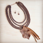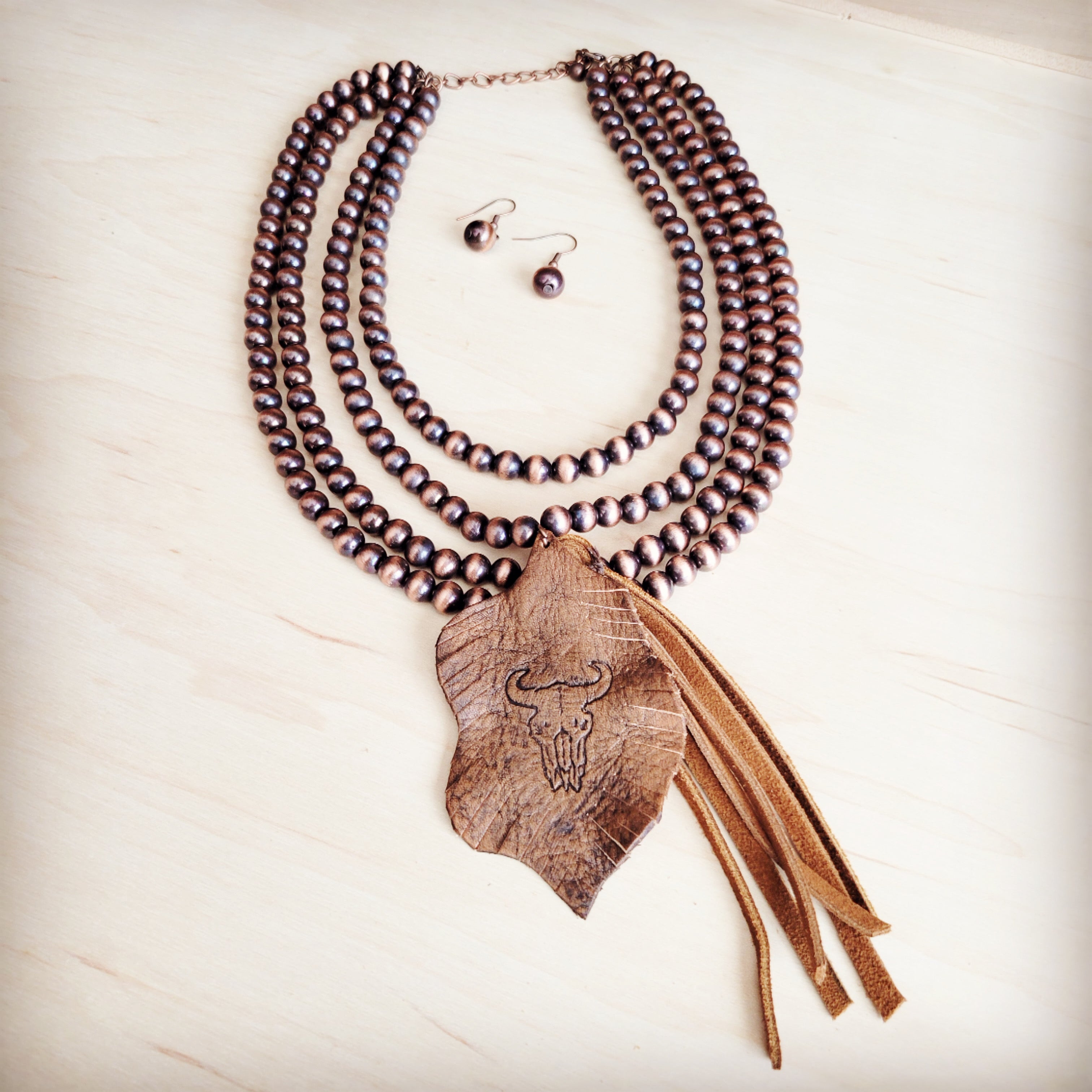 Make an unforgettable entrance with this unique pair item, featuring a multi-strand necklace and matching drop earrings. The necklace boasts three layers of luminous, bronze metallic beads that capture the light with every move. Anchoring the piece is a hand-cut genuine leather pendant with an etched bull skull detail and a coordinating leather tassel, perfectly merging Western grit with effortless chic. This stunning set is the ultimate accessory for all boho styles, offering a rich, dimensional drama you won't find anywhere else.