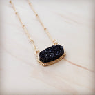 This delicate, short gold-tone chain features small, elegant knots interspersed along its length for refined texture. It is centered by a stunning, oval black stone pendant with a brilliant, shimmering finish. Its sophisticated color contrast and subtle detailing make it a versatile statement piece, effortlessly complementing all outfits for an elevated, chic bohemian style.