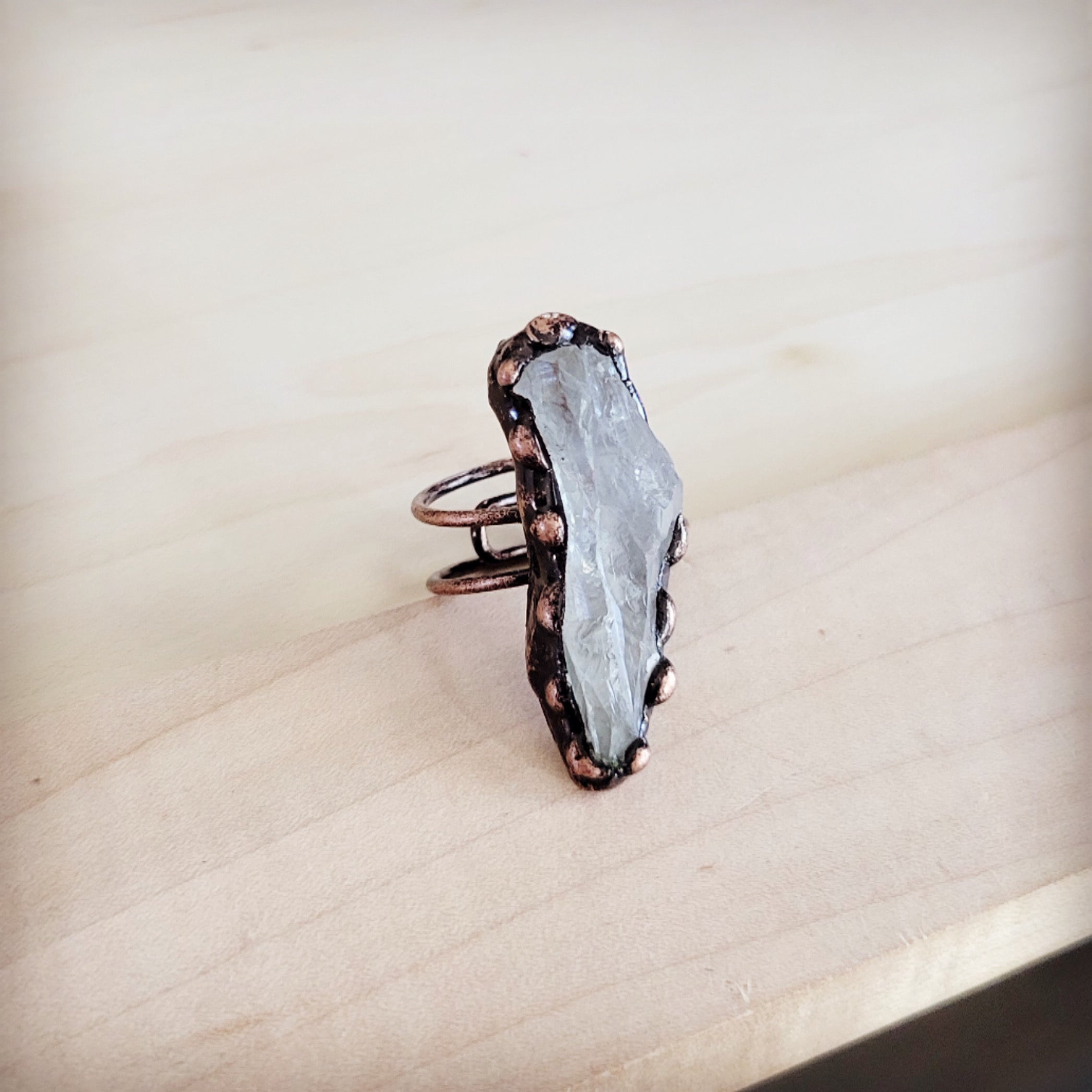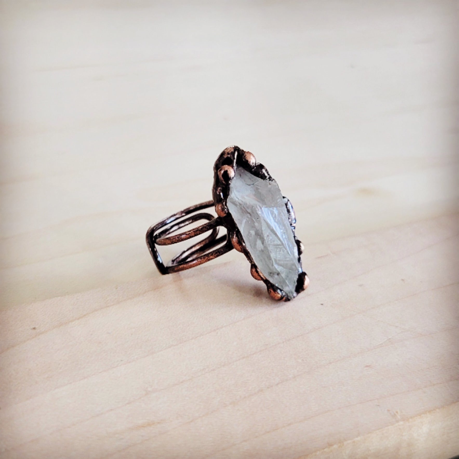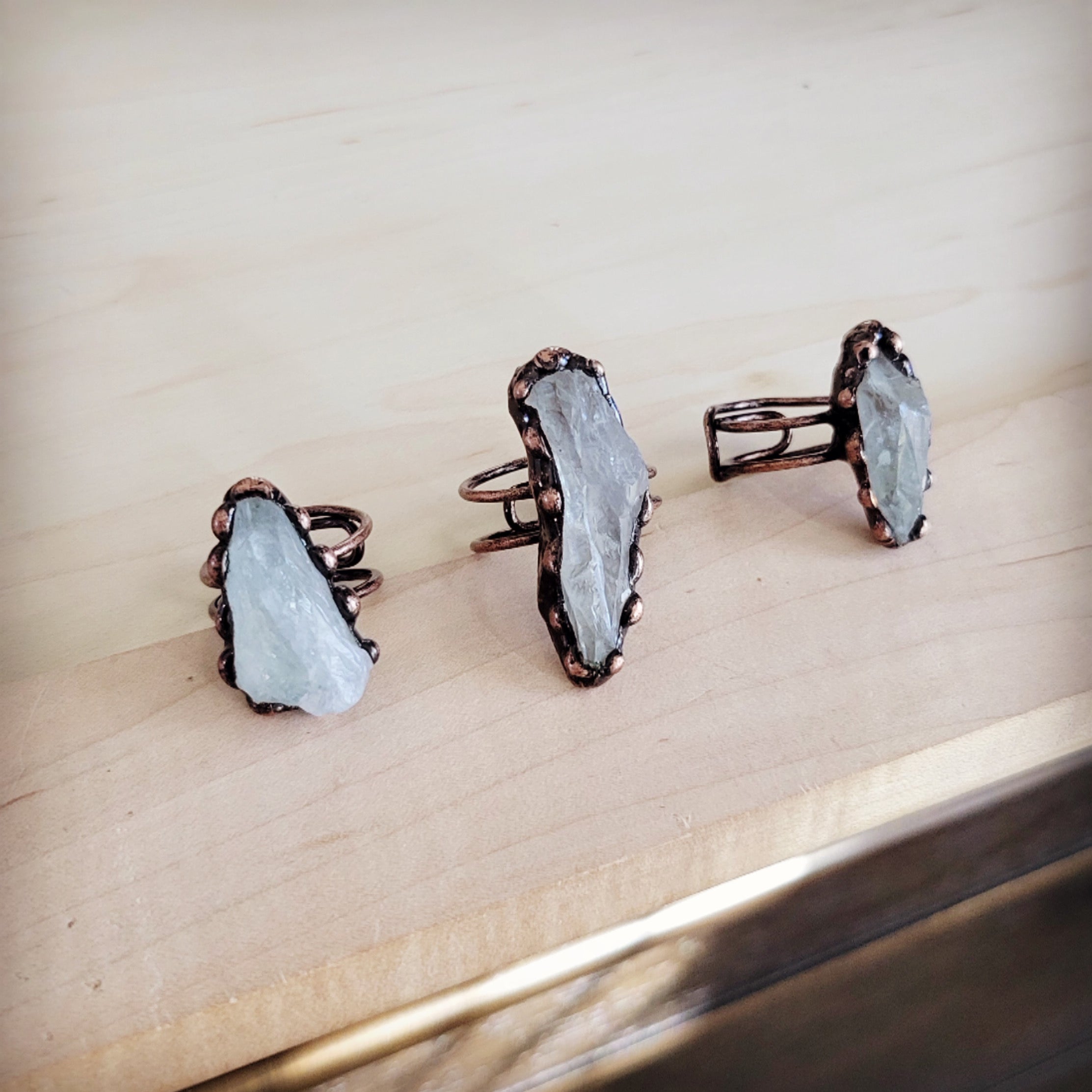 These adjustable copper cuff rings showcase a collection of uniquely formed, raw crystal blades, each radiating a subtle, ethereal light. The elongated, elegant stones are securely and artfully embraced by a hand-worked copper setting, creating a striking, organic statement piece where the raw beauty of the crystal is the center of attention.