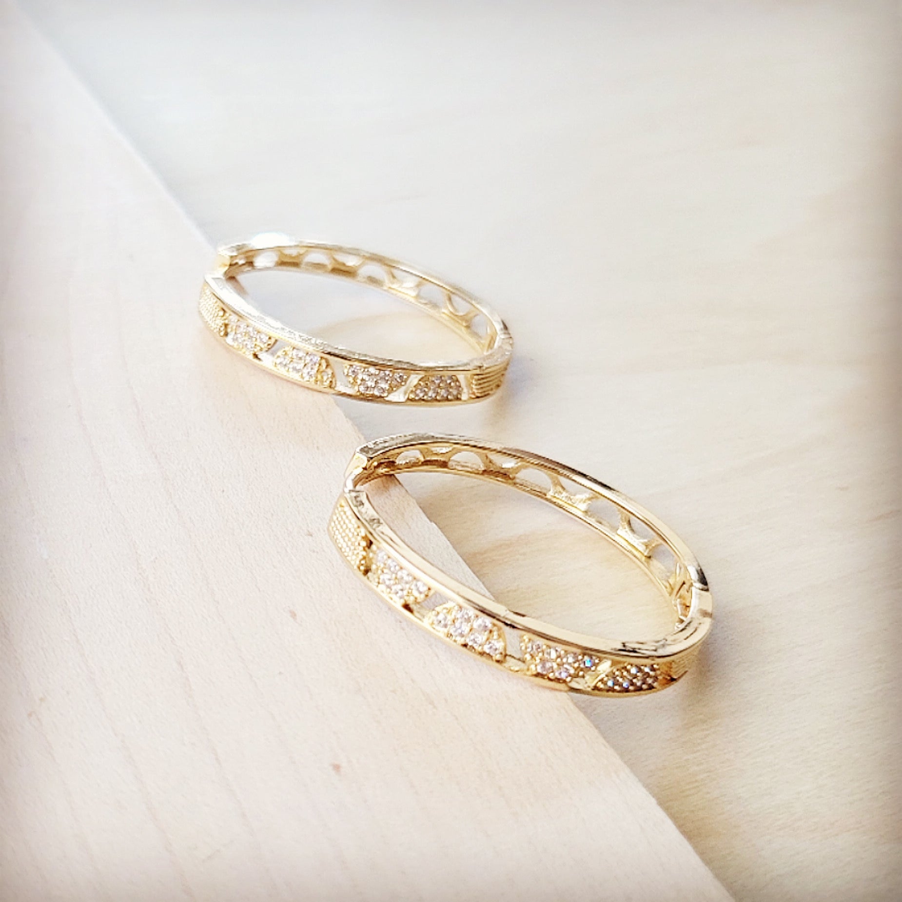 These exquisite gold-tone hoop earrings feature a wide, open-work design, meticulously detailed with bands of sparkling pave-set cubic zirconia that catch the light brilliantly. The inner circumference is defined by polished gold ridges, adding texture and depth. Their substantial size and dazzling stone work create a look of undeniable luxury and elegance.