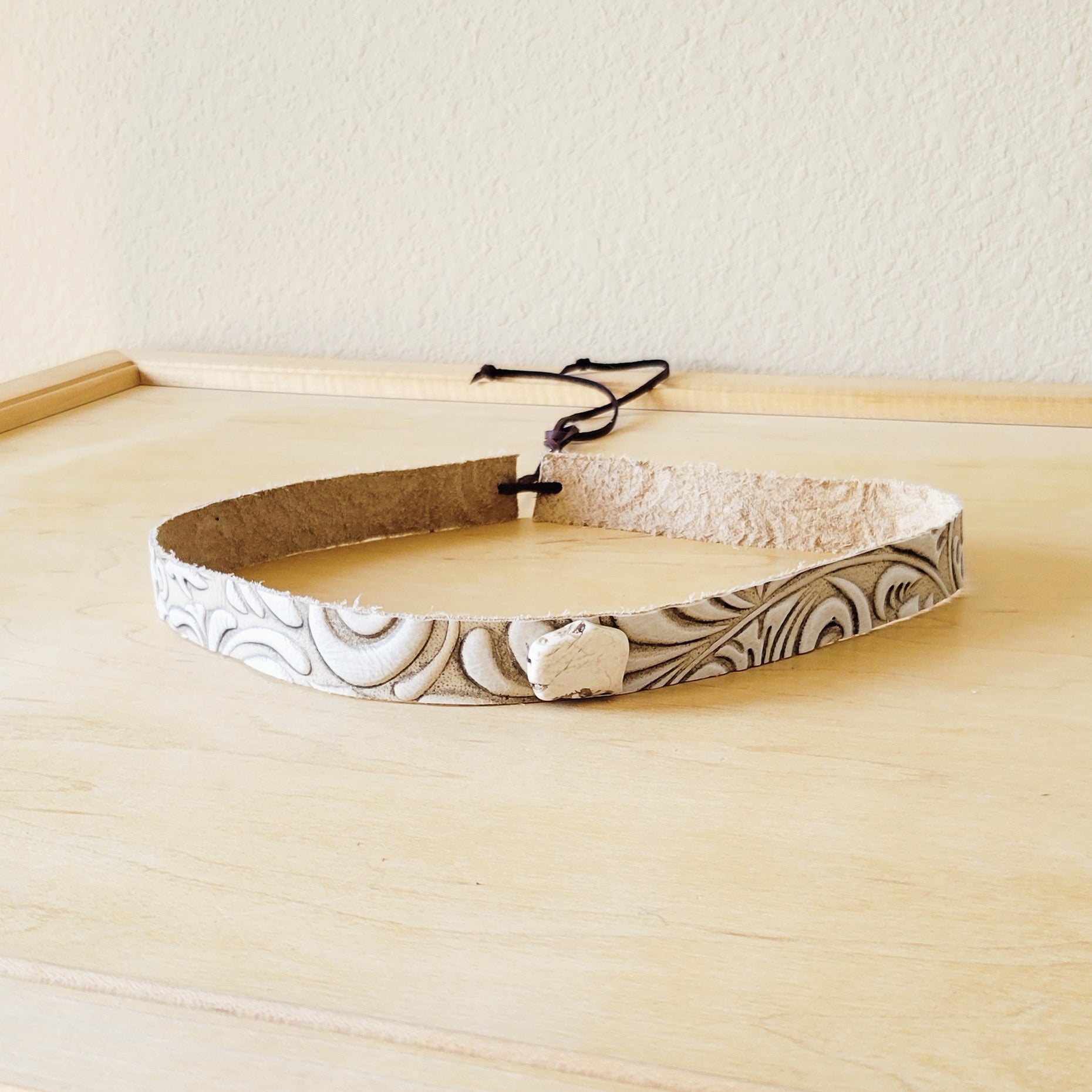 **Sandy White Floral Embossed Leather Hat Band w/ Turquoise Slab 951b