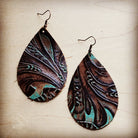 **Leather Teardrop Earrings in Turquoise Brown Floral 203d