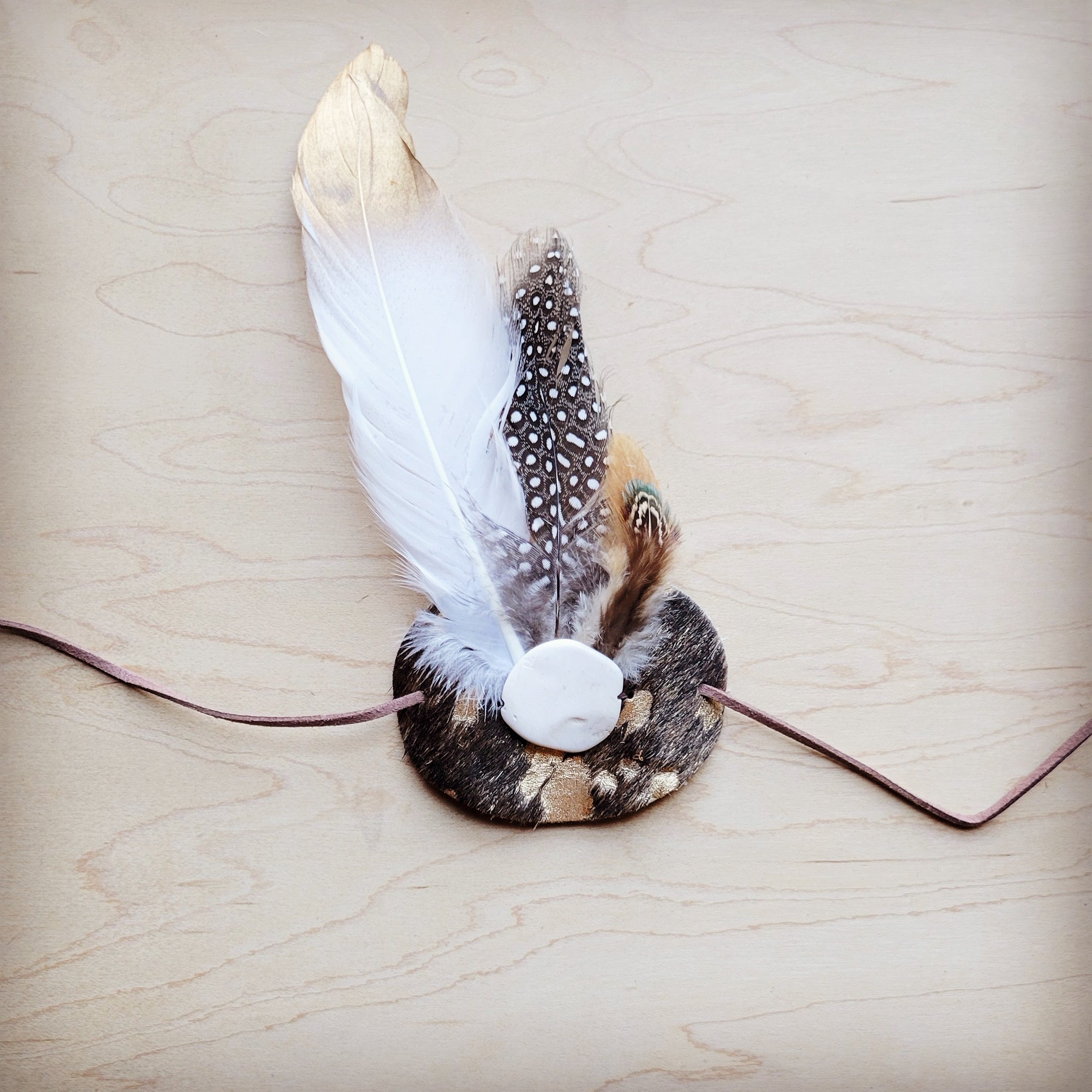 - *Please note, smaller feathers will be assorted and will match as closely to the photo as possible, but will not be identical. The primary piece of turquoise (color) and base leather piece will not change.