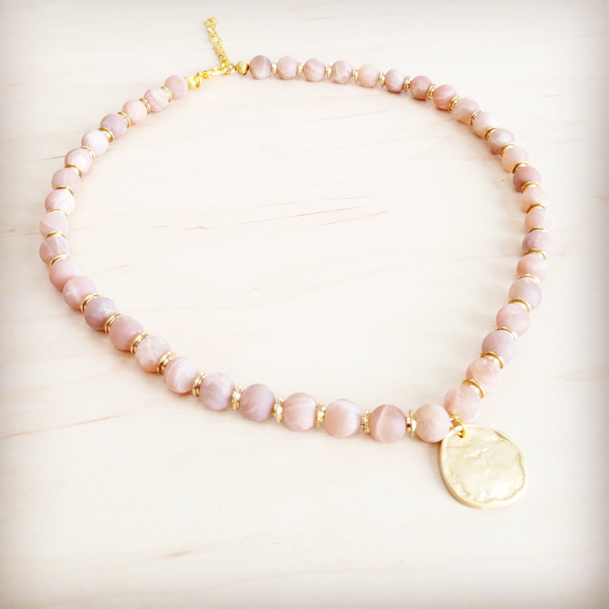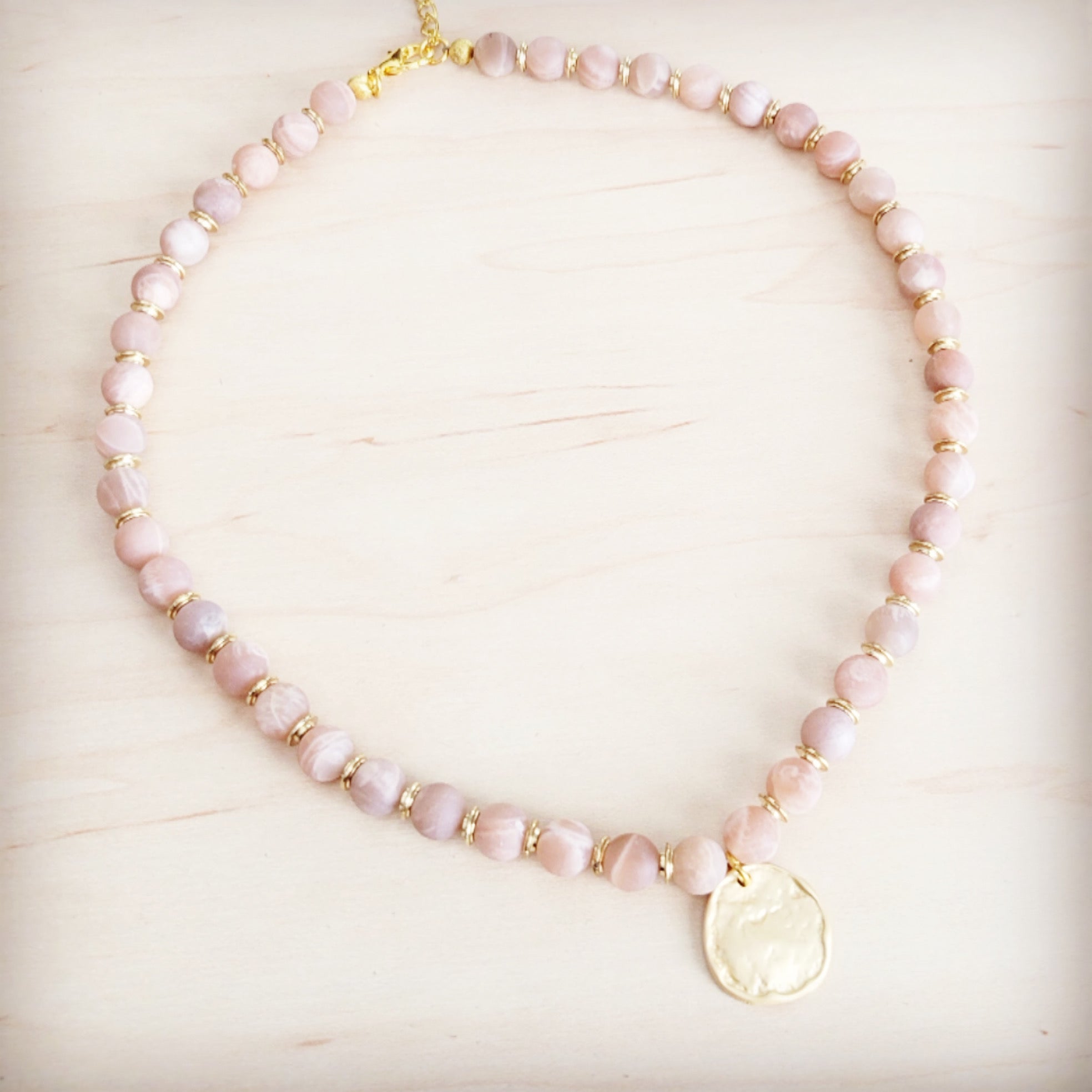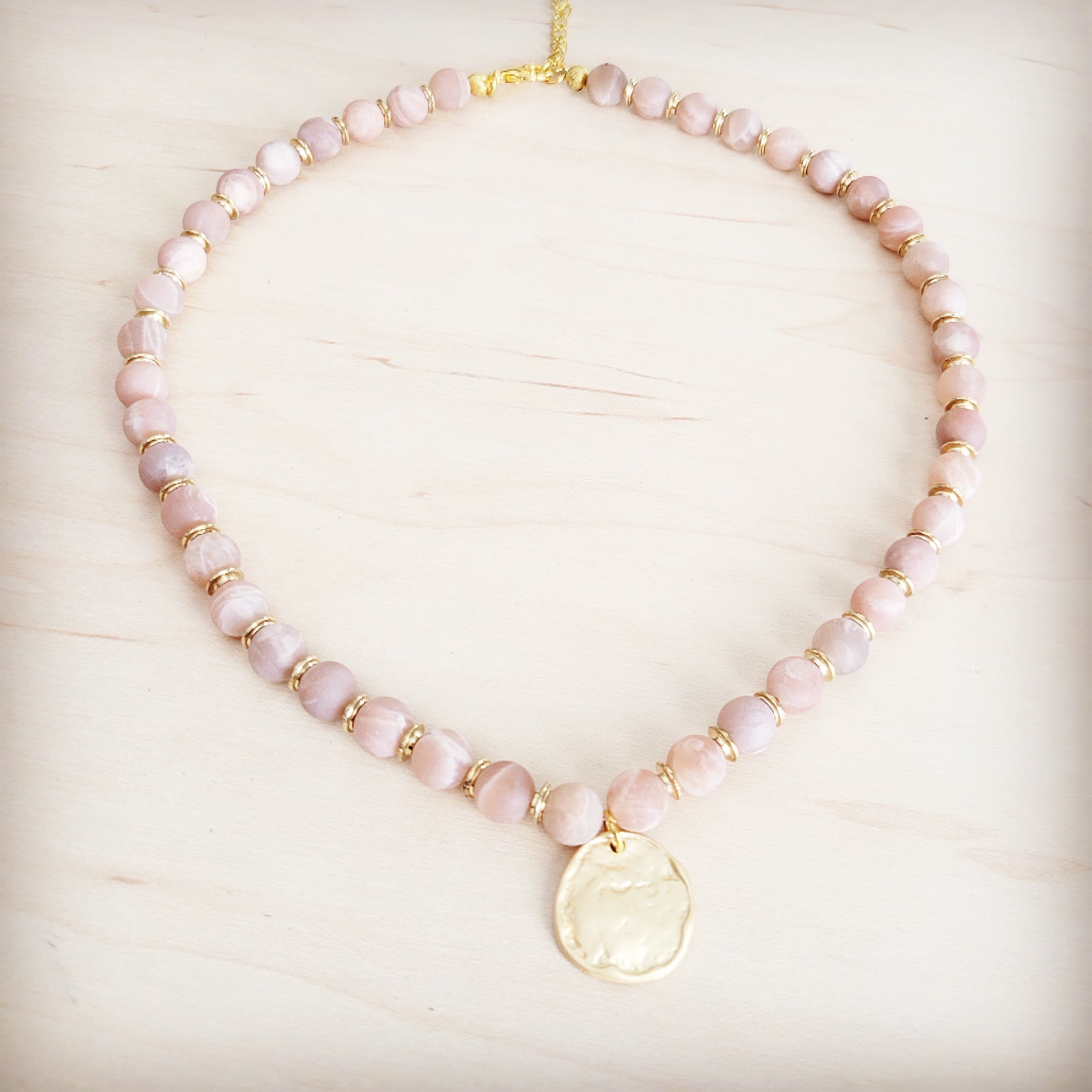 Frosted Sunstone Beaded Collar Necklace w/ Matte Gold Pendant 262n