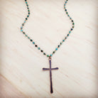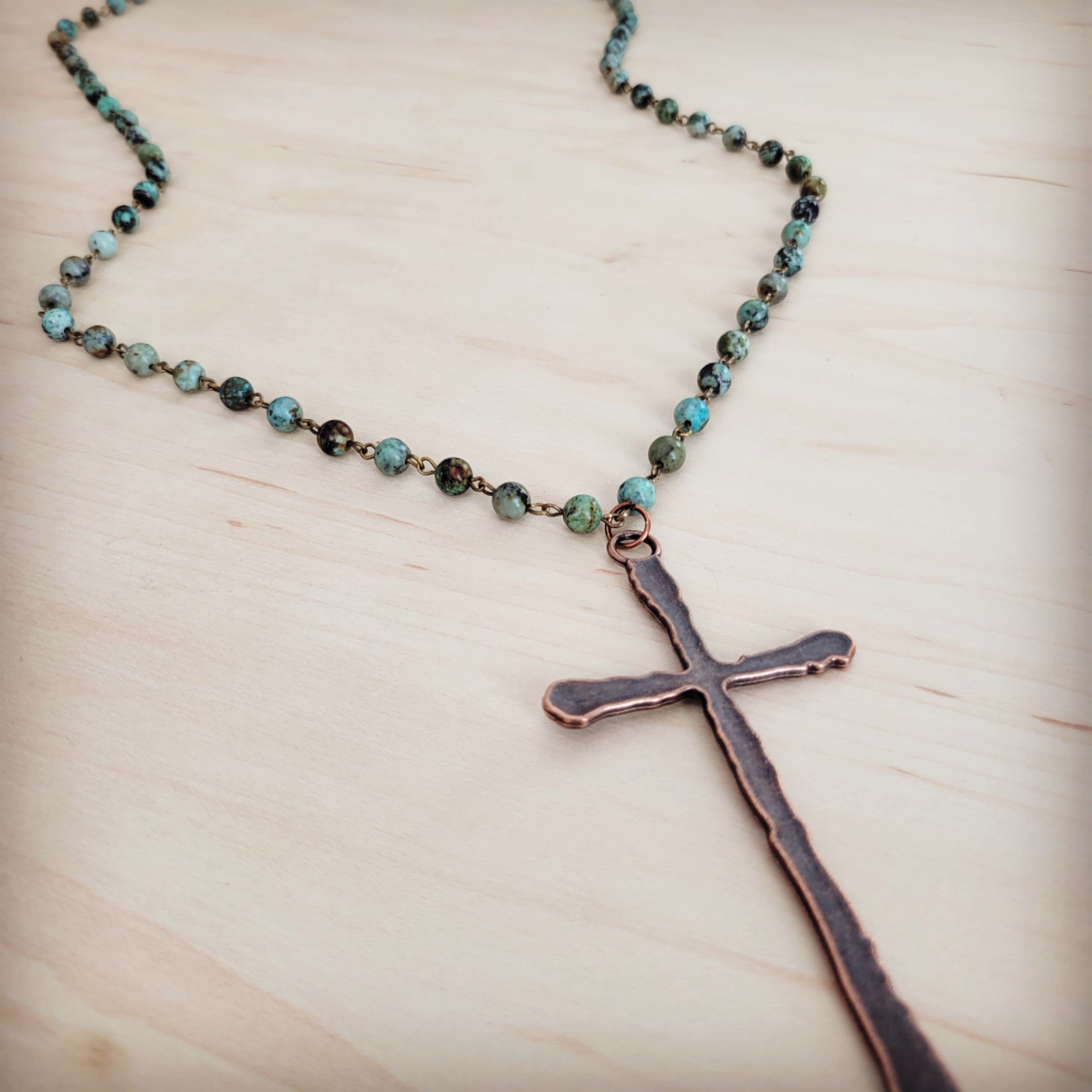 Genuine African Turquoise Long Beaded Necklace with Antique Copper Cross 262y