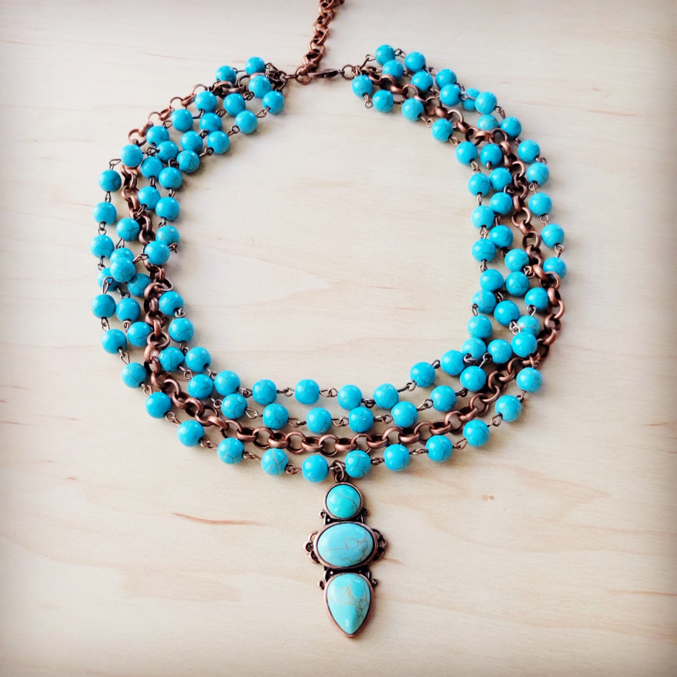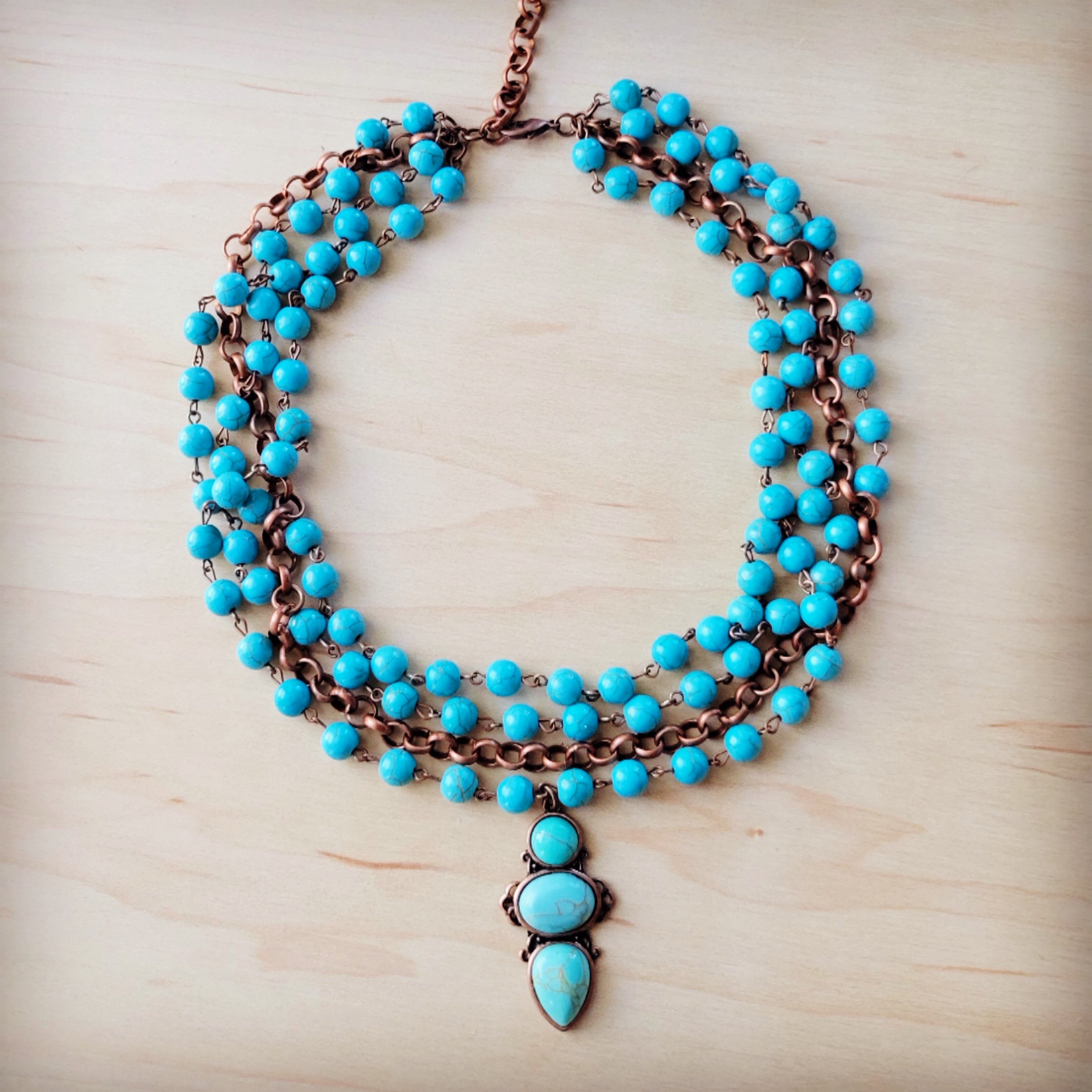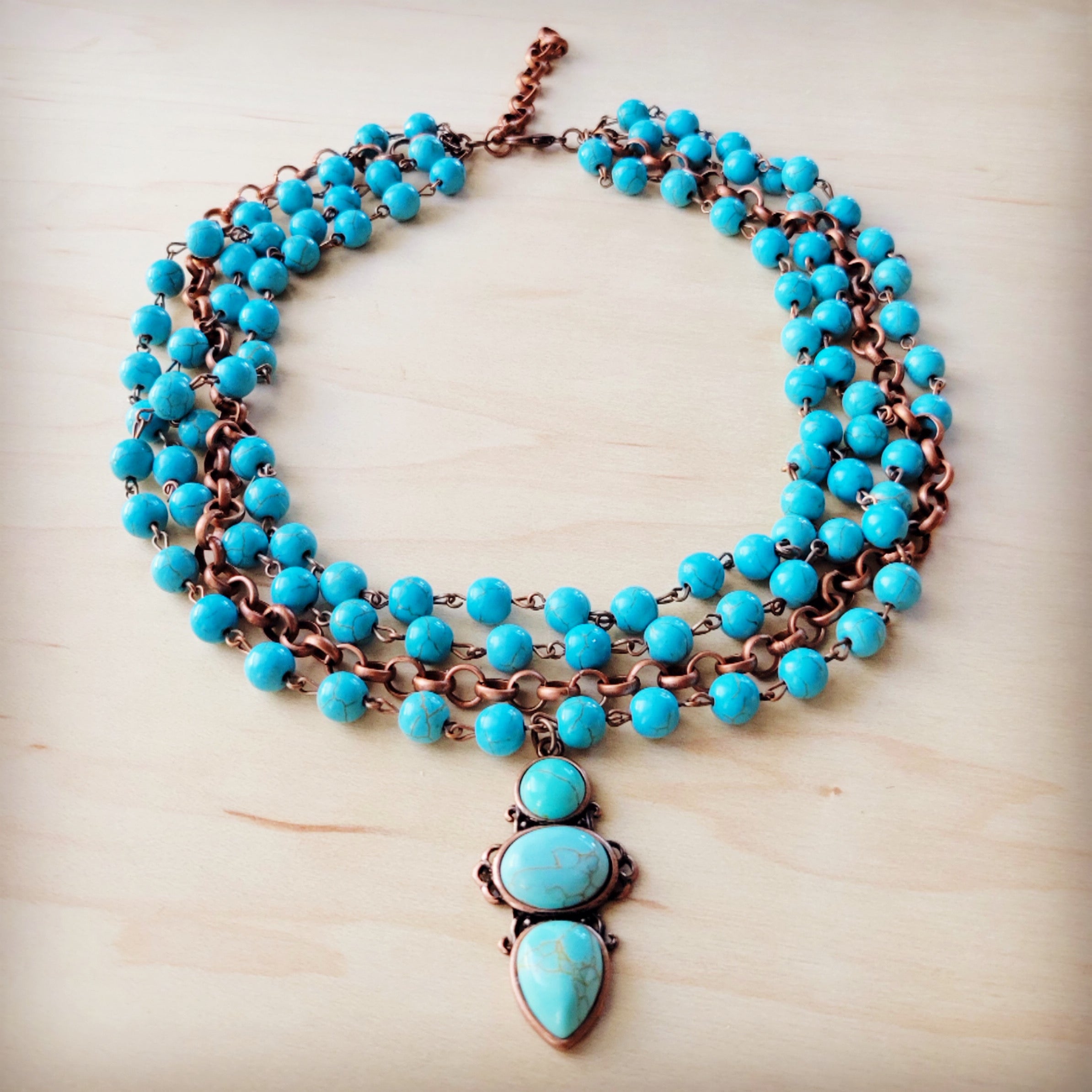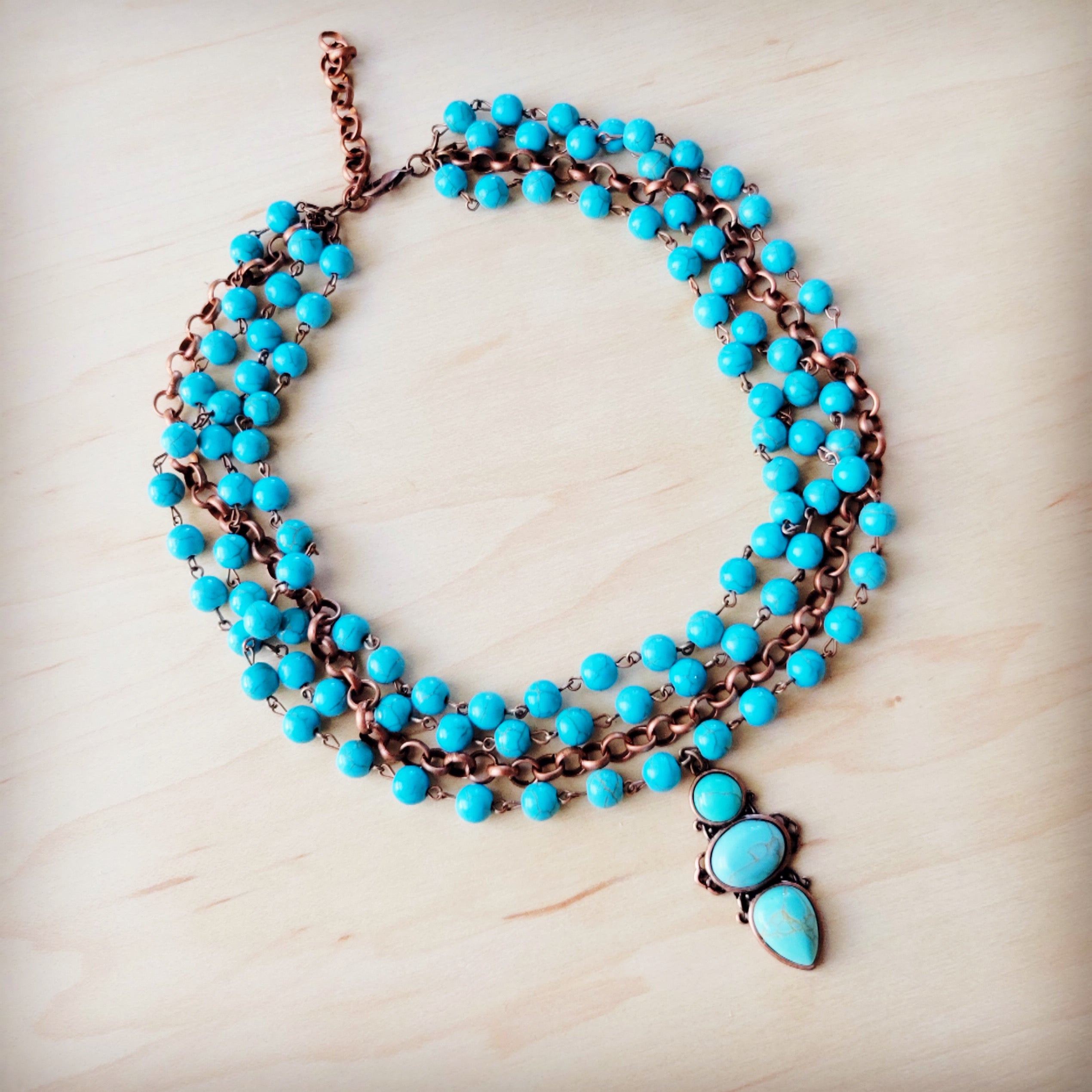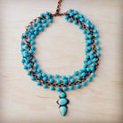 Triple Strand Turquoise & Copper Collar Necklace w/ Droplet Pendant 257lm