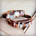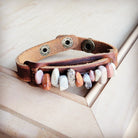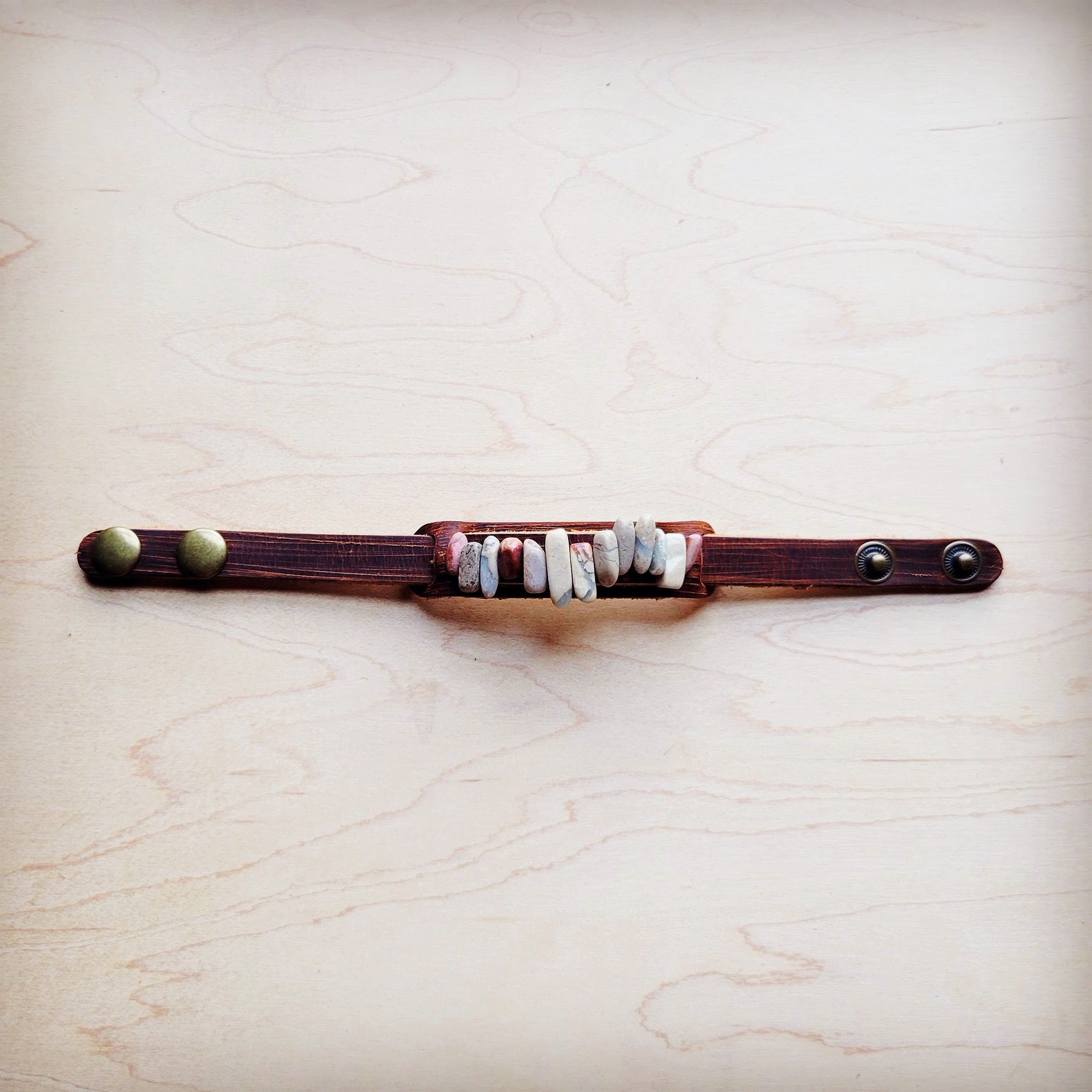 Handcrafted with genuine leather, this boho cuff adds a touch of style to any outfit. Adorned with striking aqua terra stones, it brings a unique and elegant flair to your look. Elevate your fashion game with this Dusty Leather Narrow Cuff.