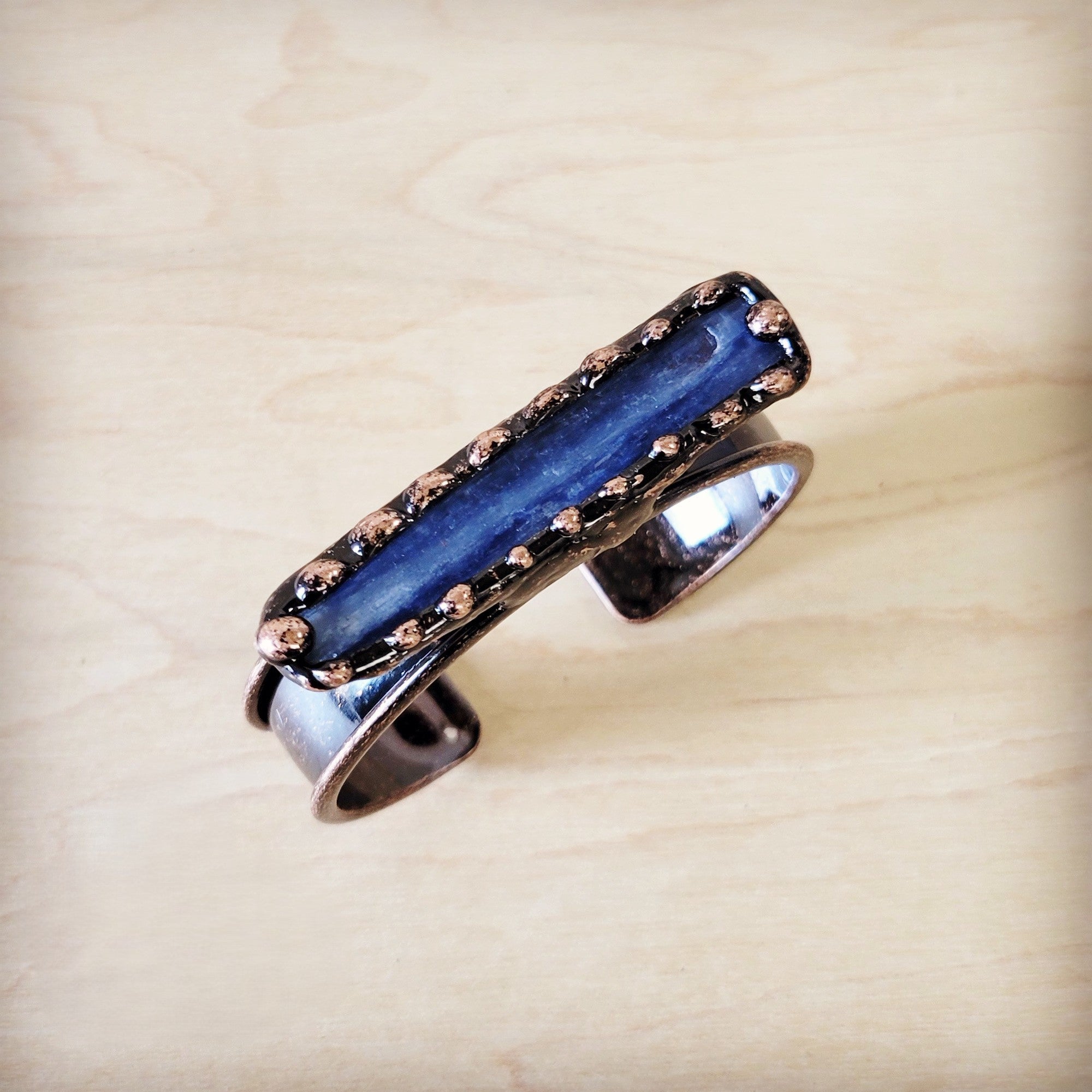 Expertly crafted in genuine natural Kyanite, this cuff bracelet features a boho western style that is perfect for stacking. With its unique design and high-quality materials, this bracelet adds a touch of effortless style to any outfit. Elevate your look with this must-have accessory.