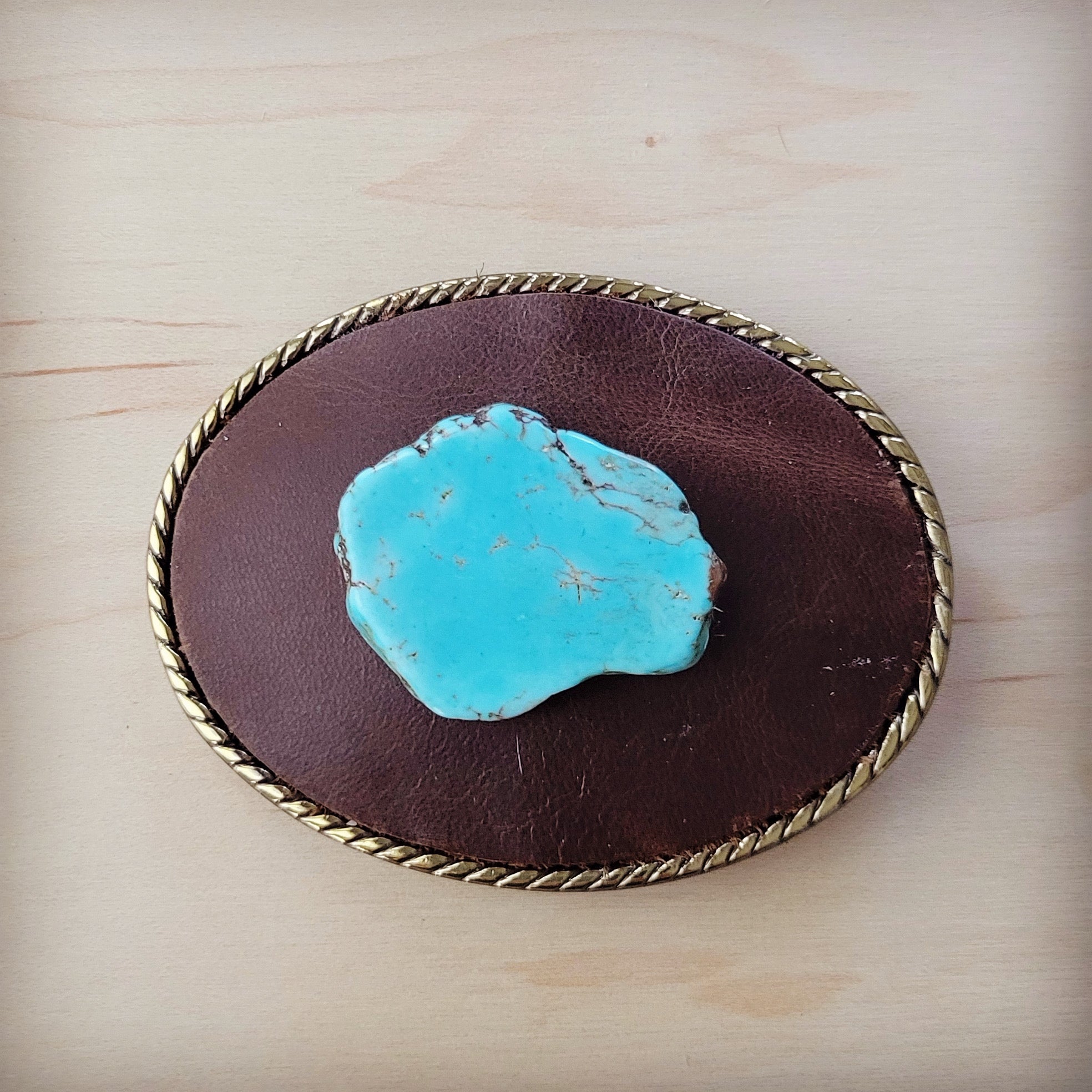 Rope Edge Brown Leather Belt Buckle w/ Blue Turquoise 907x