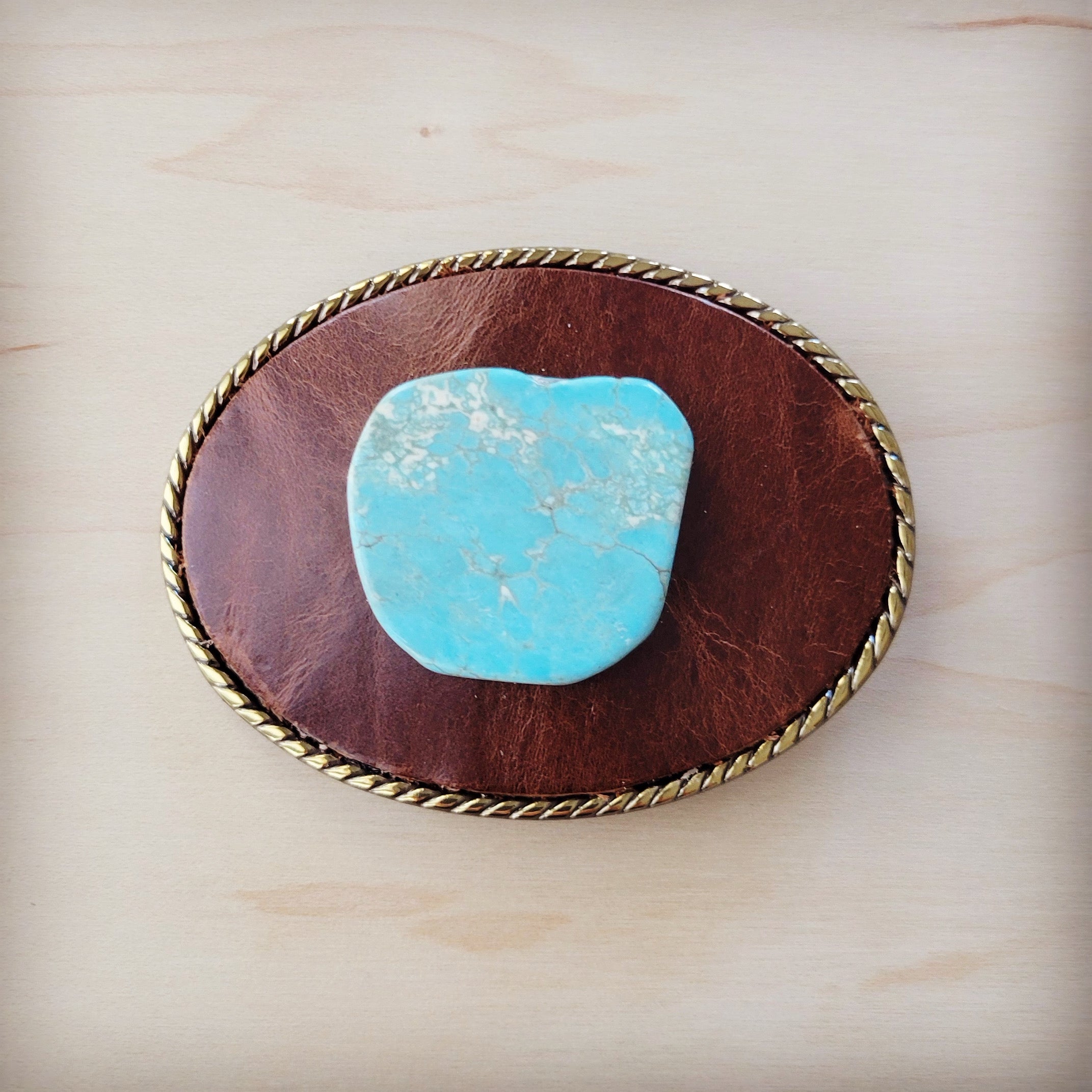 Rope Edge Light Brown Leather Belt Buckle w/ Blue Turquoise 907n