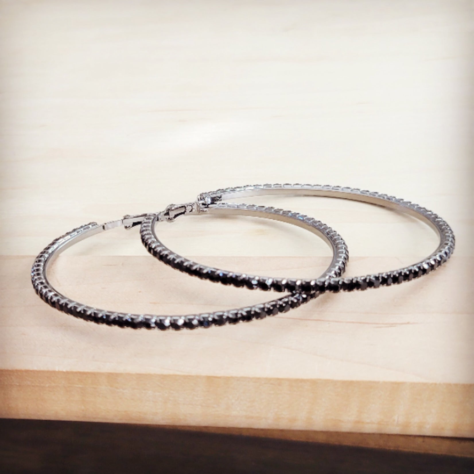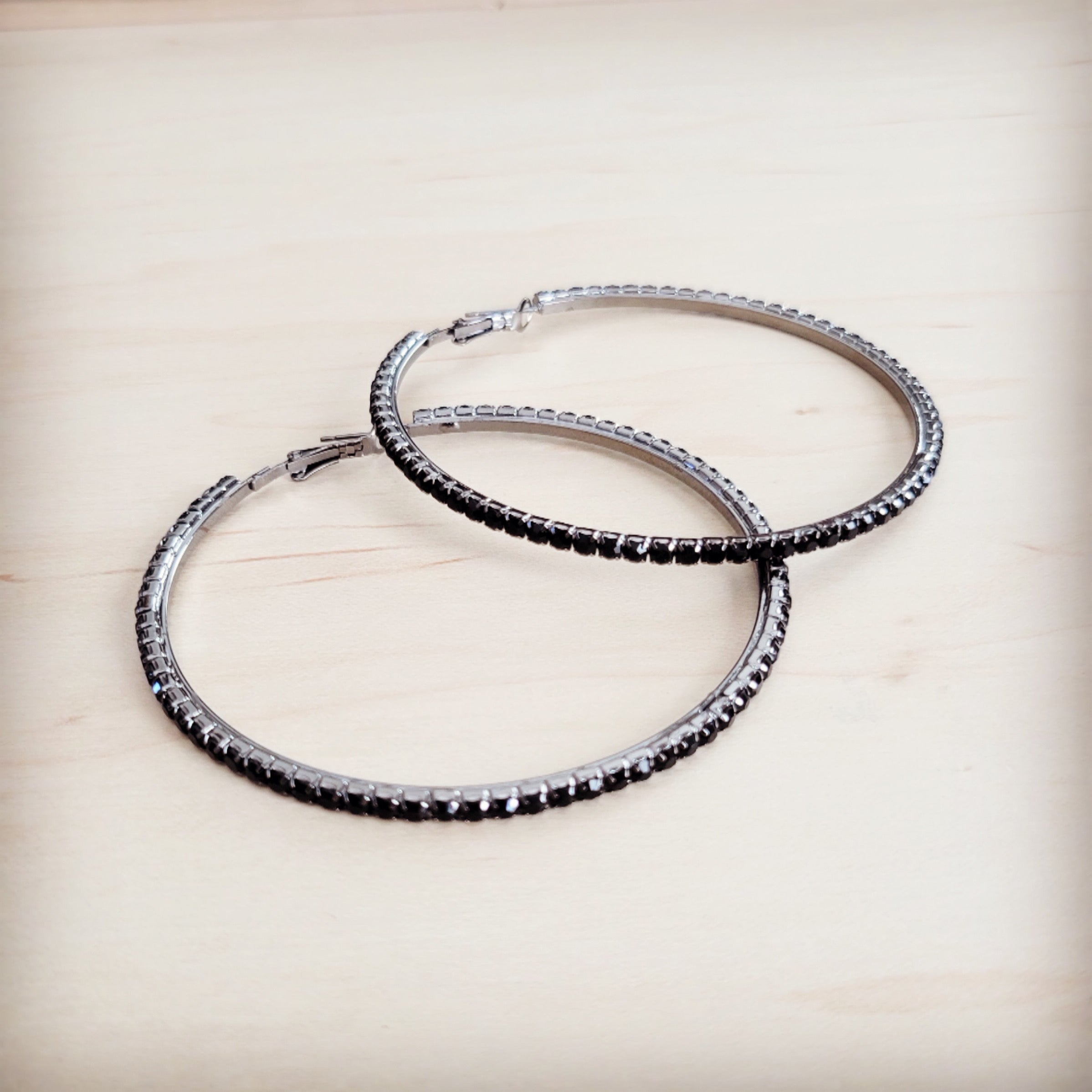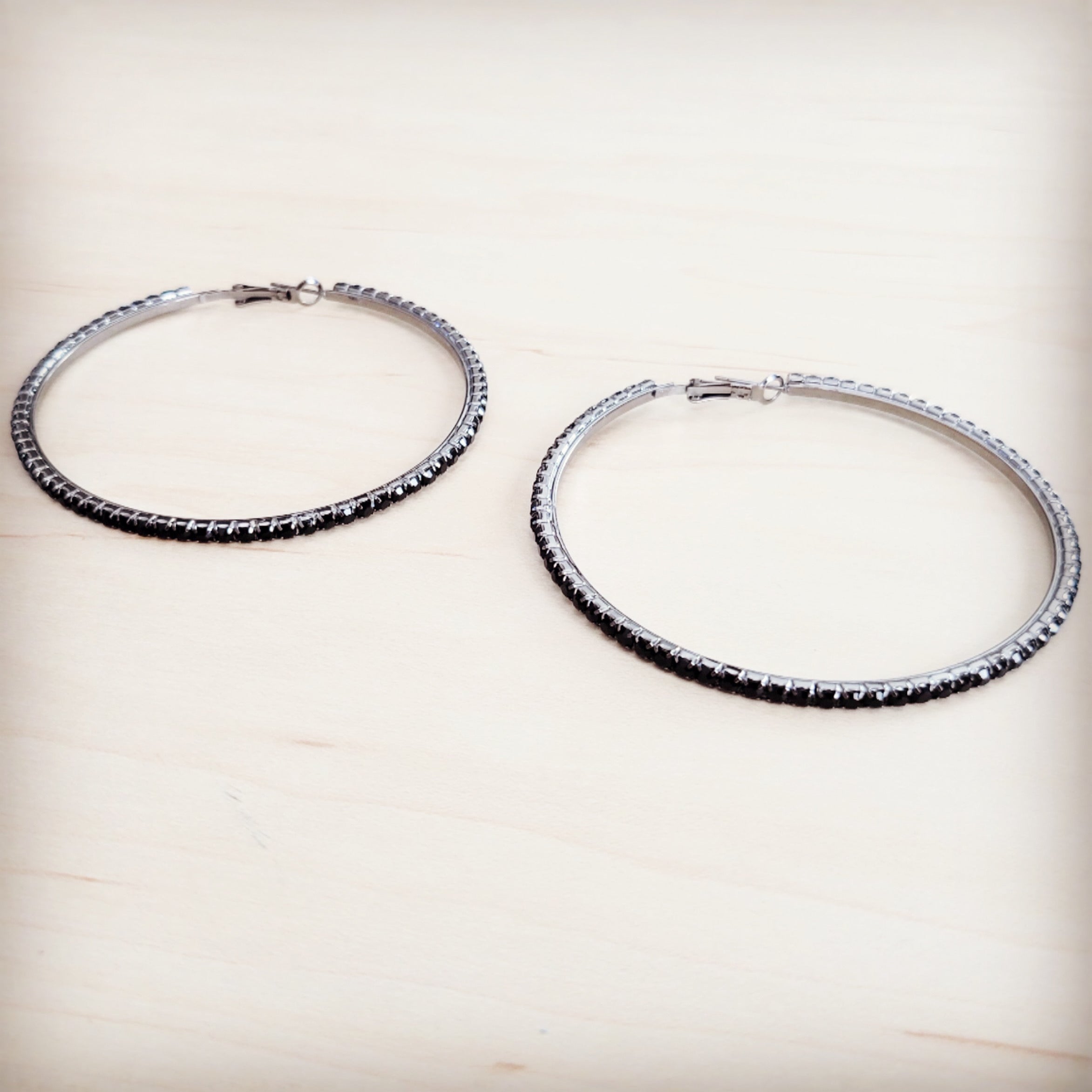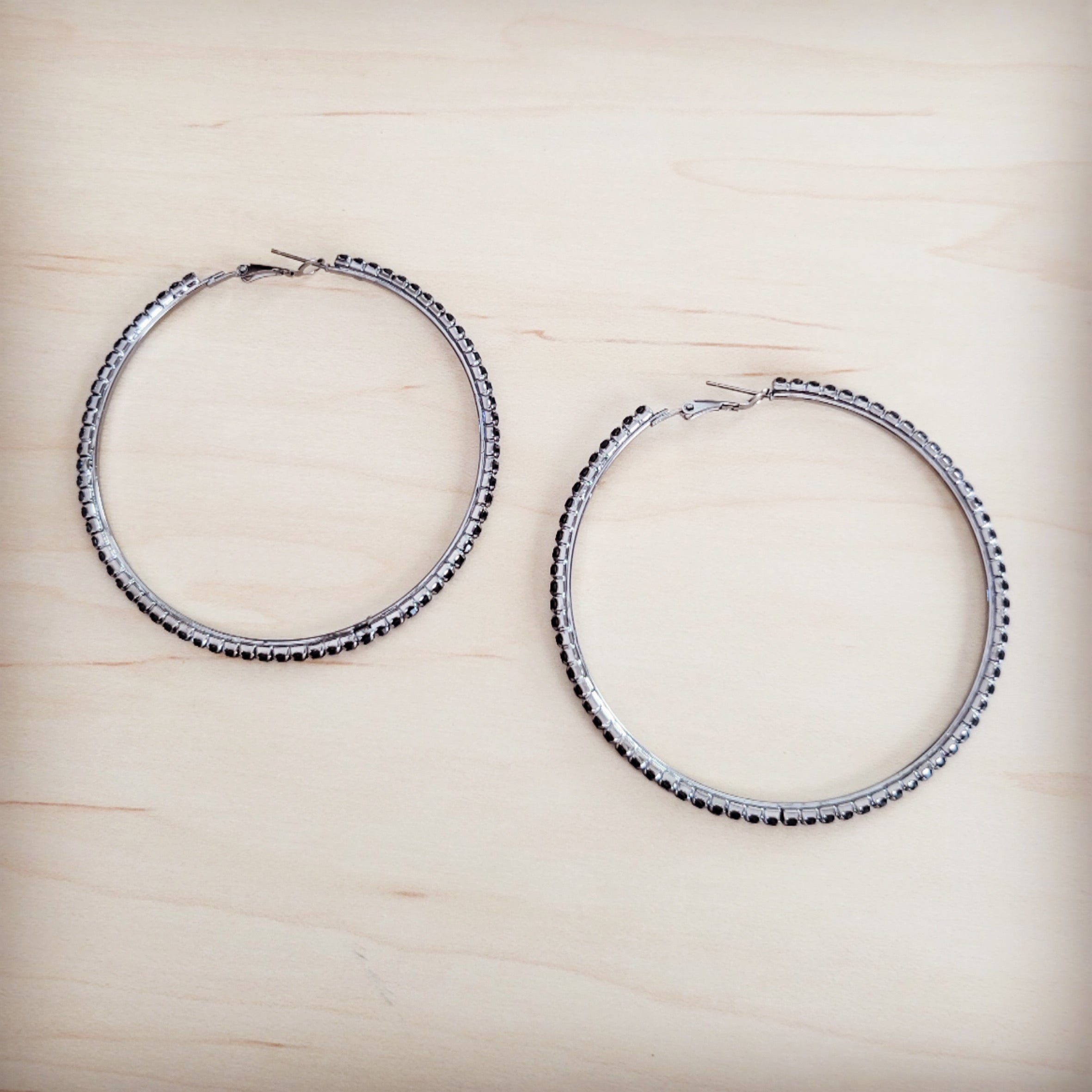 These striking earrings feature an elegant, large hoop silhouette in a polished silver-tone metal. The outer edge of the hoop is meticulously embellished with a pave setting of small, dark black onyx crystal stones, creating a continuous line of dramatic sparkle that is both chic and refined.