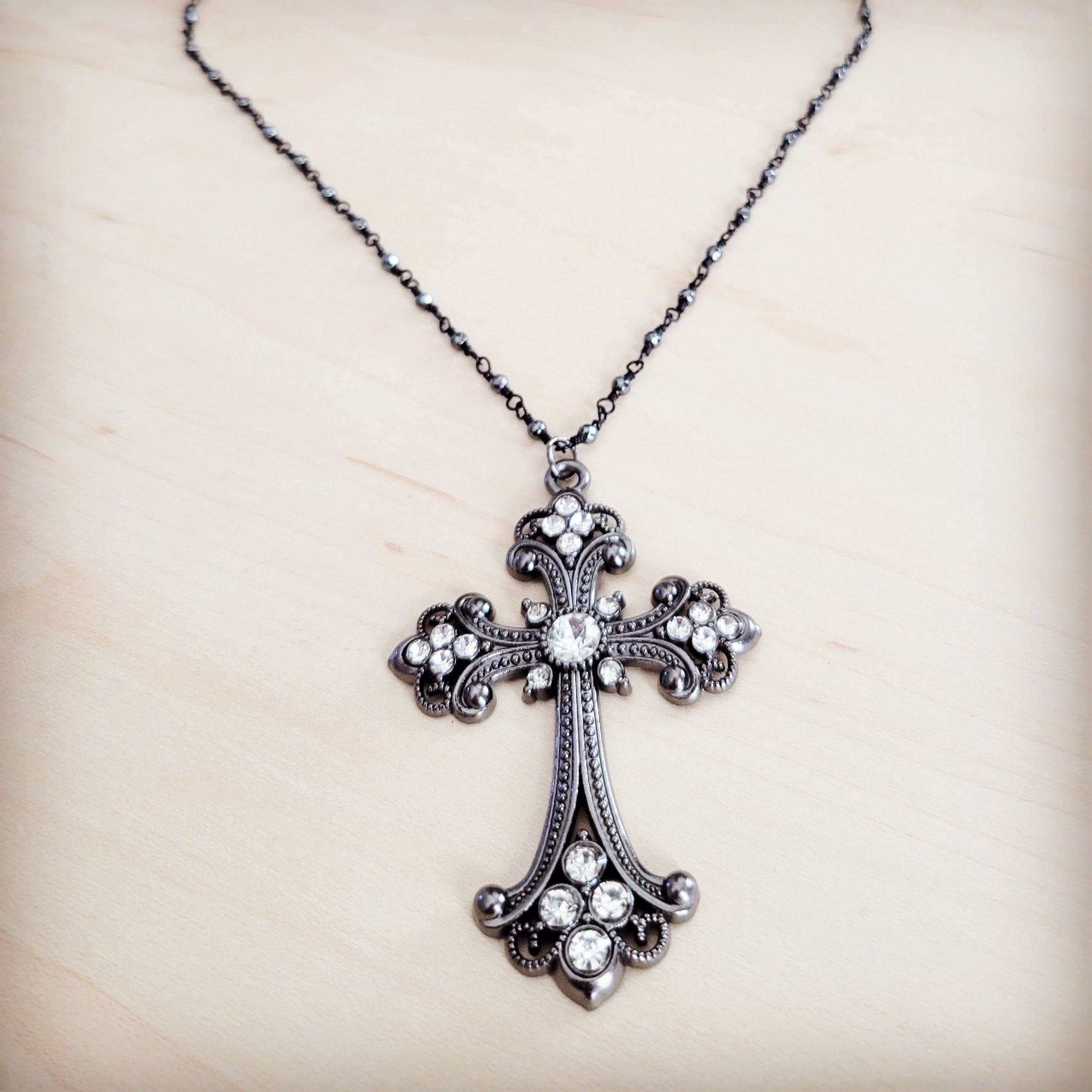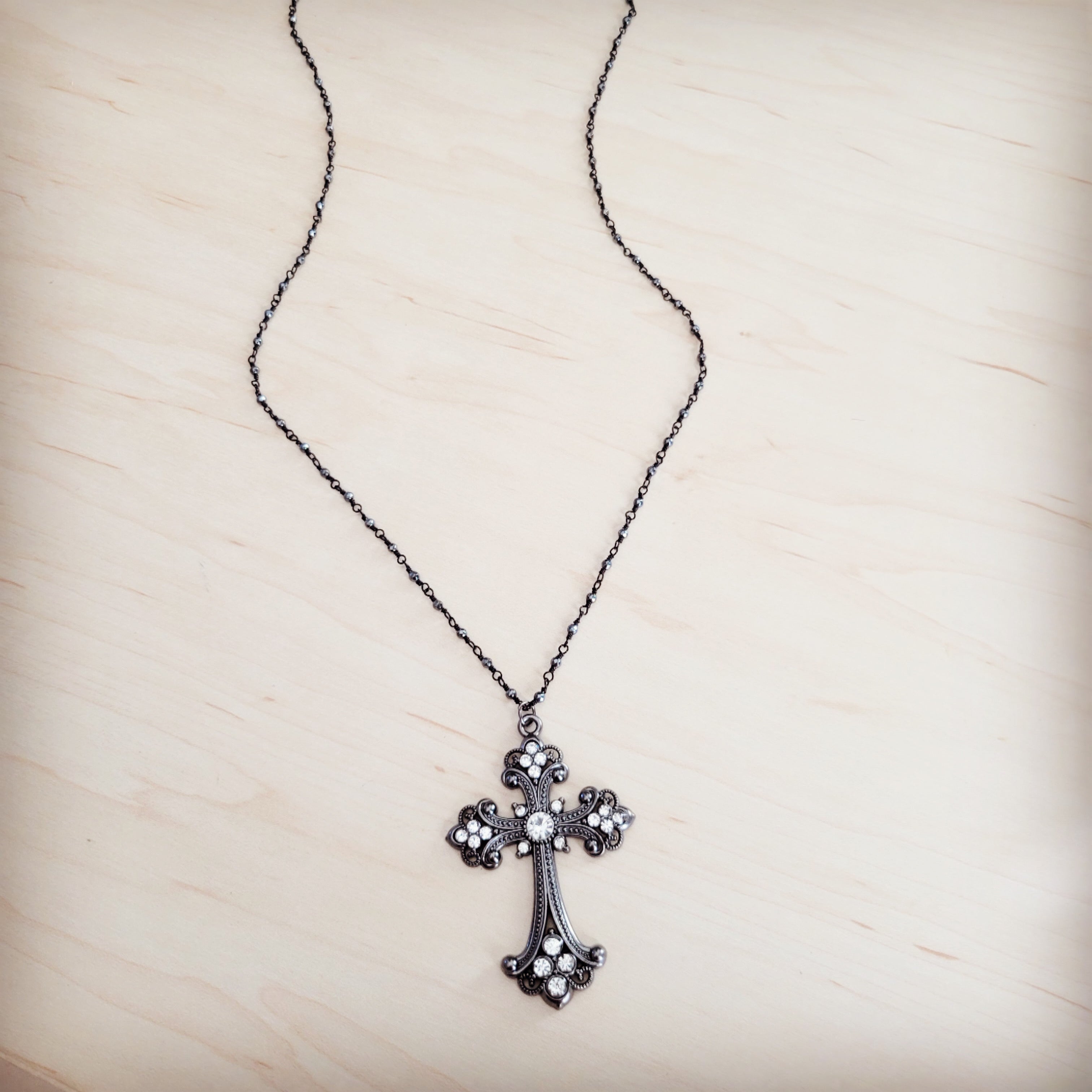 This striking long necklace offers a sophisticated blend of Victorian elegance and modern chic. The focal point is a large, ornate Filigree Cross pendant crafted in an antique gunmetal or oxidized silver-tone metal. It is meticulously adorned with numerous sparkling clear crystal stones, including a large central stone and clustered stones at the tips of the cross arms, providing brilliant contrast and depth. The pendant is suspended from a long, delicate blackened or gunmetal-tone chain composed of small, faceted metal beads, enhancing the dark, dramatic aesthetic.