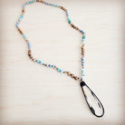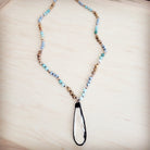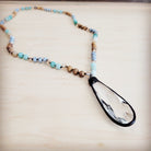 This striking, long necklace features a beautiful mix of variegated amazonite and jasper beads. It is perfectly anchored by a unique, long crystal pendant. The natural beauty and elegant length of this piece make it a uniquely sophisticated and essential accessory for a chic, bohemian style.